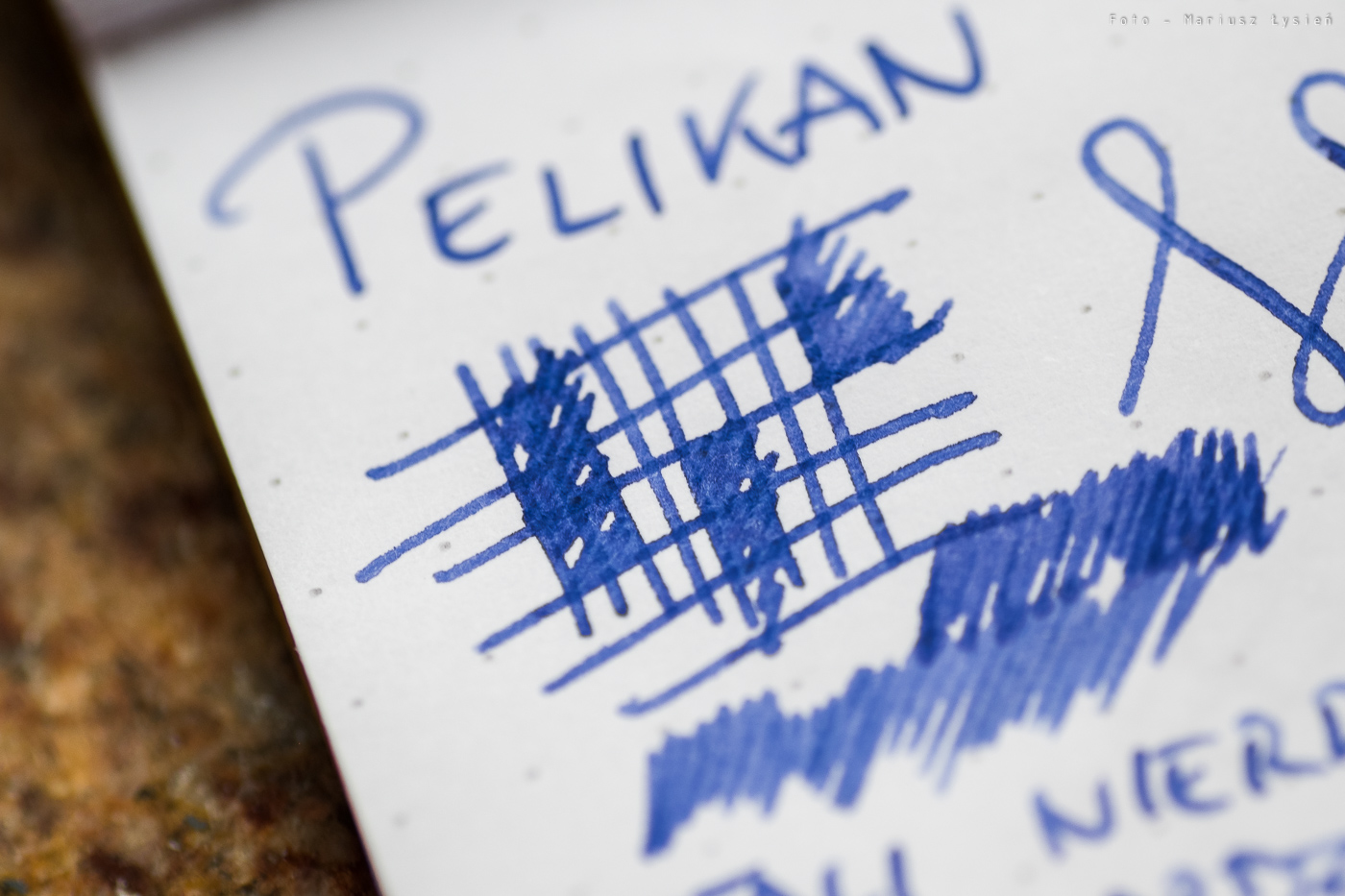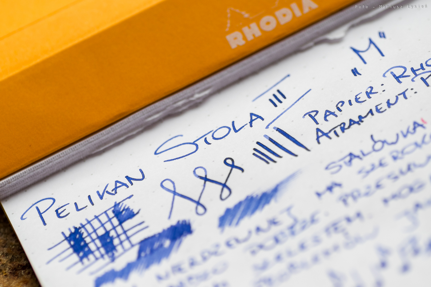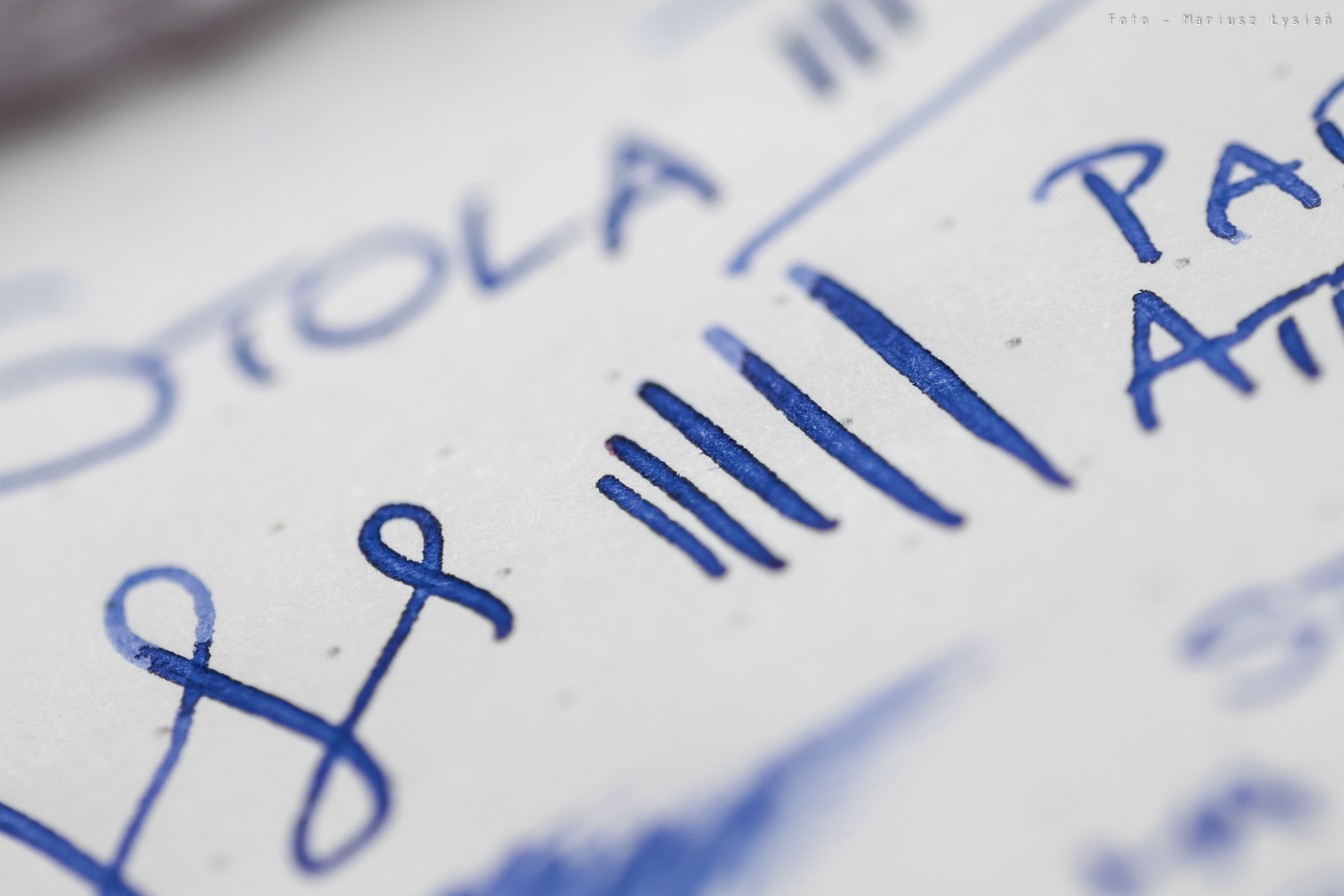 Pióro przetestowałem z dołączonym powiększonym nabojem zawierającym atrament w kolorze niebieskim (Pelikan Royal Blue) na papierach Rhodia DotPad oraz Clairefontaine Fifty-Fifty (szkicownik formatu A4). Na pierwszym z papierów zachowanie jest co całkiem dobre. Stalówka sunie po papierze z lekkim szelestem. Wymaga ona użycia niewielkiej siły docisku. W każdym bądź razie kreska jest równa, a pióro pisze od przytknięcia do powierzchni papieru. Na szkicowniku Clairefontaine, który jest papierem dla wielu piór trudnym, pióro Stola III zaskoczyła mnie i to bardzo. Pisze na nim doskonale – nawet lepiej niż po Rhodii. Stalówka sunie miękko po papierze wydającym się być dosyć chropowatym i twardym. Szkicowanie i pisanie tym piórem w Fifty-Fifty to przyjemność. Kreska jest ładnie nasycona, ale pióro nie jest przesadnie „mokre”. Atrament jest podawany w stopniu, który zasługuje na określenie „umiarkowanie mokry”, dzięki czemu tekst wysycha relatywnie szybko. Z uwagi na zastosowany materiał, z którego wykonano stalówkę, nie oferuje ona praktycznie żadnej możliwości wpływania na szerokość linii wraz ze zmianą siły docisku pióra do powierzchni papieru.