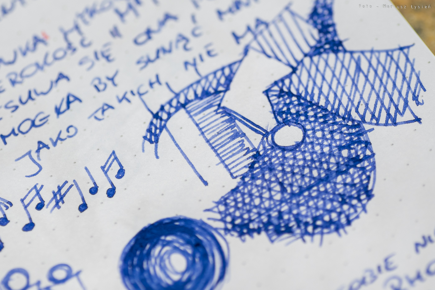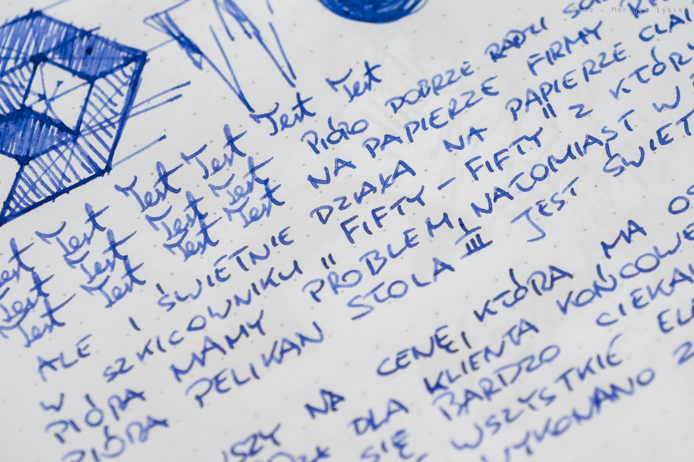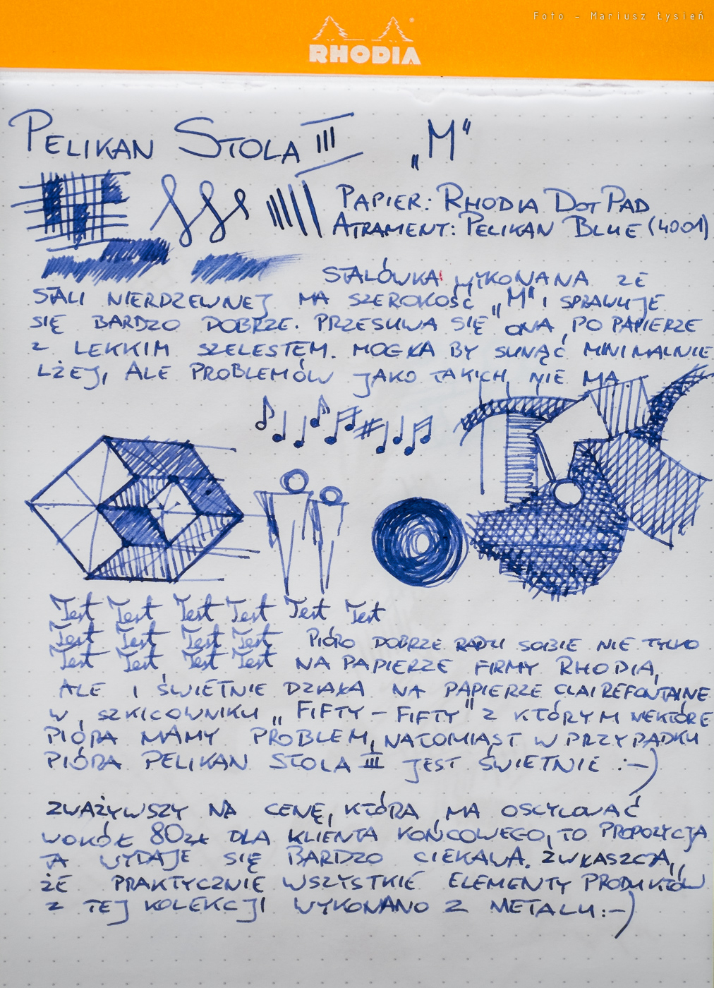 Pióro przetestowałem z dołączonym powiększonym nabojem zawierającym atrament w kolorze niebieskim (Pelikan Royal Blue) na papierach Rhodia DotPad oraz Clairefontaine Fifty-Fifty (szkicownik formatu A4). Na pierwszym z papierów zachowanie jest co całkiem dobre. Stalówka sunie po papierze z lekkim szelestem. Wymaga ona użycia niewielkiej siły docisku. W każdym bądź razie kreska jest równa, a pióro pisze od przytknięcia do powierzchni papieru. Na szkicowniku Clairefontaine, który jest papierem dla wielu piór trudnym, pióro Stola III zaskoczyła mnie i to bardzo. Pisze na nim doskonale – nawet lepiej niż po Rhodii. Stalówka sunie miękko po papierze wydającym się być dosyć chropowatym i twardym. Szkicowanie i pisanie tym piórem w Fifty-Fifty to przyjemność. Kreska jest ładnie nasycona, ale pióro nie jest przesadnie „mokre”. Atrament jest podawany w stopniu, który zasługuje na określenie „umiarkowanie mokry”, dzięki czemu tekst wysycha relatywnie szybko. Z uwagi na zastosowany materiał, z którego wykonano stalówkę, nie oferuje ona praktycznie żadnej możliwości wpływania na szerokość linii wraz ze zmianą siły docisku pióra do powierzchni papieru.