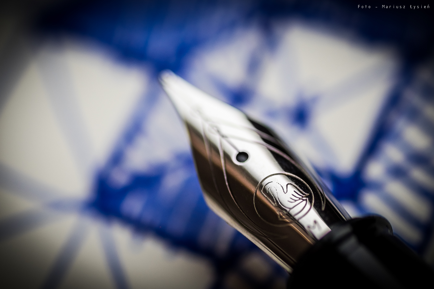 Po zdjęciu skuwki, odnajdziemy sekcję, która również jest z metalu. Oczywiście natrafimy także na wykonaną ze stali nierdzewnej stalówkę, która w przypadku testowanego pióra ma szerokość M. Producent nie wspomina w swoich materiałach na chwilę obecną o dostępności innych szerokości stalówki, jednak niewykluczone, że takowe się pojawią. Wzór, który pokrywa stalówkę jest dosyć delikatny i nienachalny. W skład jego wchodzi oczywiście logo firmy Pelikan oraz oznaczenie szerokości stalówki. Jedyne zastrzeżenie do stalówki, to sposób wykonania logo firmy Pelikan. O ile zewnętrzny pierścień jest dobrze widoczny (podobnie jak pozostałe zdobienia stalówki), to o tyle sam zarys pelikanów jest miejscami zbyt płytki (w przypadku większego pelikana mamy wyraźnie zaznaczone skrzydło oraz niezbyt wyraźną przednią część zwierzęcia).