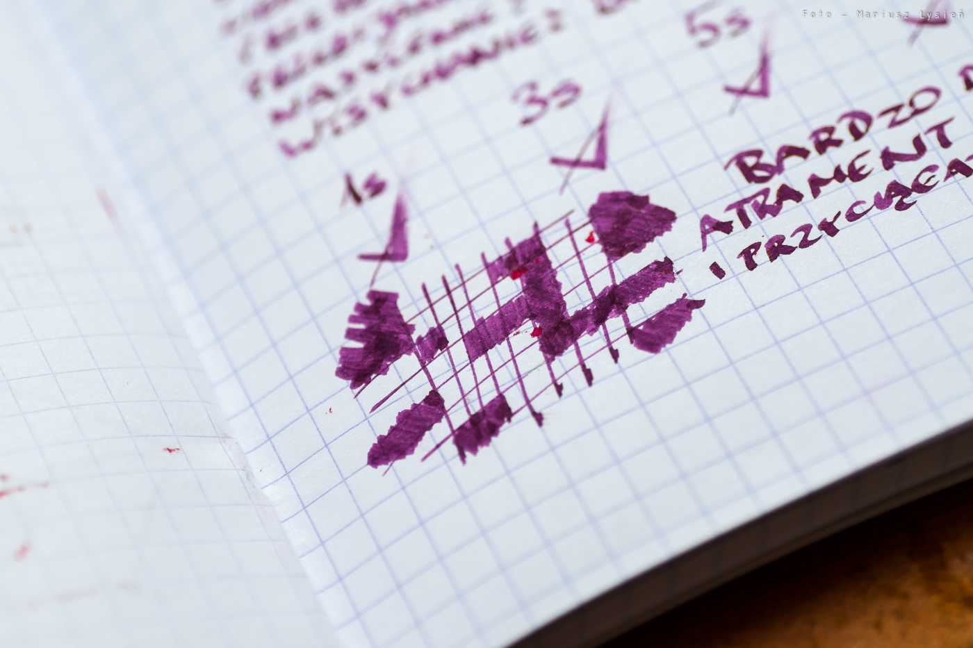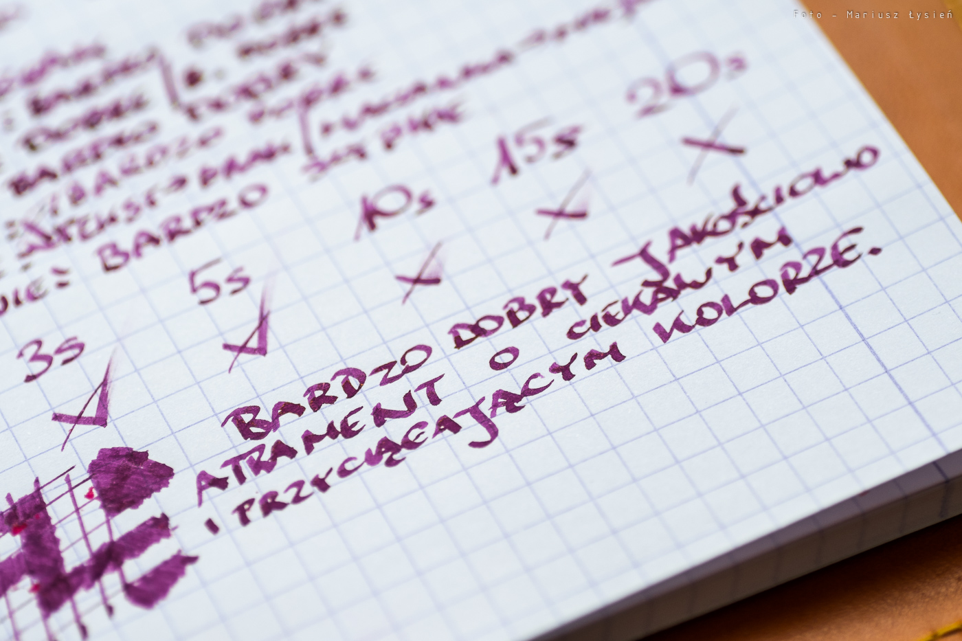 Część próbek zamieszczonych w tym teście została wykonana na papierze Moleskine Sketch Book, który ma kolor kości słoniowej, przez co nie eksponuje on tak nasycenia inkaustu. Na białym papierze firmy Oxford, saturacja jest jednak znacznie lepiej widoczna. Kolor nie traci praktycznie nic z tego, co widzimy wewnątrz butelki. Nadal barwy są mocno nasycone.