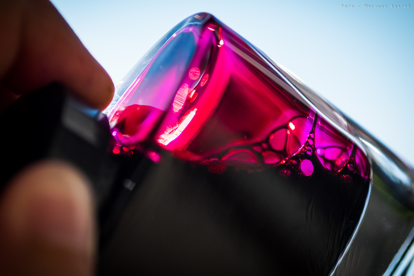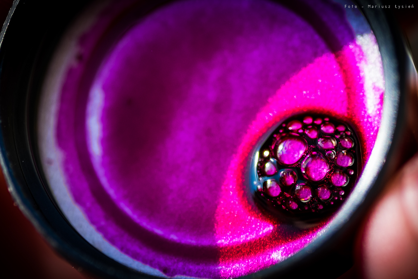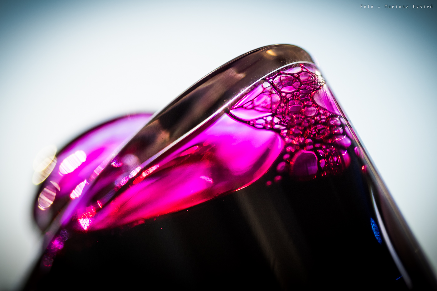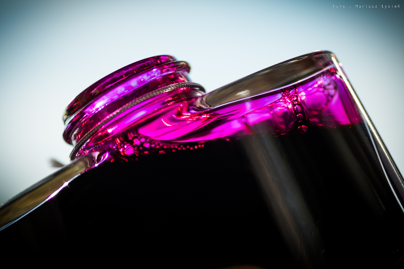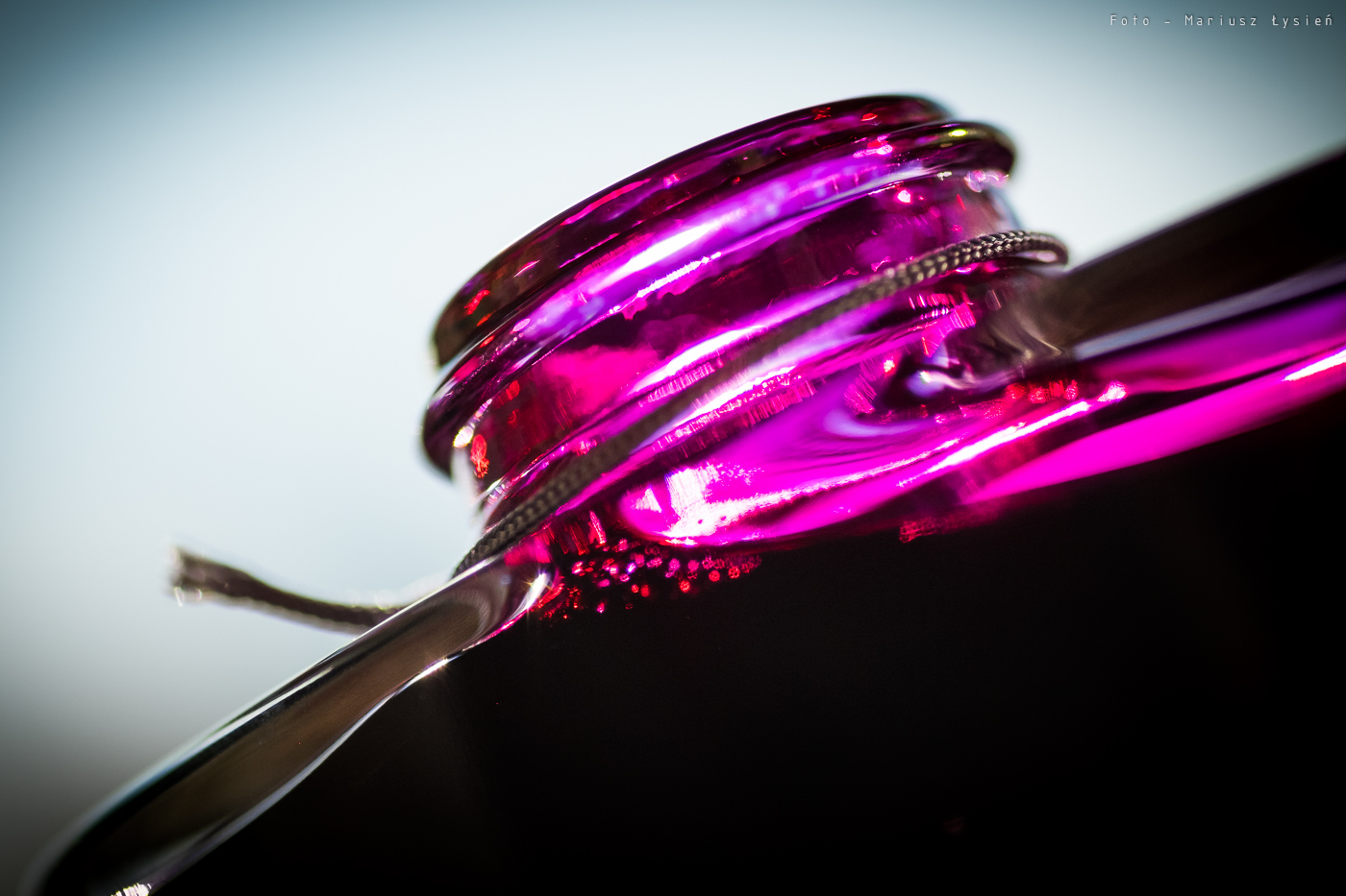 Pierwszą zaletą tego atramentu, jest duże nasycenie. Jego różowo-fioletowa barwa faktycznie przywodzi na myśl czerwone wino, aczkolwiek jest ona bardziej przesunięta w kierunku fioletu. Zbyt mało czerwieni sprawia, że nie jest to z pewnością żaden karmin czy burgund. Jest to taki „przesaturowany karmazyn”, który jednak prezentuje się bardzo okazale. Już sama etykieta zachęca swoim kolorem do wypróbowania go. Dalej jest już tylko lepiej. To co dzieje się na ściankach kałamarza to feeria barw. Od róży i fioletów po ogniste czerwienie.