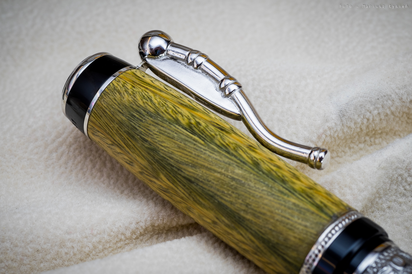 Wnętrze pudełka wyściela kremowy materiał. W „kieszonce” na wieku odnajdziemy wszystkie stosowne ulotki, instrukcje i certyfikaty. Producent dołączył również buteleczkę atramentu. Tym co jednak najbardziej nas interesuje, jest pióro wieczne. Do testu została dostarczona wersja oznaczona jako 1K. W dosyć enigmatycznym systemie identyfikacji producenta, oznacza to pióro z korpusem w kolorze czarnym oraz metalowymi wykończeniami wykonanymi ze srebra sterling (stosowną próbę odnajdziemy zresztą na medalu wieńczącym skuwkę). Elementy metalowe są zresztą poddawane specjalnym zabiegom, które mają je postarzyć wizualnie. Najmocniej jest to widoczne właśnie na medalu umieszczonym na skuwce. Przedstawia on żaglowiec na wzburzonych wodach oceanu. Element ten prezentuje się doskonale. Drewniany element skuwki oprawiony został w srebrne oraz czarne pierścienie, dzięki czemu skuwka wygląda bardzo interesująco. O drewnie należy jeszcze wspomnieć, że jego wykończenie stoi na bardzo wysokim poziomie. Jego powierzchnia jest niezwykle przyjemna w dotyku – można powiedzieć, że przypomina ona bardziej atłas niż twardy materiał. Producent nie podaje, czy jest to zasługa gatunku drewna, czy też jakiś specjalnych zabiegów, jednak trzeba przyznać, że o ile nie jestem wielkim miłośnikiem piór (czy też ich elementów) wykonanych z drewna, to w tym przypadku bardzo przypadł mi ten materiał do gustu.