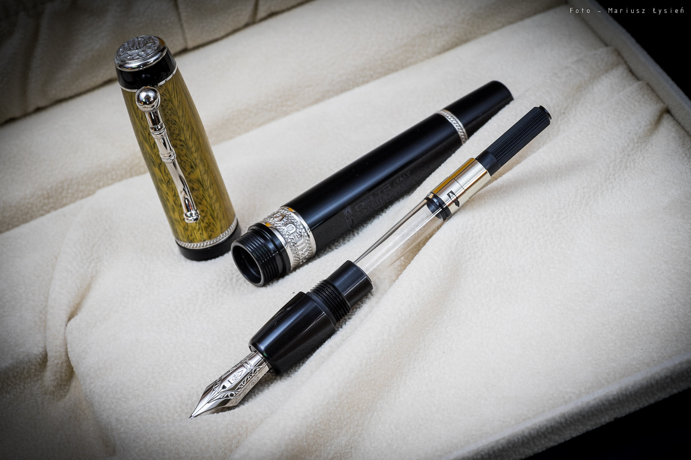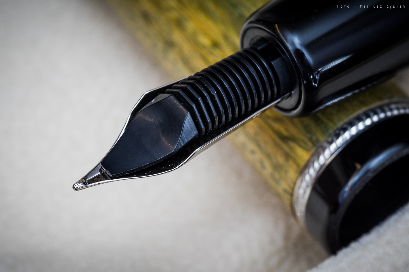 Jeżeli chodzi o kwestie związane z zasilaniem pióra, to możliwe są dwa rozwiązania. Możemy stosować naboje bądź konwerter. Na duży plus moim zdaniem należy zaliczyć fakt, że konwerter jest wkręcany w sekcję. Atrament jest podawany na papier poprzez wykonaną z 18 karatowego złota stalówkę. Prezentuje się ona bardzo okazale, a pokrywający ją wzór wykonany jest w mojej ocenie wzorowo. Nawet przy bardzo dużych powiększeniach jakość wykonania zdobień robi duże wrażenie. Co więcej – producent podaje w swoich materiałach, że możliwe jest zamówienie stalówki w następujących rozmiarach szerokości kreślonej linii: EEF-EF-F-M-B-OM-BB-OB-OBB-STUB. Trzeba przyznać, że w porównaniu do często z roku na rok ograniczanej palety stalówek u niektórych producentów, taki wybór robi wrażenie.