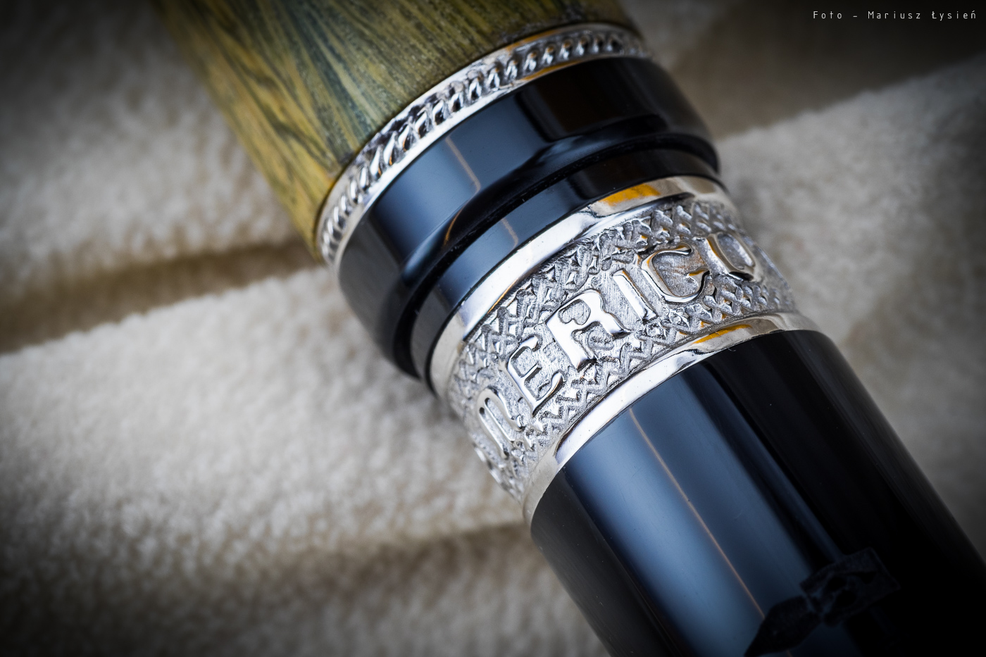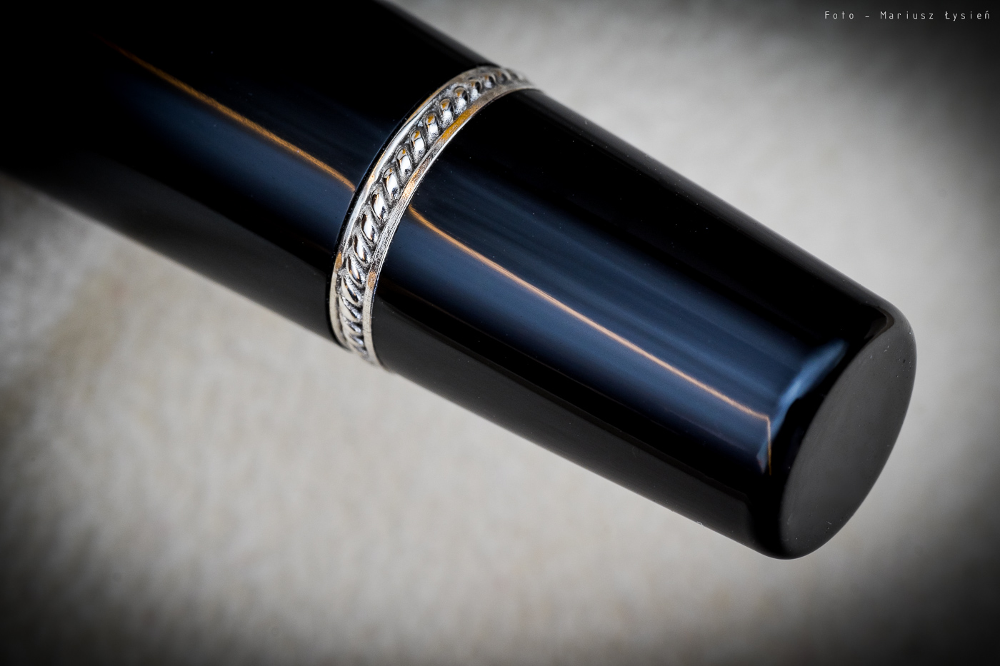 Korpus (jak zresztą i całe pióro) jest dosyć pokaźnych rozmiarów. Pióro trzyma się bardzo wygodnie. Jest ono zresztą dobrze wyważone. Sytuacja ta jednak zmienia się po założeniu skuwki na tył korpusu. Wtedy wyważenie pióra ulega zachwianiu i stalówka ewidentnie się podnosi, gdyż ciężka skuwka je przeważa Sama skuwka zresztą raczej słabo trzyma się korpusu i to do tego stopnia, że raczej trudno mówić o możliwości jej zakładania. Niemniej samo pióro jest na tyle duże, że moim zdaniem nie ma absolutnie żadnej potrzeby jej zakładania na tył korpusu. Żywica w kolorze czarnym robi dobre wrażenie. Klasyczny design wzbogacony elementem, który bardzo, ale to bardzo lubię. Mowa o grawerunku umieszczonym na korpusie, który zawiera oznaczenie producenta, a także informację o tym iż jest to edycja limitowana (w przypadku modelu 1K jest to 931 egzemplarzy). Grawerunek taki kojarzony jest najczęściej z klasycznymi piórami, o których często mówi się „vintage”, gdyż producenci z biegiem lat zrezygnowali w znaczącej mierze z umieszczania tego elementu. Tak więc poczytuję to za duży plus. Korpus otrzymał także wydatny pierścień, na którym wygrawerowano imię i nazwisko odkrywcy. Głębokość grawerunku jest spora, a jakość wykonania bardzo dobra. Byłem ciekaw tego elementu oraz tego jak wypadnie on w dużym powiększeniu, gdyż często tego typu zdobienia prezentują się atrakcyjnie dopóki nie spoglądamy na nie przez lupę. Tutaj nawet z lupą (bądź obiektywem macro) wszystko jest tak jak powinno być.