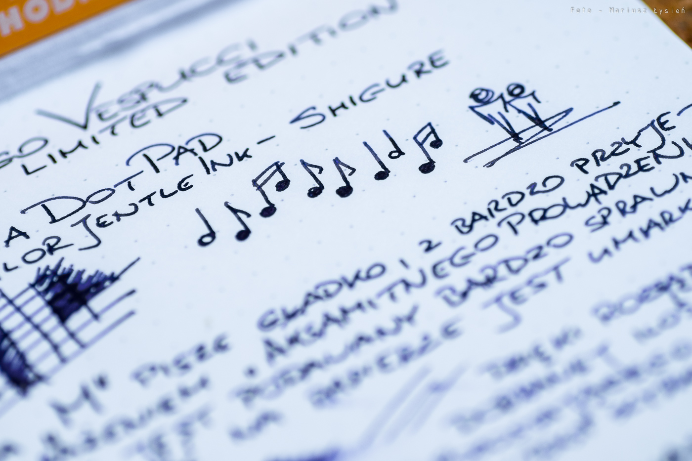 Walory piśmiennicze pióra moim zdaniem stoją na bardzo wysokim poziomie. Stalówka sunie po papierze gładko, lecz z pewnym „aksamitnym” oporem. Wrażenie jest bardzo dobre. Rozsądnie jest także dobrana ilość podawanego atramentu. Jest go umiarkowana ilość, która sprawia, że pisany przez nas tekst wysycha szybko, ale nie mamy wrażenia „suchego” pióra. Wraz z większym dociskiem stalówki do papieru możliwe jest uzyskanie szerszej linii, jednak nacisk wymagany do tego celu jest na tyle duży, że podejrzewam iż mało kto będzie z niego korzystał. Zdecydowanie nie jest to stalówka nawet semi-flex. W każdym bądź razie jest to to, czego możemy się spodziewać po dobrej jakości stalówce, którą wykonano z 18 karatowego złota.