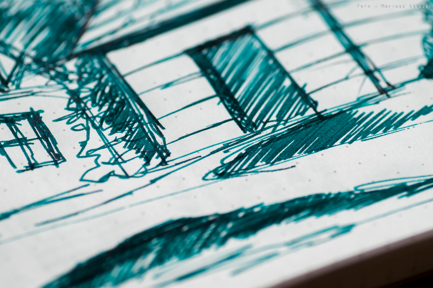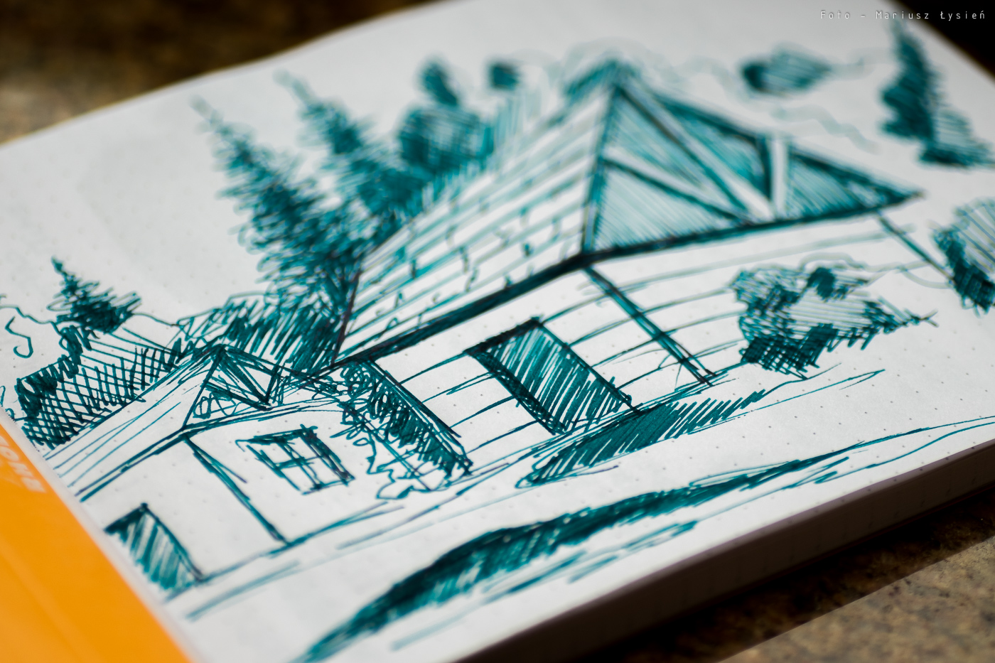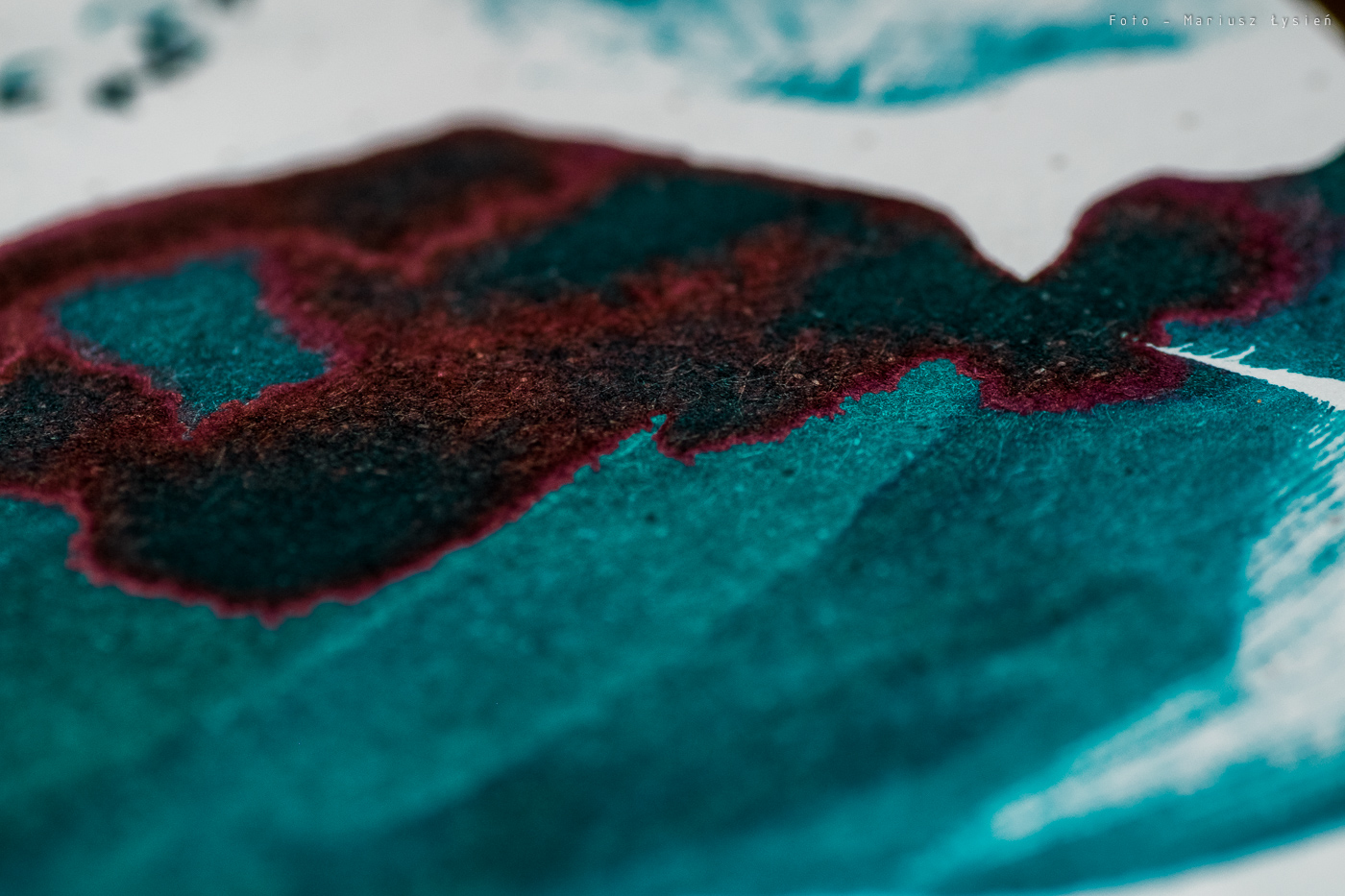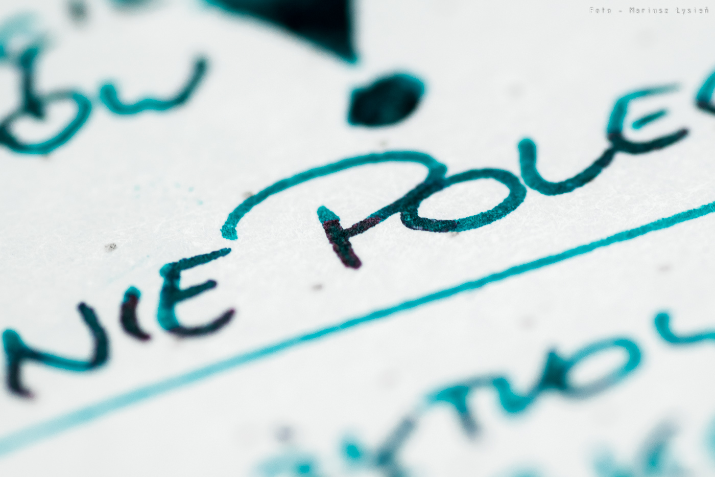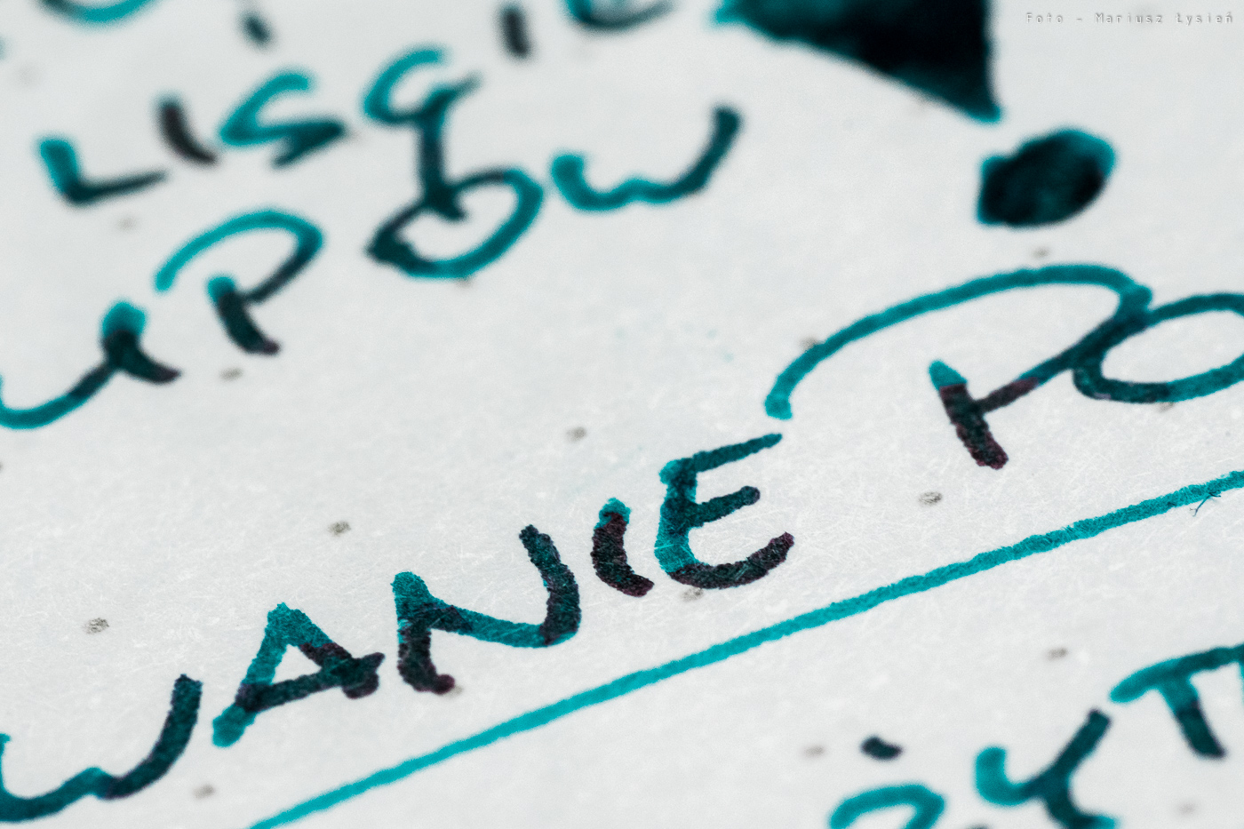 O strzępieniu czy przebijaniu nie ma mowy. Nawet przy szkicowaniu trudno jest sprawić, aby cokolwiek przebiło na drugą stronę. Czas wysychania jest raczej długi. Na satysfakcjonujący rezultat musimy poczekać około 15 sekund. Co jednak atrament oferuje w zamian? Na pewno piękne cieniowanie. Nawet w wykonanej ze stali stalówce Kaweco, widać jak wiele elementów liter nie tylko ma zróżnicowane nasycenie, ale i posiada wspomniany połysk.