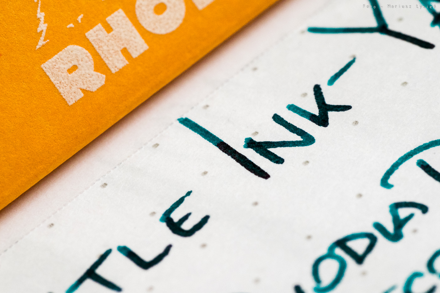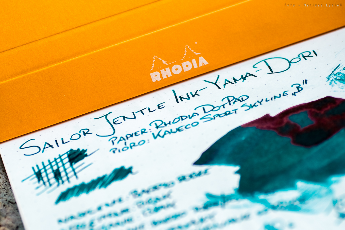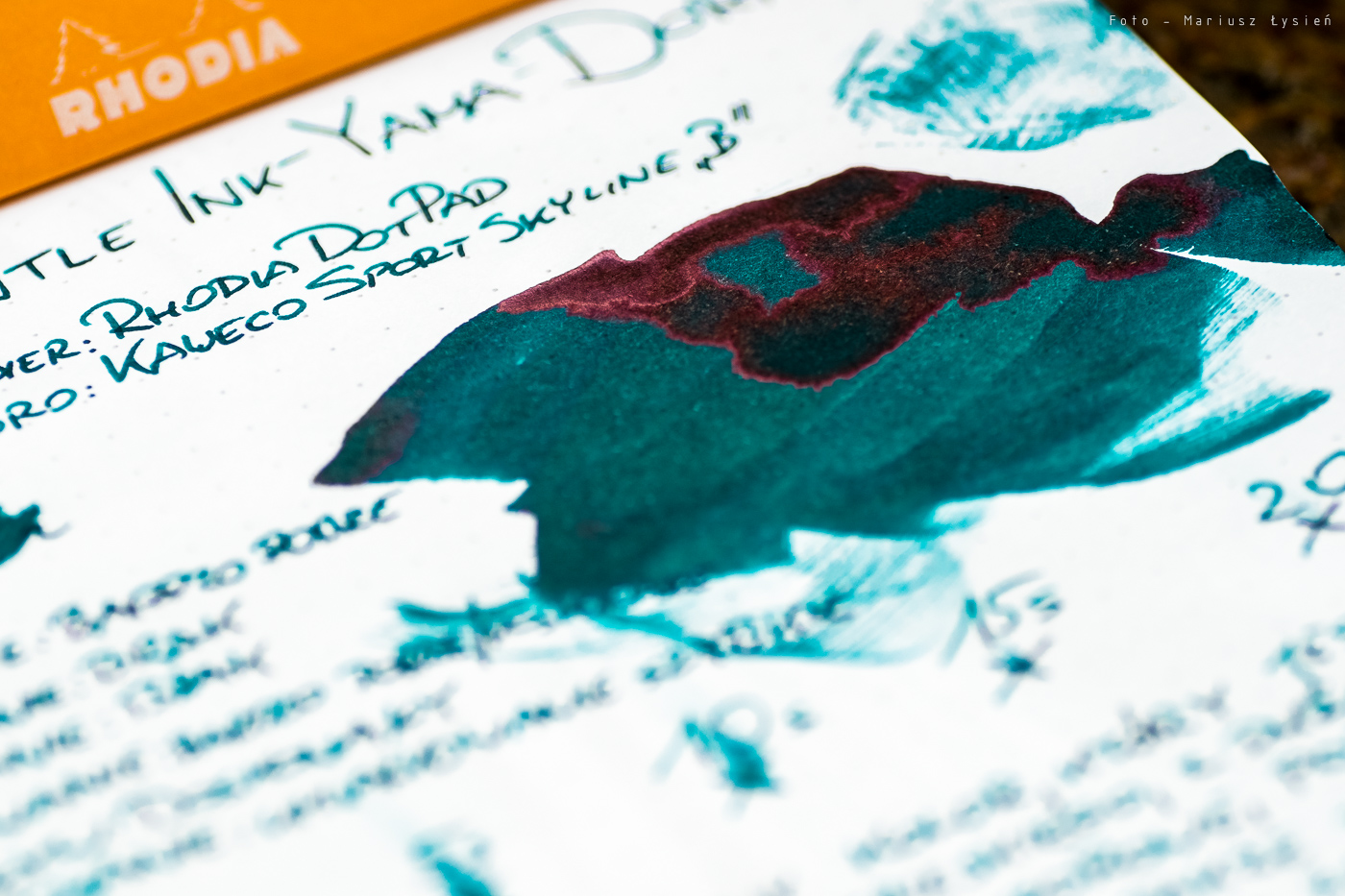 W roli testowego pióra wystąpiło Kaweco Sport Skyline ze stalówką B oraz oczywiście notes Rhodia DotPad. Jaki jest Yama-Dori? W skrócie można by go określić jako „świetny”. Naprawdę. Piękny, głęboki zielony kolor z domieszką niebieskiego, który połyskuje w każdym miejscu, gdzie większa ilość cieczy osiadła na papierze. Z owego połyskiwania jest on zresztą znany. Wystarczy spojrzeć na wyschnięty „kleks”, aby zobaczyć jak duża jego powierzchnia błyszczy na brunatno-bordowy kolor.
