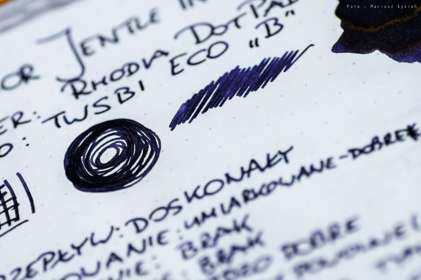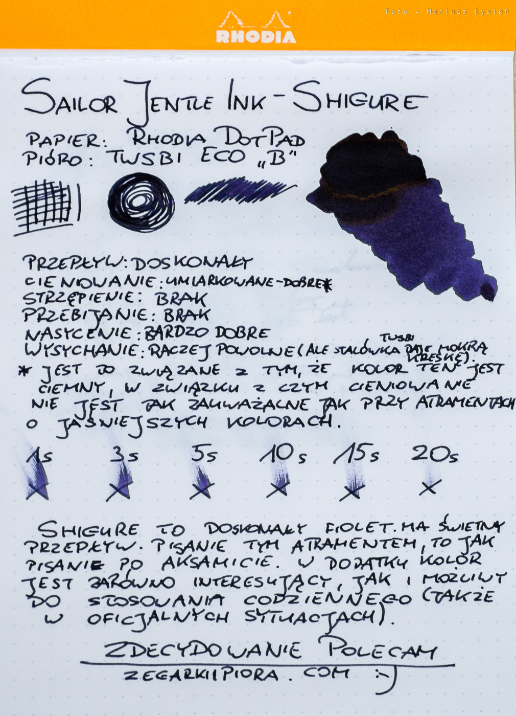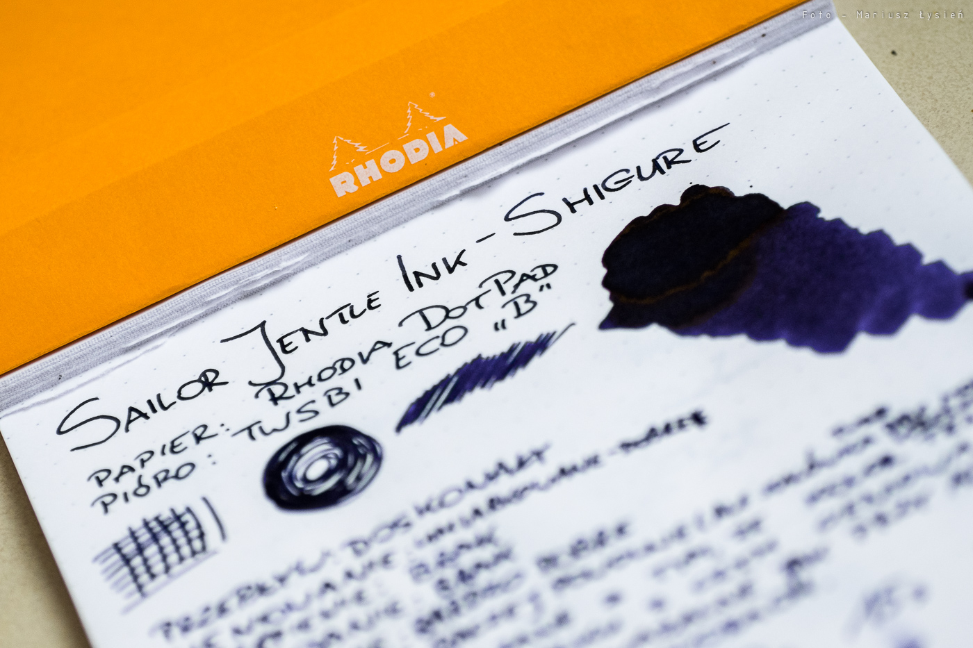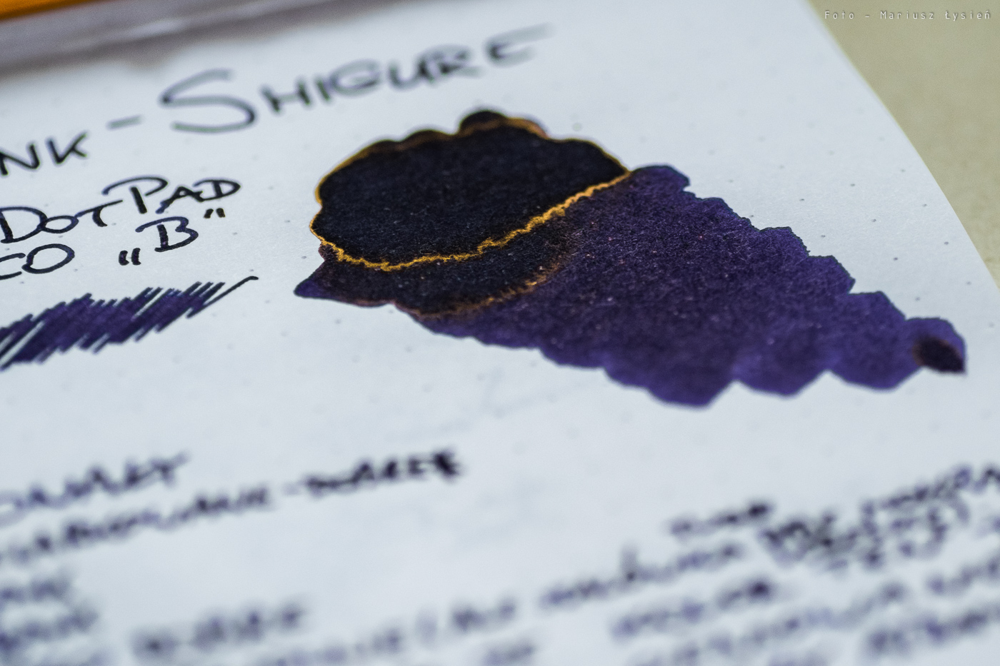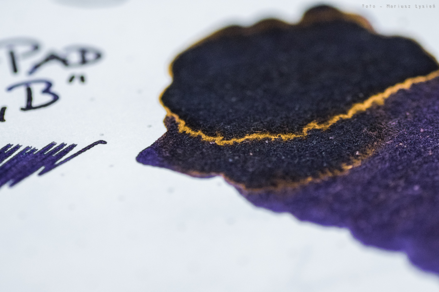 Do testu użyłem pióra TWSBI Eco ze stalówką B oraz papieru pochodzącego z notesu Rhodia DotPad. W skrócie można by atrament ten opisać jako połączenie koloru fioletowego i niebieskiego, z przewagą tego pierwszego. Ktoś powie, że takich inkaustów jest w sprzedaży dziesiątki, ale nic bardziej mylnego. Dlaczego? Bo Shigure to doskonała równowaga barw. Kolor ten w podającej obficie atrament stalówce TWSBI Eco wygląda na tzw. „pierwszy rzut oka” na czarny, lecz po przyjrzeniu mu się widać, że zdecydowanie czernią nie jest. Fioletowe atramenty lubię, podobnie jak niebieskie, ale Shigure to coś więcej. Jest niesamowicie elegancki i dystyngowany. To kolor, który spokojnie mógłby być tłem dla klejnotów koronnych niejednego monarchy. Z atłasem i aksamitem ma wspólną jeszcze jedną cechę, a mianowicie to, jak nawilża on stalówkę. Pisanie z jego pomocą, to jak sunięcie po aksamicie. Wrażenie jest niezwykle przyjemne, i rzadko spotykane w świecie atramentów. W najobficiej nasączonych partiach ujawnia fragmenty połyskujące na kolor złoty. Czy trzeba lepszej rekomendacji?