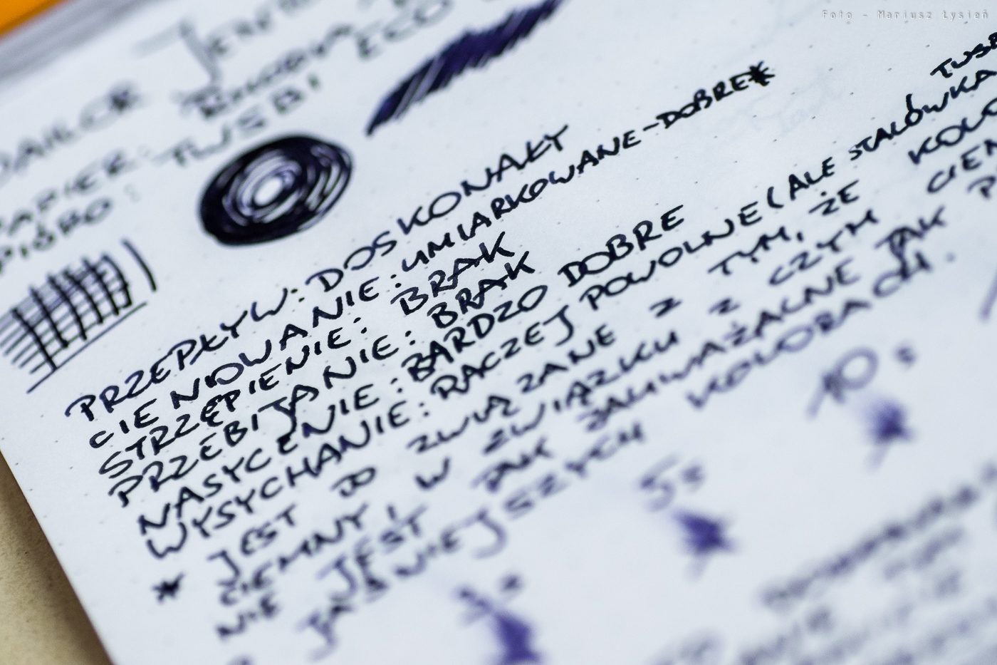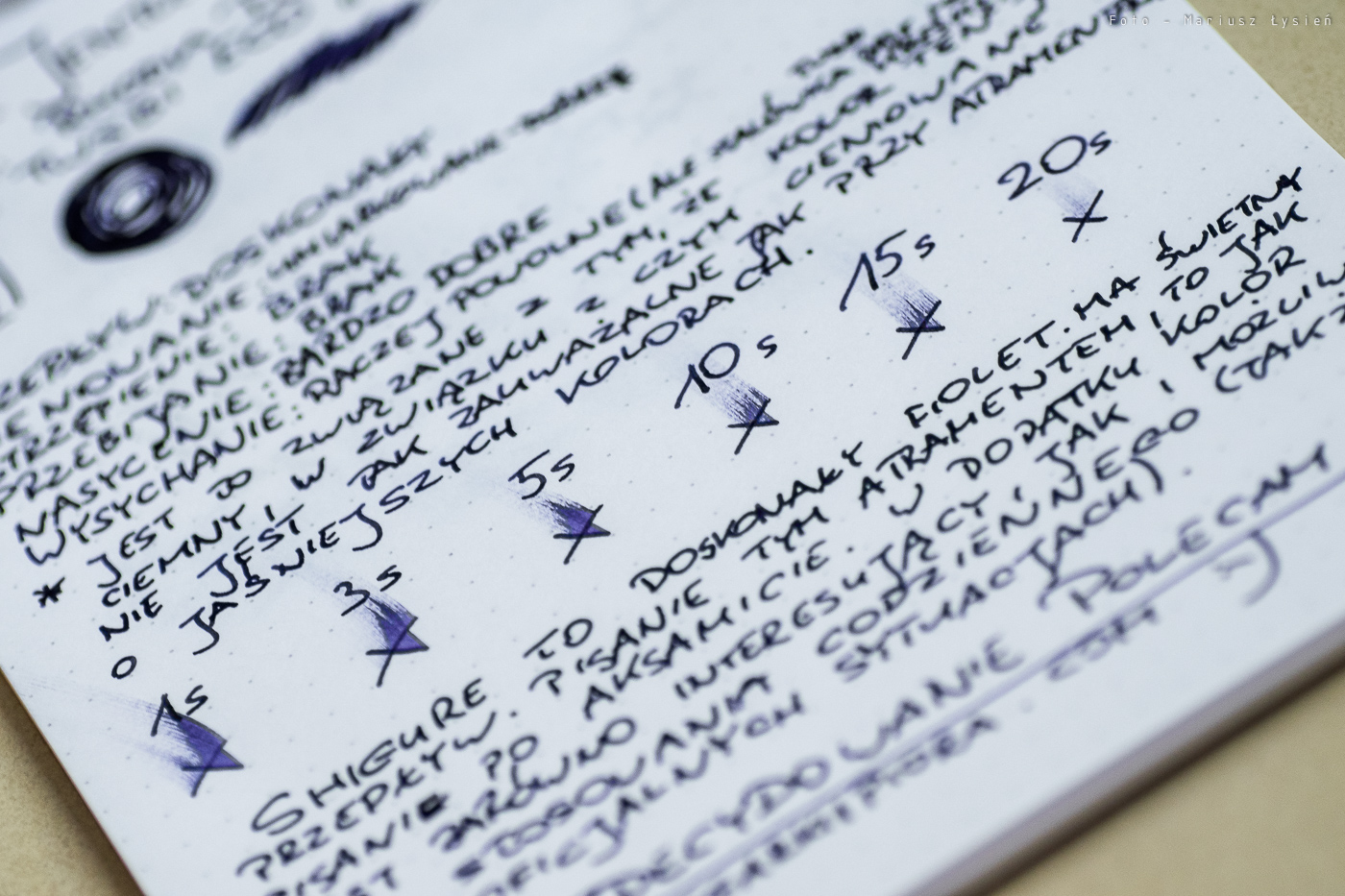To jednak nie wszystko. Nie strzępi i nie przebija. Nawet bardzo intensywnie nasączony kleks objawił się na drugiej stronie jedynie śladowym przebiciem. Nasycenie jest w pełni satysfakcjonujące. Jeżeli chodzi o cieniowanie, to moim zdaniem jest ono na wysokim poziomie, ale trzeba w tym celu używać albo stalówki cienkiej/podającej ew. mniej atramentu, albo flexa. W „mokrej B” pióra TWSBI Eco, większość tekstu jest tak nasycona, że ciemny kolor ogranicza w dużym stopniu postrzeganie cieniowania. Często można znaleźć informacje, że atrament ten ma problemy z szybkim wysychaniem. Faktycznie, nie jest on rekordzistą w tym względzie i jak widać na przykładach, nawet po 20 sekundach możliwe było roztarcie pewnych fragmentów testowego „X”. Trzeba jednak wziąć pod uwagę ilość jaką podaje na papier pióro użyte w teście, a ilość ta jest naprawdę duża.
