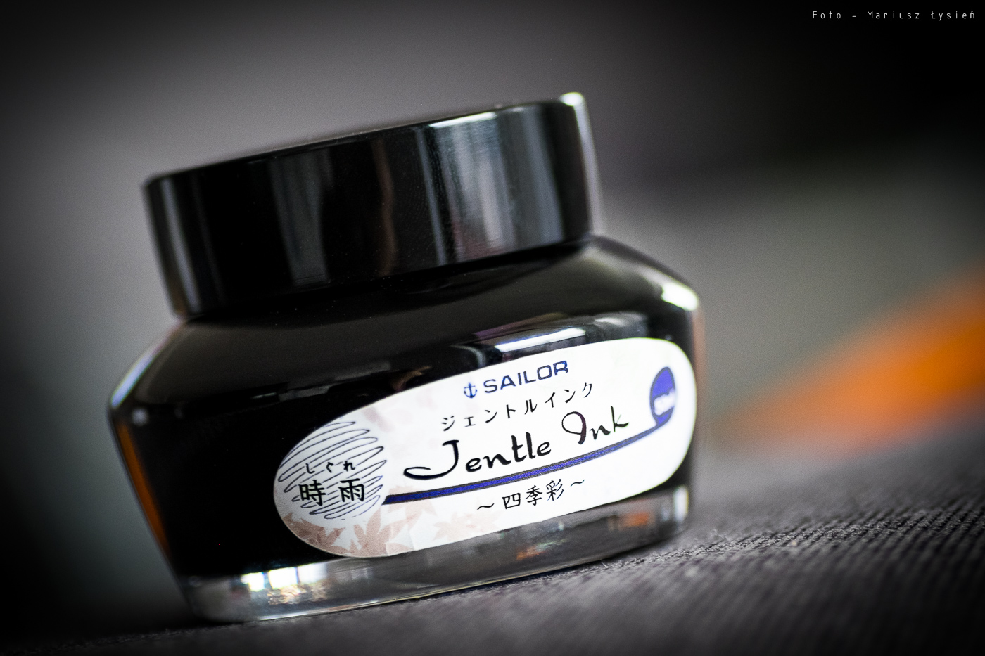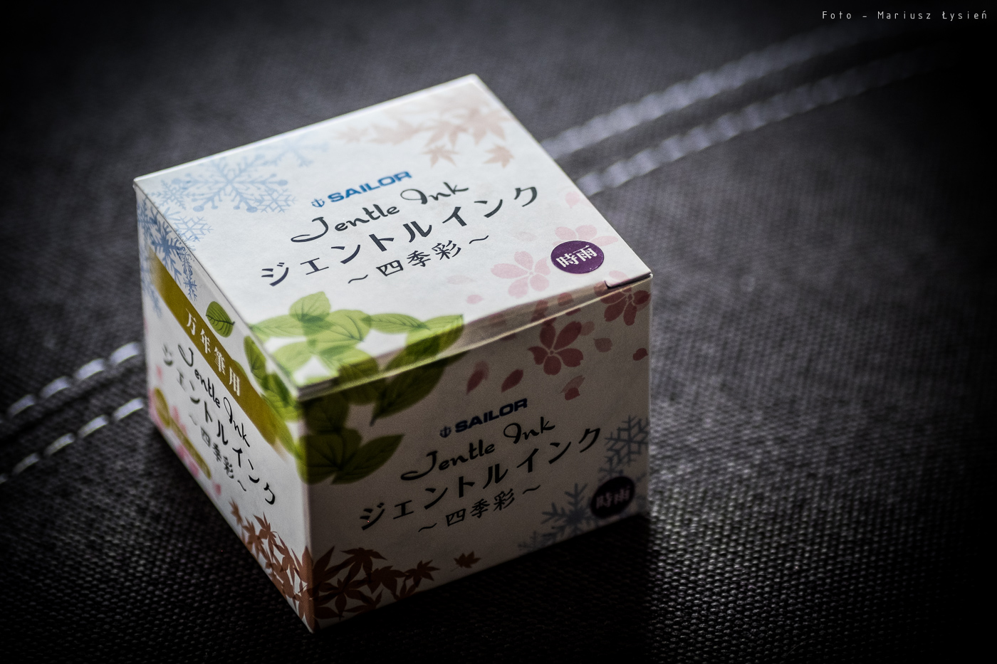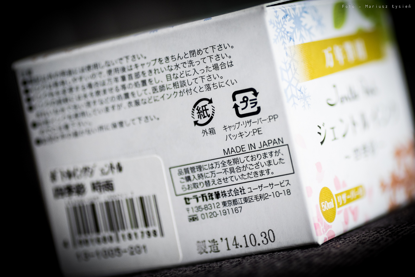 Atramenty z serii Jentle Ink sprzedawane są w białych, kartonowych opakowaniach, na których umieszczono symbole związane z tematyką czterech pór roku. Seria składa się z 8 kolorów, z których po dwa przypisano do odpowiadających im pór roku. Papierowe opakowanie robi dobre wrażenie i jest całkiem estetyczne. W mojej ocenie jedynym minusem są napisy praktycznie tylko i wyłącznie w języku japońskim, podczas gdy inkausty z tej serii są ogólno dostępne w innych krajach. Gdy kupowałem ten atrament w zaprzyjaźnionym sklepie Twoje Pióro, to musieliśmy upewnić się co do niektórych kolorów na zasadzie sprawdzenia kodu produktu umieszczonego pod kodem kreskowym, bo nawet tak podstawowe informacje są opisane w języku japońskim. Przyznam, że przynajmniej te najbardziej podstawowe informacje mogłyby być podane w języku bardziej powszechnym. Osoby nie władające językiem „kraju kwitnącej wiśni” mogą zidentyfikować ten kolor po kodzie: 13-1005-201