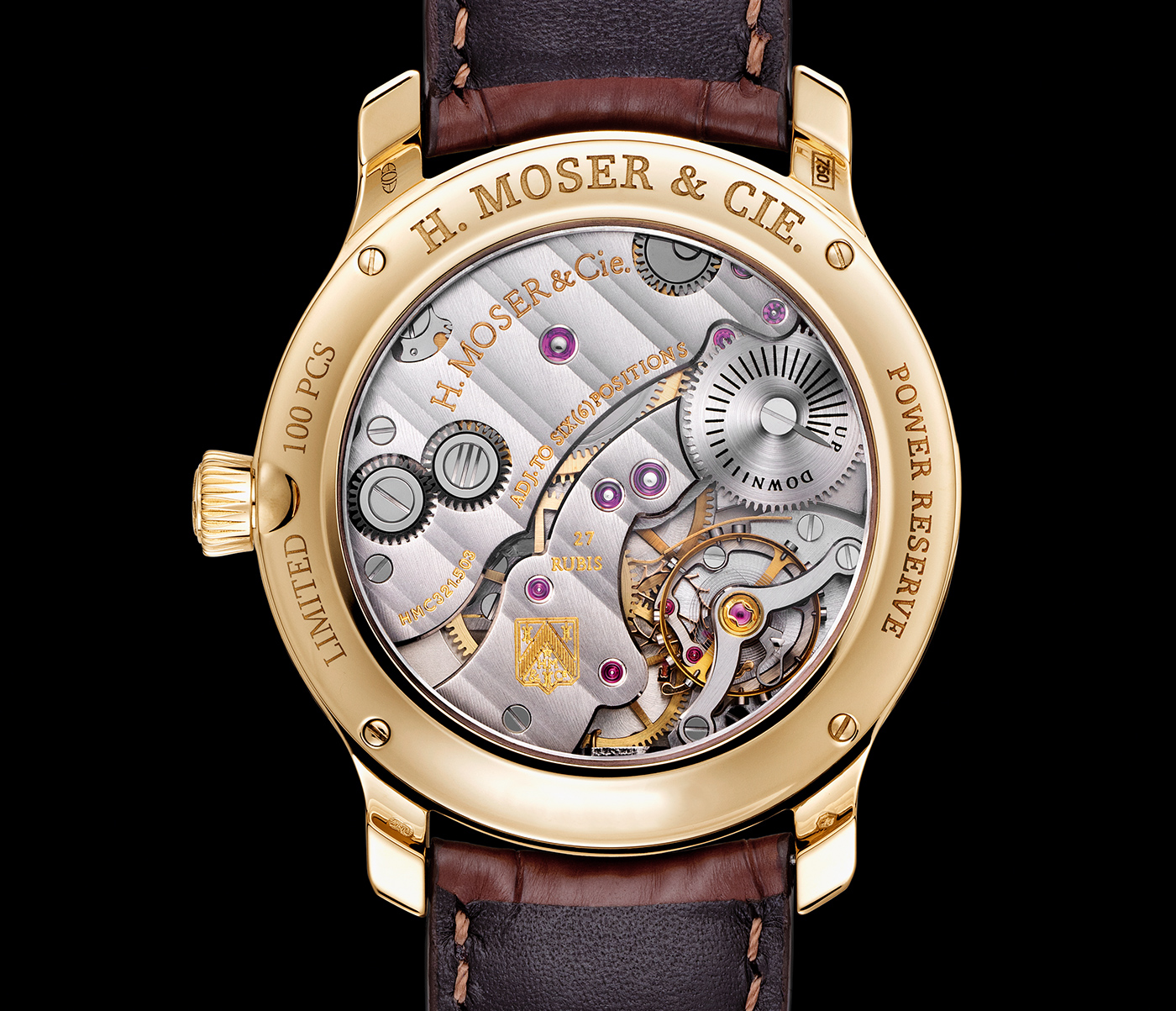 Oczywiście tym, z czego najbardziej znana jest manufaktura, są doskonałe mechanizmy. W tym przypadku zastosowano manufakturowy kaliber HMC 321 z ręcznym naciągiem sprężyny, Pracuje on z częstotliwością chodu wynoszącą 18000VpH, a do łożyskowania jego ruchomych elementów użyto 27 kamieni. Oczywiście nie mogło zabraknąć rozwiązań typowych dla mechanizmów H. Moser & Cie., czyli sprężyny Straumanna, charakterystycznego kształtu zębów dla kół przekładni, czy też wymiennego modułu wychwytu. Rezerwa chodu wynosi 3 dni, a poziom zmagazynowanej w sprężynie napędowej energii możemy odczytać z tyłu zegarka.