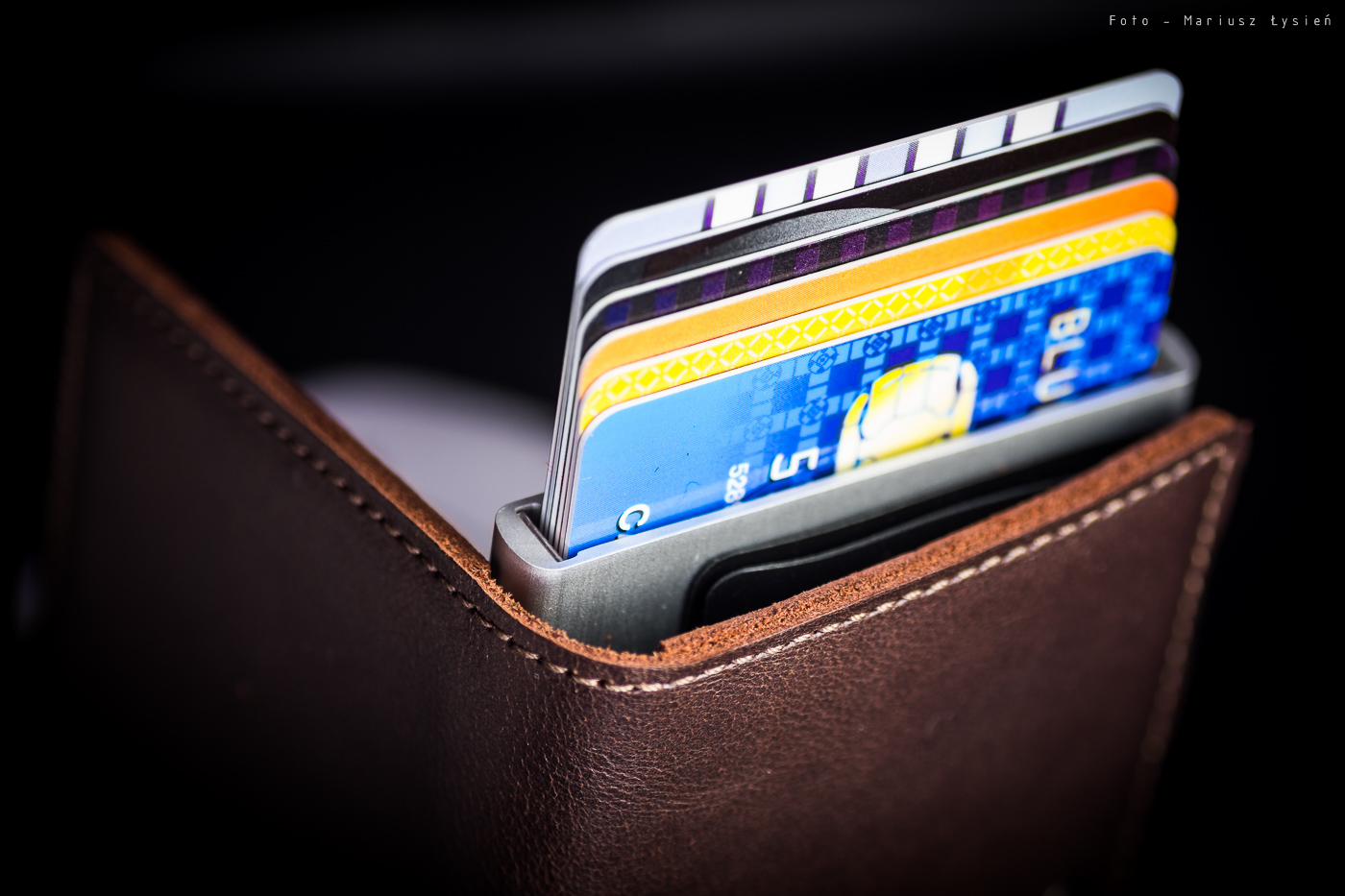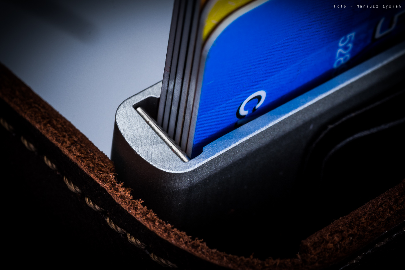 Poza zabezpieczaniem kart płatniczych, trzeba wspomnieć, że portfel ten ma jeszcze jedną bardzo ciekawą funkcję. Dzięki specjalnej konstrukcji wnętrza metalowej wkładki, po przesunięciu suwaka znajdującego się w dolnej części uzyskujemy szybki dostęp do dowolnej z kart płatniczych. Pojemność wkładki jest ograniczona do 6 kart płaskich bądź 4 wytłaczanych. Pozornie to niewiele, jednak odpowiedzmy sobie ile kart płatniczych tak naprawdę ze sobą nosimy. Moim zdaniem to ilość wystarczająca. Gdyby komuś to jednak było mało, to zawsze można wybrać model Twinwallet, który podwaja te wartości. Niezależnie od pojemności – rozwiązanie jest szybkie, wygodne i moim zdaniem bardzo praktyczne. Karty zamocowane są pewnie i nie ma mowy o samoistnym wysuwaniu się kart. Nie wiem jak będzie ze ścieraniem się kart przy dłuższym użytkowaniu, gdyż w krótkim okresie czasu jest to niemożliwe do zweryfikowania, ale myślę, że nie będzie z tym problemu, bo widać, że konstrukcja tego elementu jest przemyślana.