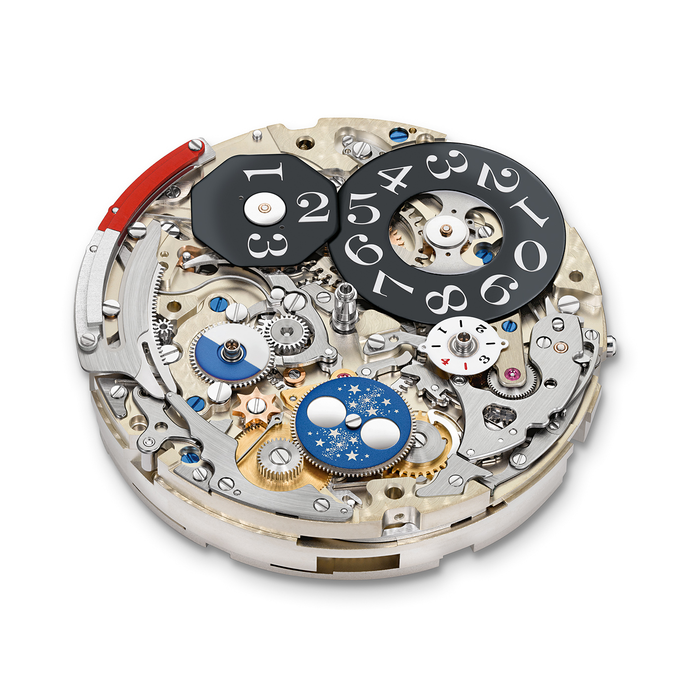 Zestaw oznaczeń cyferblatu rozpoczyna skala powiązana z funkcją stopera. Wkomponowano w nią logo producenta (na godzinie 12) oraz wskaźnik rezerwy chodu (na godzinie 9:30). Podziałka sekundowa sąsiaduje z niewielkimi, nakładanymi indeksami. Pierwsze skrzypce w kompozycji cyferblatu grają jednak dwie sub-tarcze oraz duże okno datownika (umieszczone na godzinie 12). W przypadku sub-tarczy zlokalizowanej na godzinie 4 możemy odczytać czas dla funkcji stopera (w zakresie 30 minut), bieżący miesiąc, oraz czy aktualny rok jest rokiem przestępnym. W przypadku sub-tarczy zlokalizowanej na godzinie 8 są to: wskaźnik dnia i nocy, „mała sekunda”, dzień tygodnia. Bieżący dzień miesiąca możemy odczytać we wspomnianym już wcześniej podwójnym oknie na godzinie 12. Zestaw funkcji poszerzono o wskazanie faz księżyca, które odnajdziemy na godzinie 6.