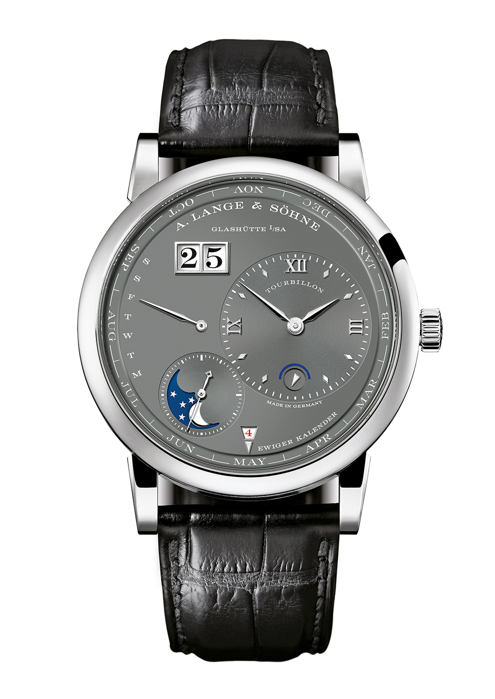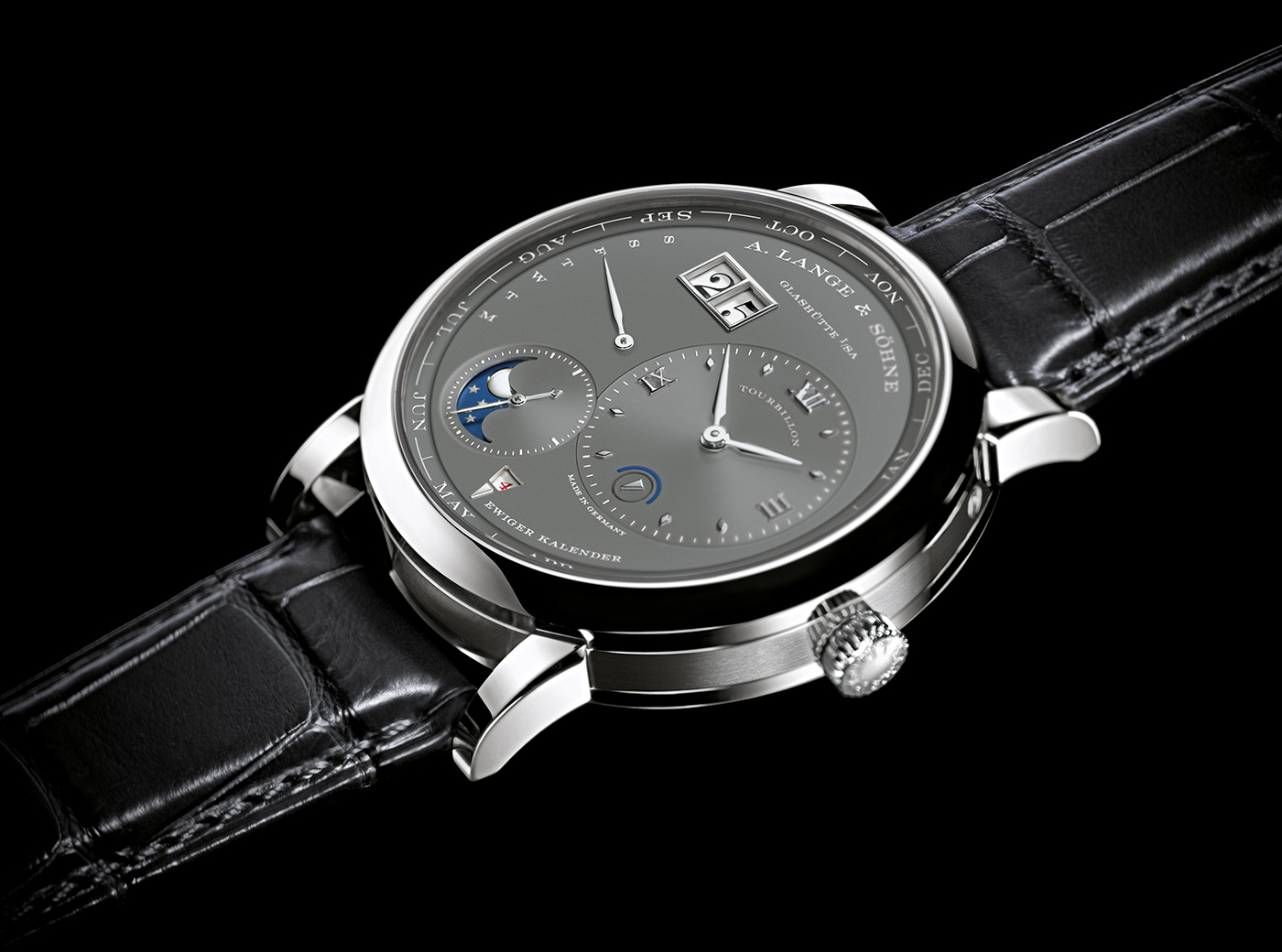 Liczba ta jest tak duża, gdyż mechanizm ten poza komplikacją tourbillonu, posiada także komplikację wiecznego kalendarza. Rozbudowane wskazanie daty jest jednak tak sprytnie rozmieszczone na powierzchni cyferblatu, że w pierwszym momencie nie zwraca się na nie uwagi. Oczywiście najlepiej widocznym elementem datownika, jest duże i charakterystyczne dla serii Lange 1 podwójne okno datownika, które umieszczono na godzinie 11. Na godzinie 9 umieszczono wskazanie odpowiadające za wyświetlanie aktualnego dnia tygodnia, podczas gdy bieżący miesiąc odczytujemy z zewnętrznego, otaczającego tarczę pierścienia. Nazwa bieżącego miesiąca wskazywana jest przez trójkąt umieszczony na godzinie 6. Samo trójkątne wycięcie jest także oknem, w którym wyświetlana jest cyfra z zakresu 1-4, która informuje nas, czy bieżący rok, jest rokiem przestępnym.