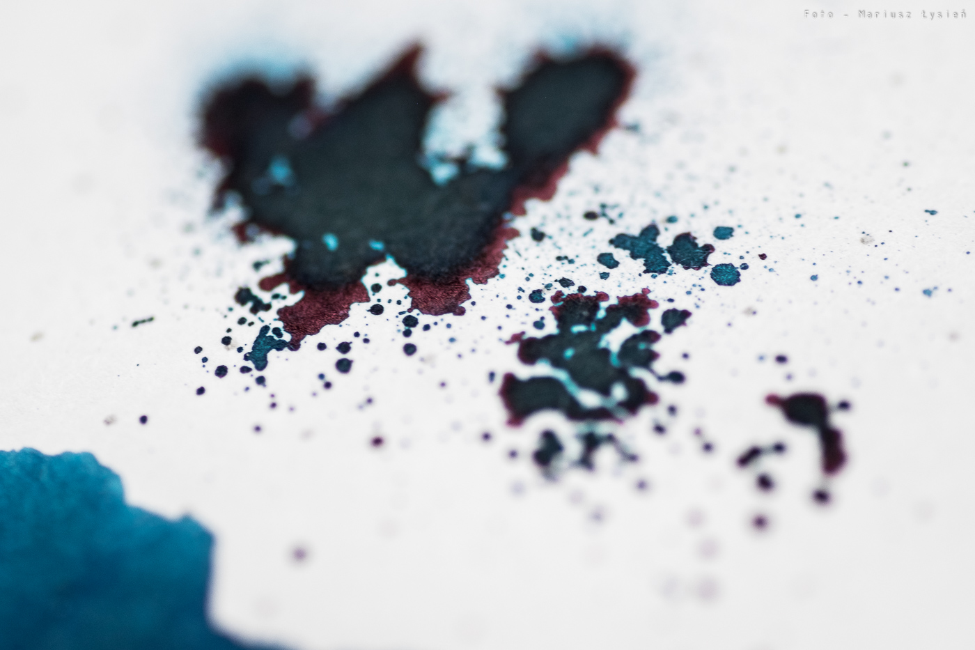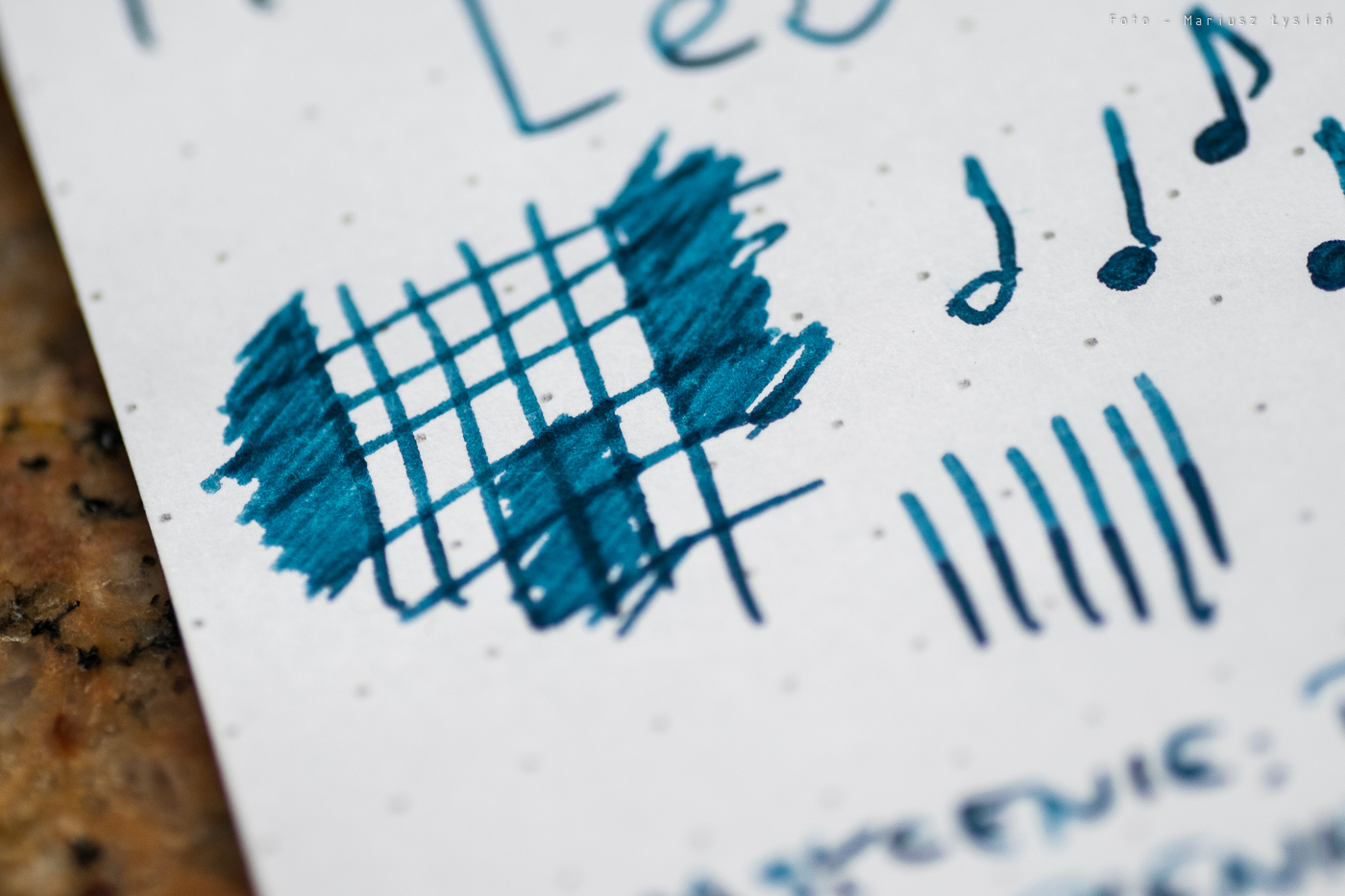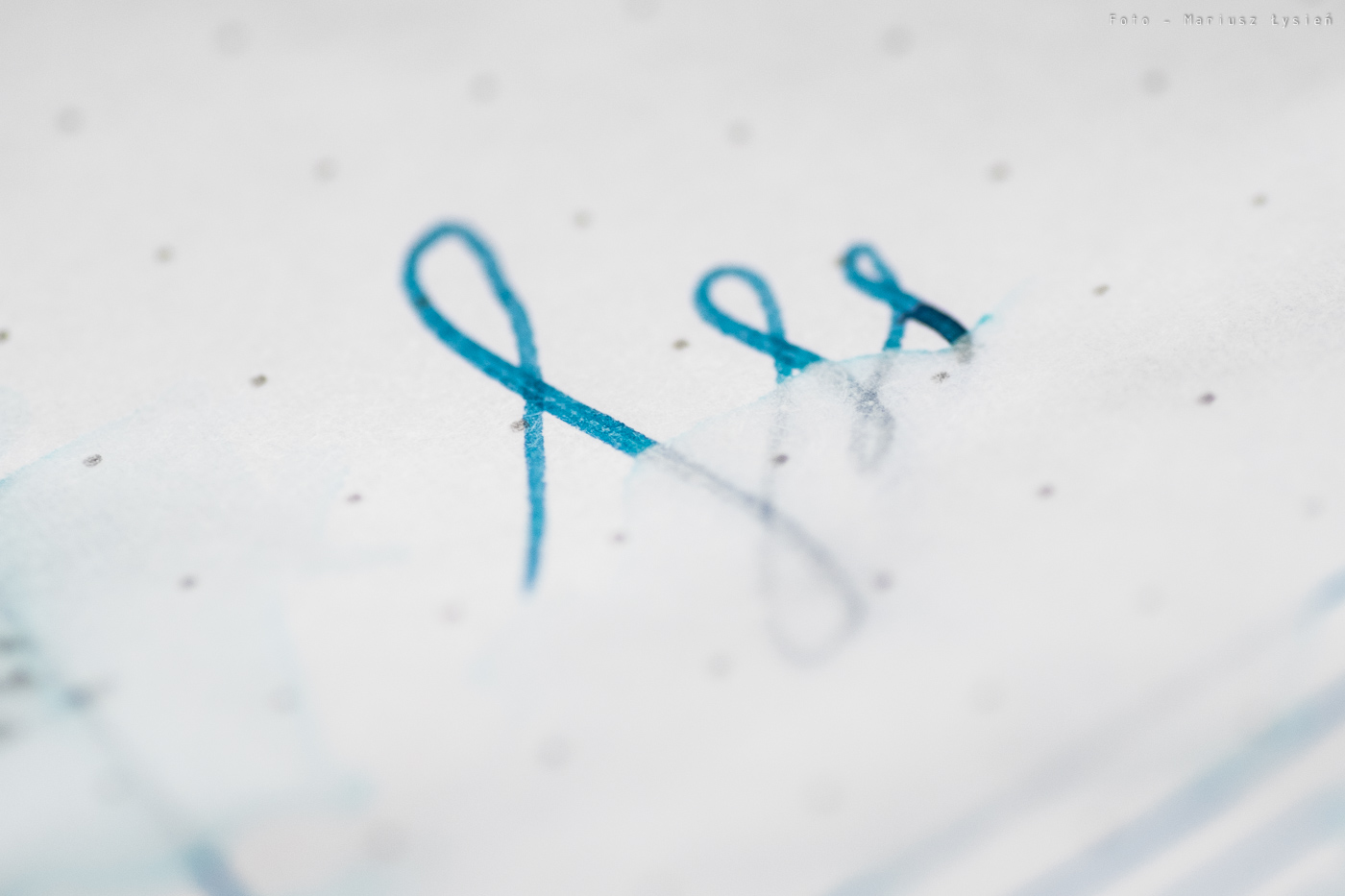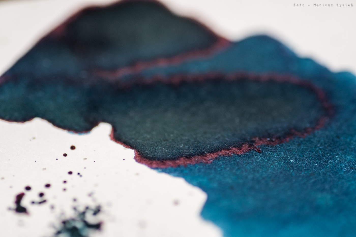 Niezależnie od tego, atrament ma ciekawy kolor. Jego niebieska barwa wpada momentami w granat. Samo nasycenie jest bardzo dobre, chociaż kolor nie ma nadmiernej saturacji. Finalnie powstał kolor, który jest w stanie odróżnić się od wielu innych niebieski atramentów. To bardzo dobrze. W przypadku kleksa możemy obserwować ładnie połyskujące obwódki.