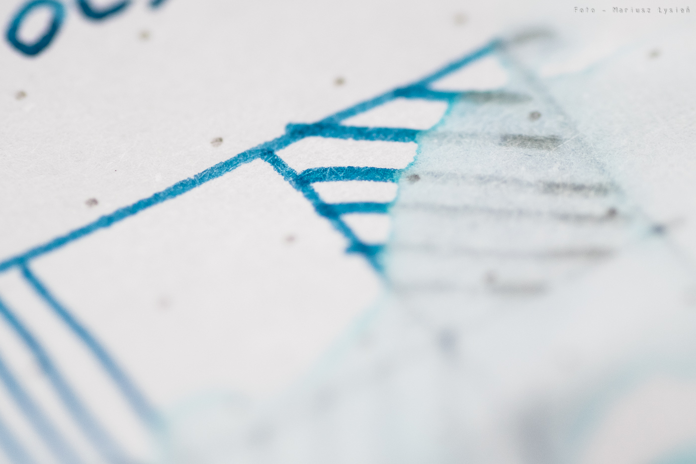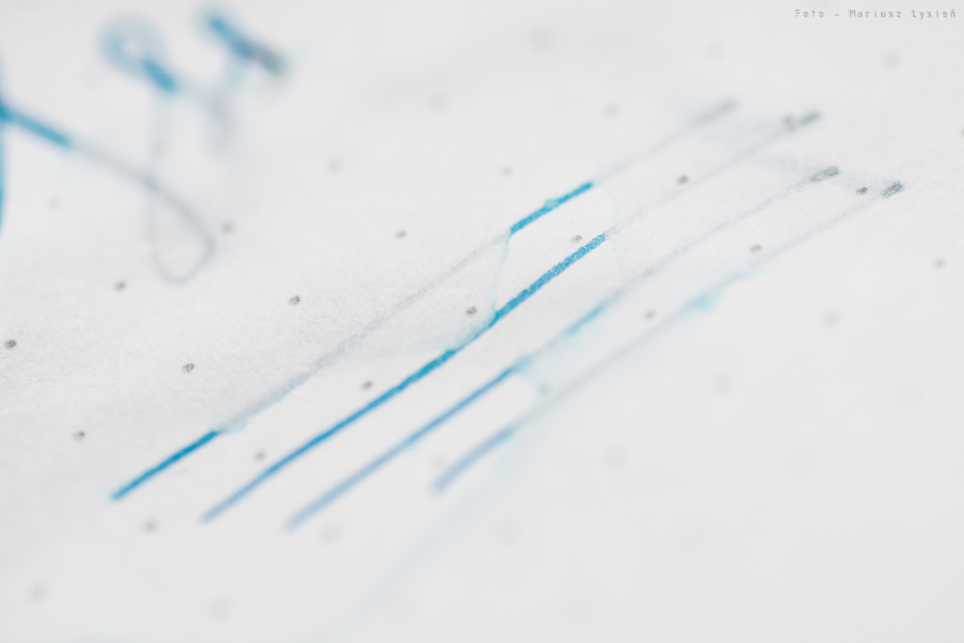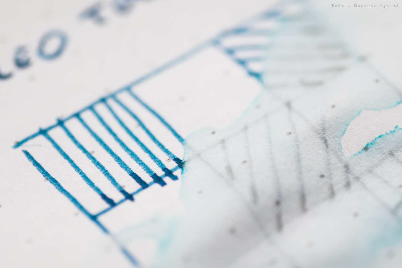 Niezależnie od tego, atrament ma ciekawy kolor. Jego niebieska barwa wpada momentami w granat. Samo nasycenie jest bardzo dobre, chociaż kolor nie ma nadmiernej saturacji. Finalnie powstał kolor, który jest w stanie odróżnić się od wielu innych niebieski atramentów. To bardzo dobrze. W przypadku kleksa możemy obserwować ładnie połyskujące obwódki.