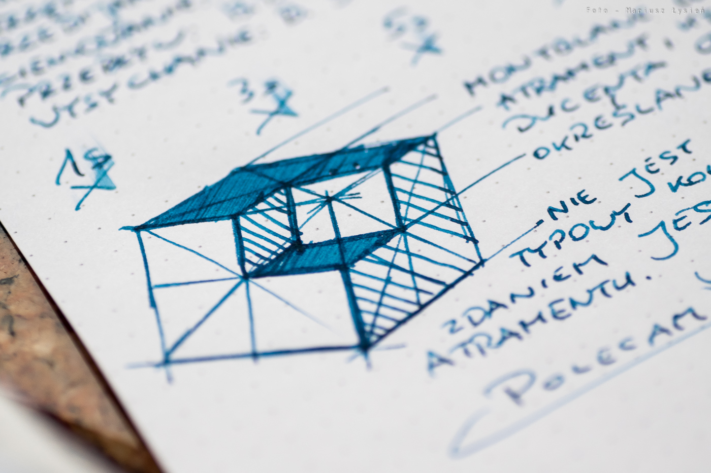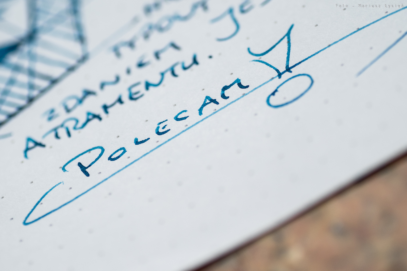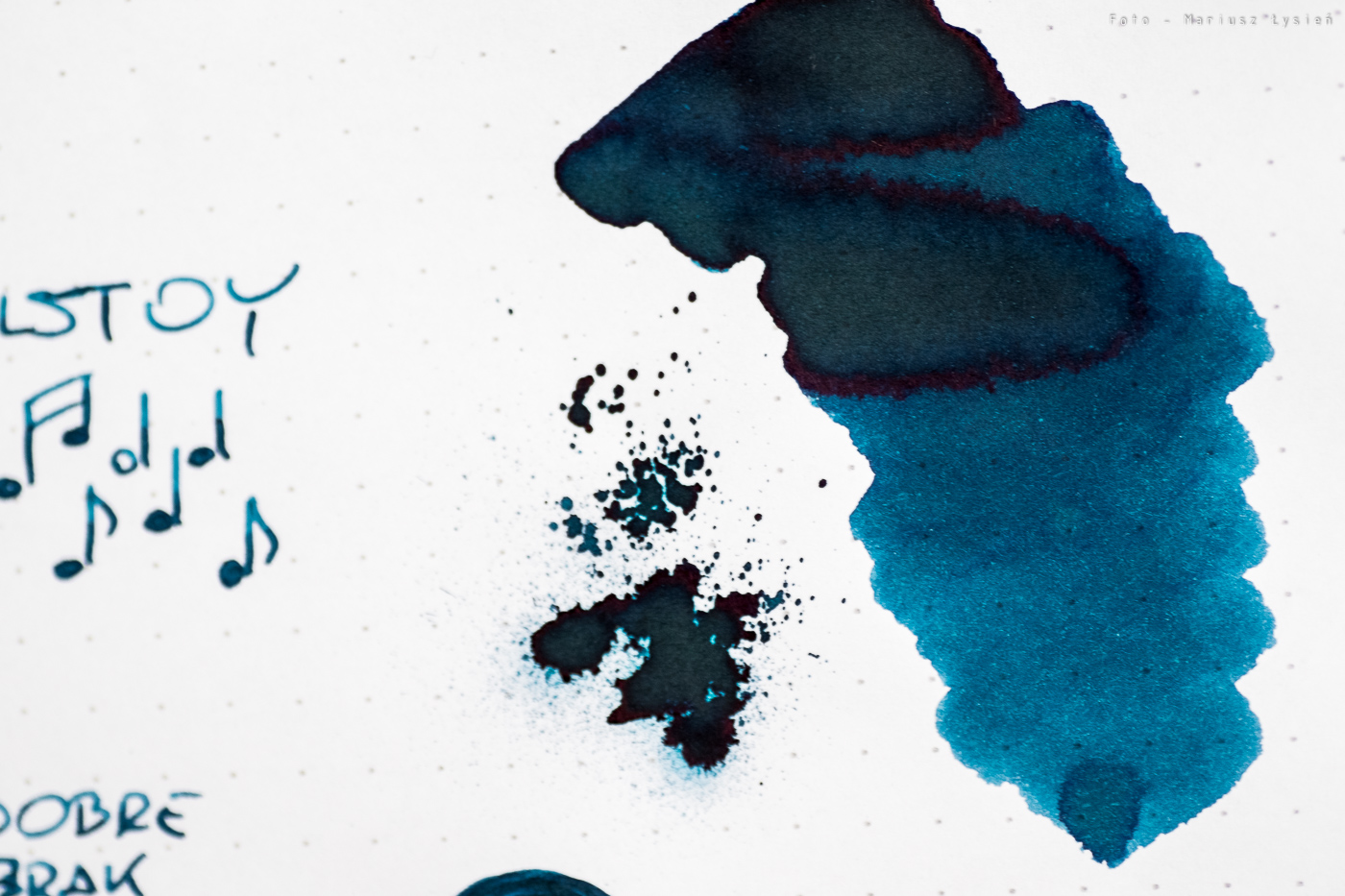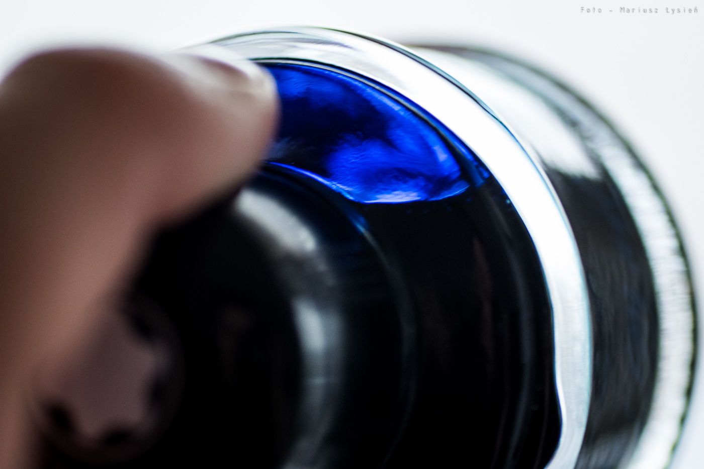 Niezależnie od tego, atrament ma ciekawy kolor. Jego niebieska barwa wpada momentami w granat. Samo nasycenie jest bardzo dobre, chociaż kolor nie ma nadmiernej saturacji. Finalnie powstał kolor, który jest w stanie odróżnić się od wielu innych niebieski atramentów. To bardzo dobrze. W przypadku kleksa możemy obserwować ładnie połyskujące obwódki.