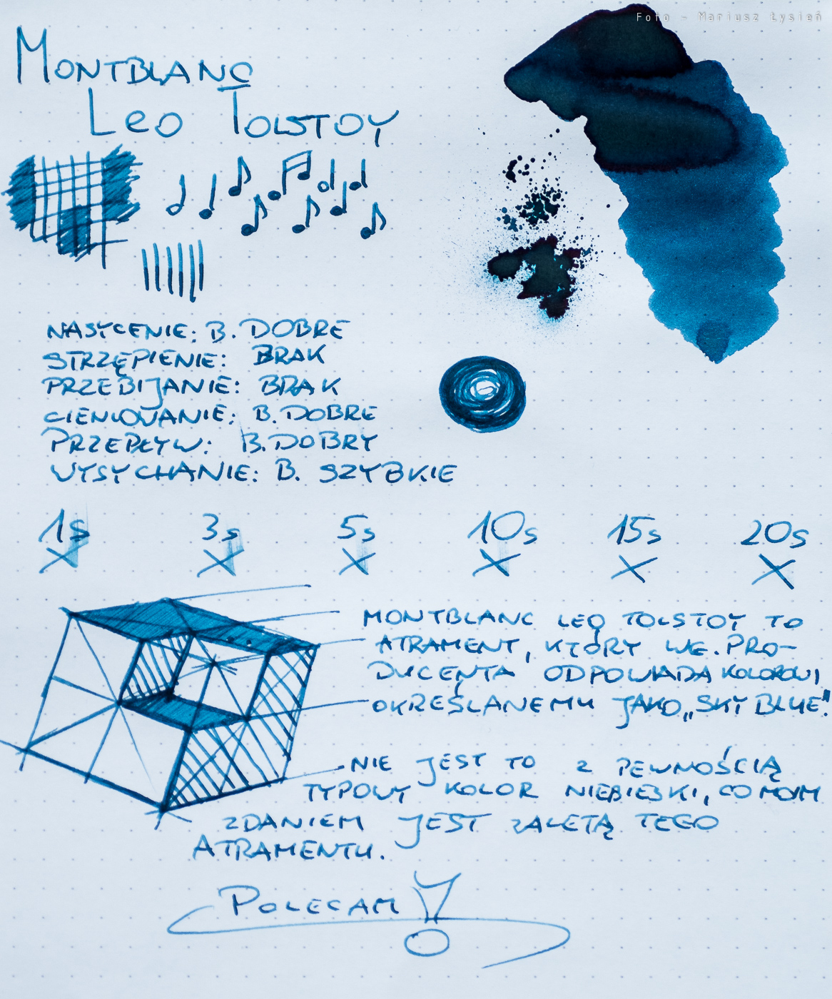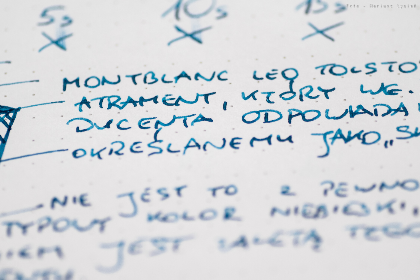 Montblanc Leo Tolstoy to bardzo dobry atrament, który polecam. Bardzo dobre parametry i ciekawy kolor sprawiają, że moim zdaniem jest on wart zakupu. Jeżeli jednak potrzebujecie atramentu permanentnego, to polecam wybrać coś innego – zresztą firma Montblanc ma w swojej regularnej ofercie dwa permanentne atramenty.