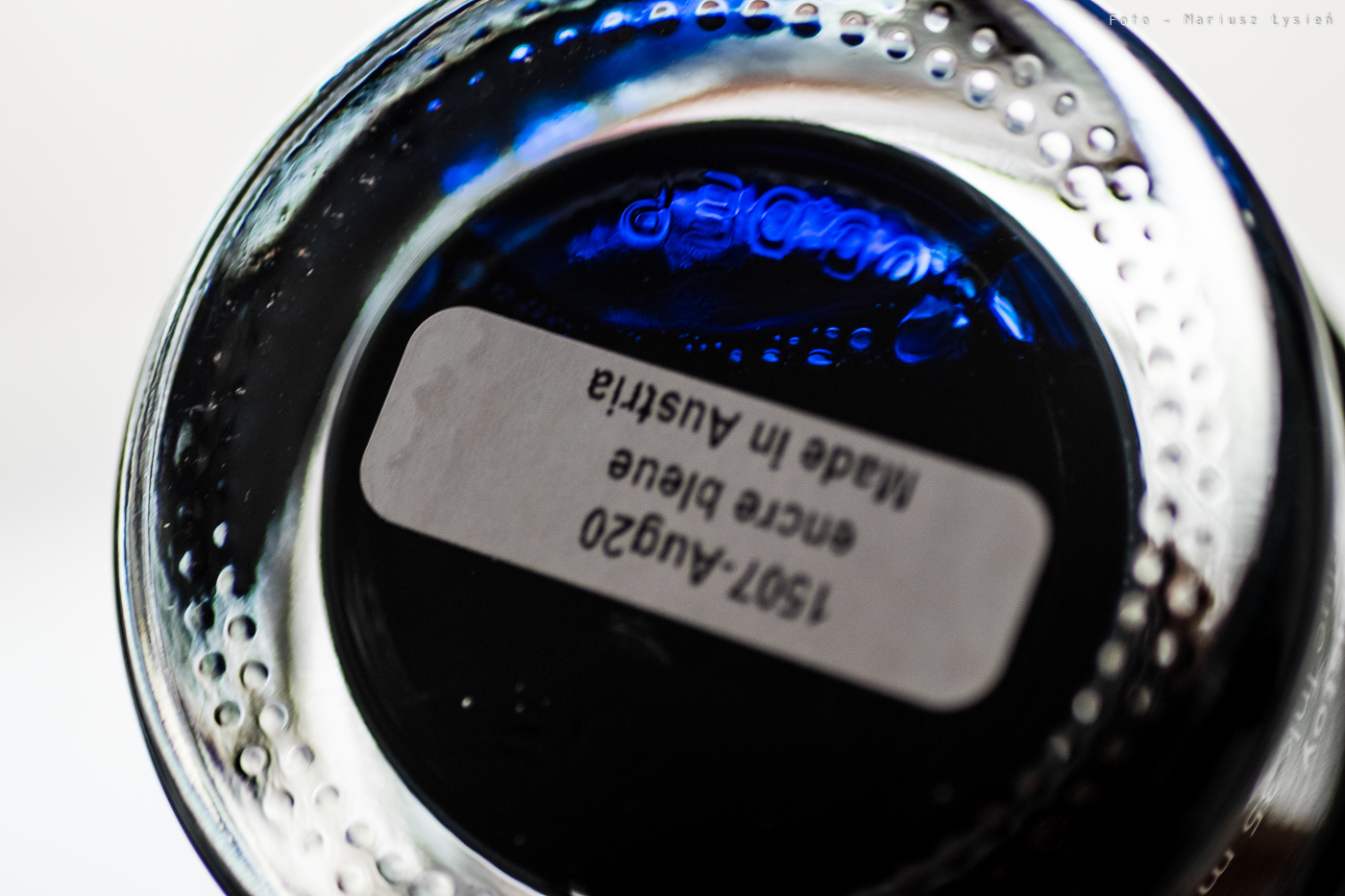 Wewnątrz opakowania znajdziemy okrągłą buteleczkę, która jest również jednym z dwóch typowych wzorów stosowanych w przypadku atramentu oferowanych jedynie przez krótki czas. Prezentuje się ona doskonale. Starannie naklejona etykieta powielająca wzór pudełka ładnie komponuje się z czarną zakrętką ozdobioną logiem producenta.