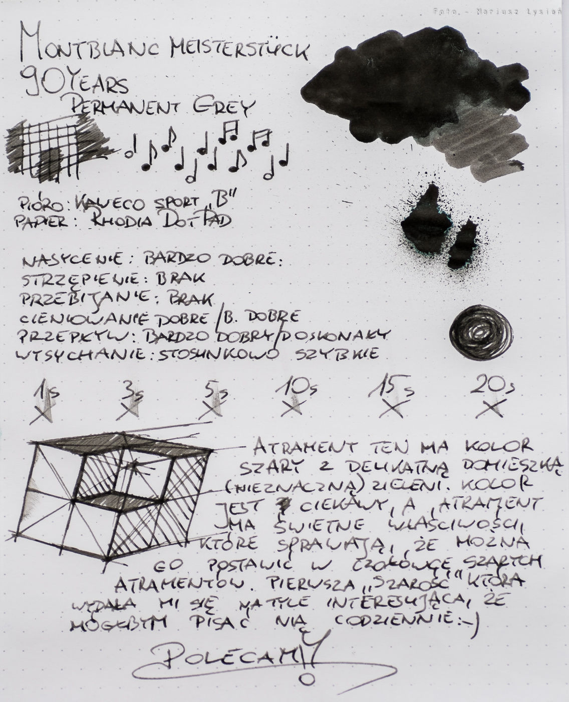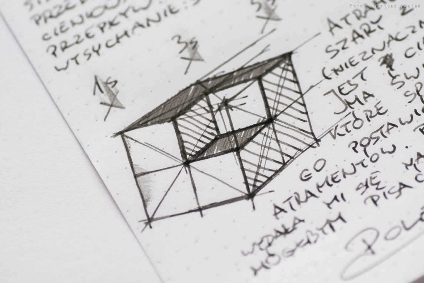Atrament zaprezentowany z okazji 90 rocznicy z pewnością spełnia pokładane w nim nadzieje. Świetne parametry, ciekawy i niesztampowy kolor, a to wszystko opakowane w piękną butelkę oraz atrakcyjne opakowanie, które przyciąga wzrok, pomimo, że zastosowano stonowane barwy. Zdecydowanie polecam miłośnikom „szarości”, a także wszystkim, którzy chcieliby spróbować czegoś innego, które jednak pozostaje użyteczne w codziennej pracy (wspominam o tym, gdyż nie zawsze szare atramenty są na tyle czytelne aby wygodnie korzystało się z nich w codziennych zapiskach). Świetny atrament – polecam.