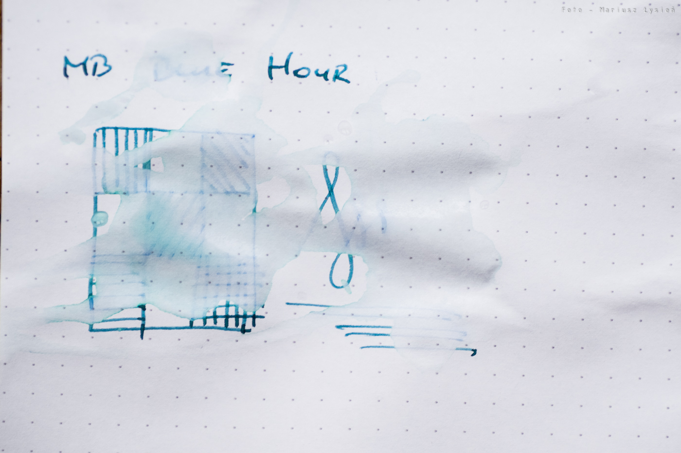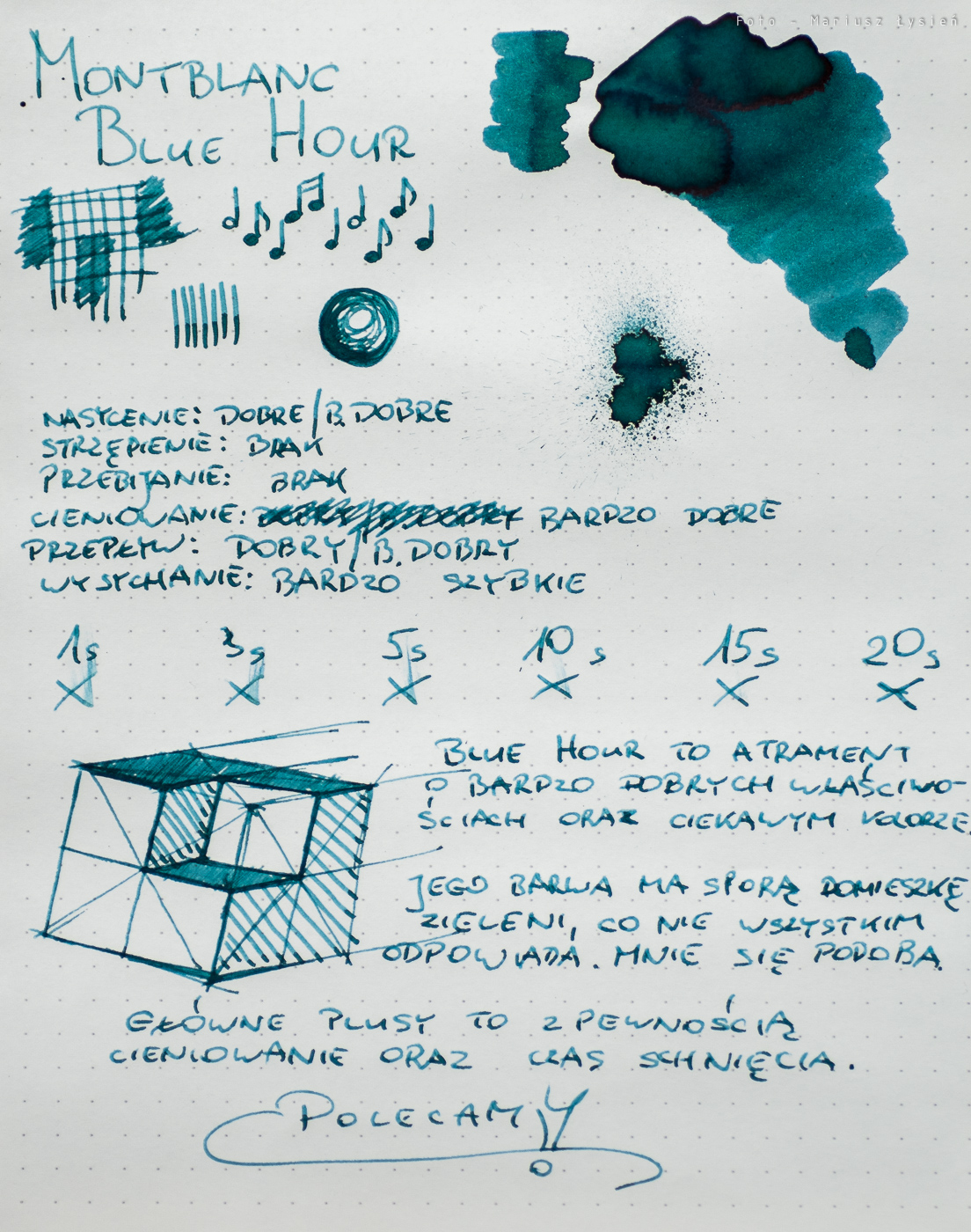 Jeżeli tylko kupimy ten atrament ze świadomością, że nie jest on typowo niebieskim atramentem oraz jesteśmy w stanie pogodzić się ze słabą wodoodpornością, to wszystkie pozostałe parametry stoją na wysokim poziomie. Cieniowanie, przepływ, bądź czas schnięcia są z pewnością bardzo dobre. Ja Blue Hour polecam, gdyż po przeczytaniu opinii w Internecie podchodziłem do niego z pewną rezerwą, a ostatecznie zostałem pozytywnie zaskoczony.