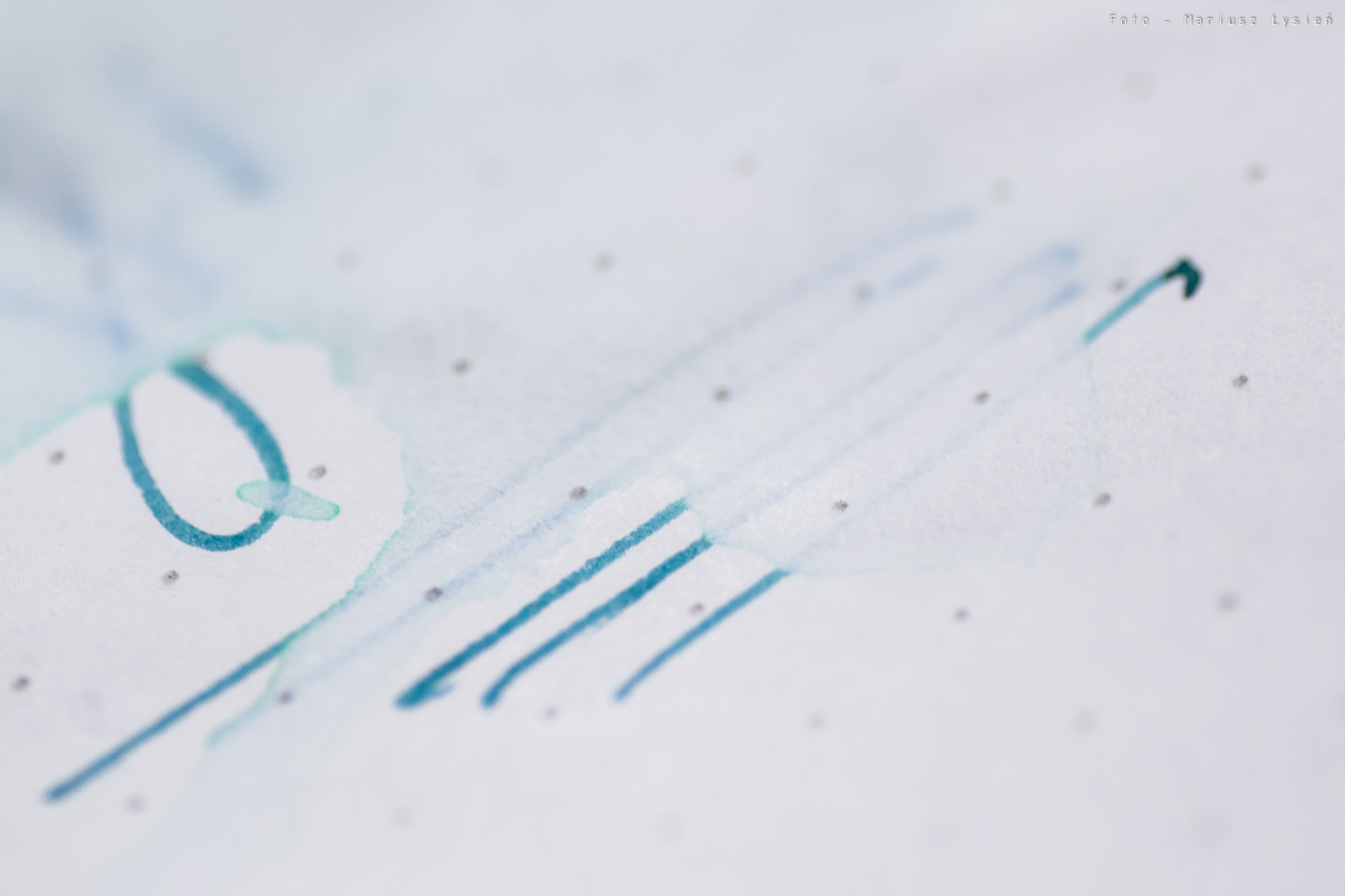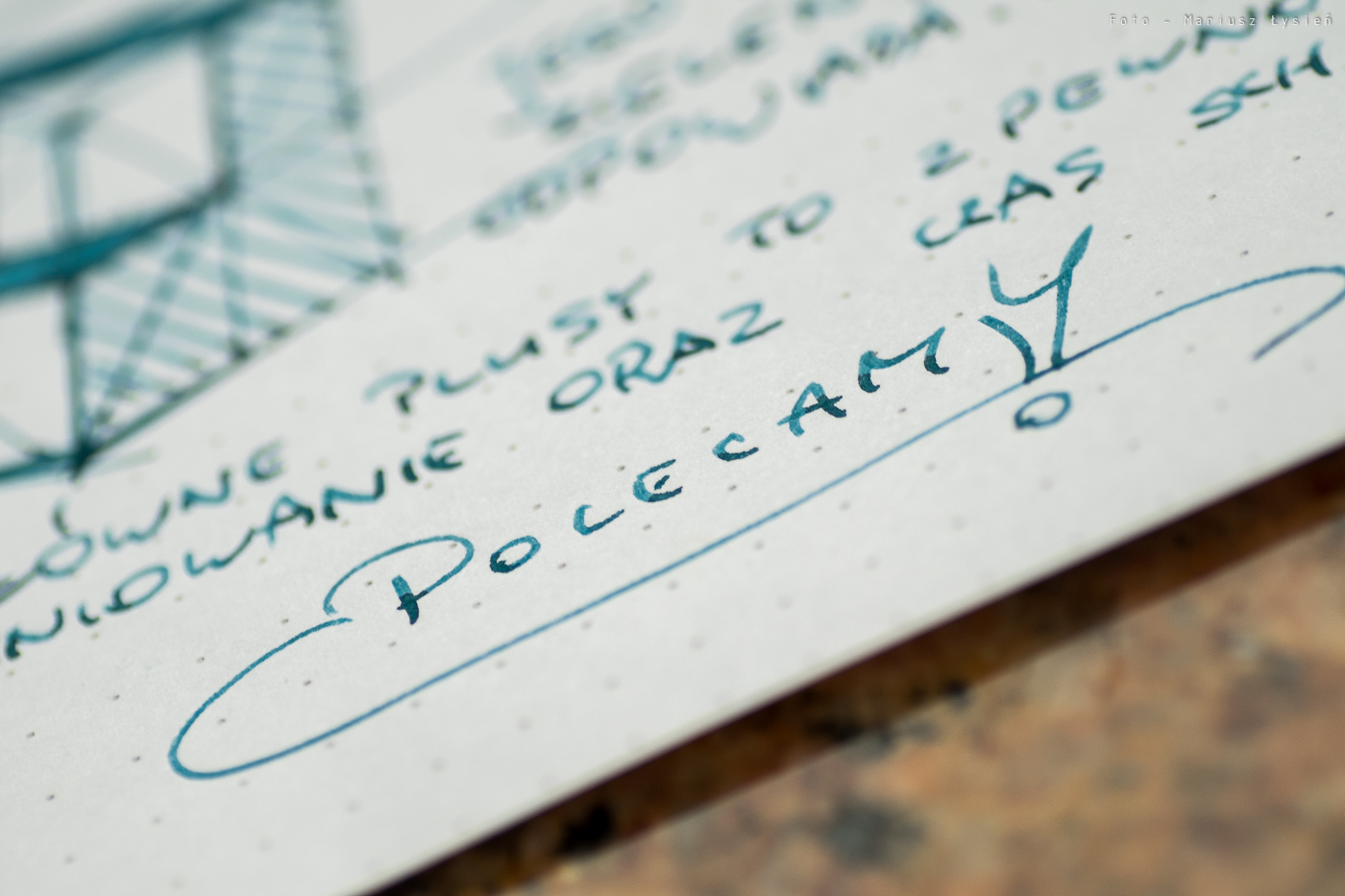 W przyborach piśmienniczych z kolekcji Blue Hour dużą część kolorystyki stanowią elementy barwy niebieskiej. Podobnie z atramentem – klient kupujący inkaust o nazwie Blue Hour spodziewa się zobaczyć na papierze kolor niebieski. W kałamarzu zresztą widzimy ciecz, która jest jednoznacznie niebieska. Szybko jednak przychodzi zaskoczenie, gdy pisany przez nas tekst prezentuje kolor zielony. Dokładniej rzecz biorąc, jest to kolor niebiesko-zielony i prawdę powiedziawszy trudno jednoznacznie określić, którego z tych dwóch kolorów jest więcej. Szczerze mówiąc, dobór ostatecznej barwy atramentu jest dosyć nietypowy, chociaż muszę przyznać, że mnie kolor się bardzo podoba. Napisany przez nas tekst jest czytelny, a cieniowanie jest naprawdę bardzo dobre. Właściwie każda z cech tego atramentu jest na tyle dobra, że jeżeli tylko kolor Wam odpowiada, to mogę Blue Hour śmiało polecić.