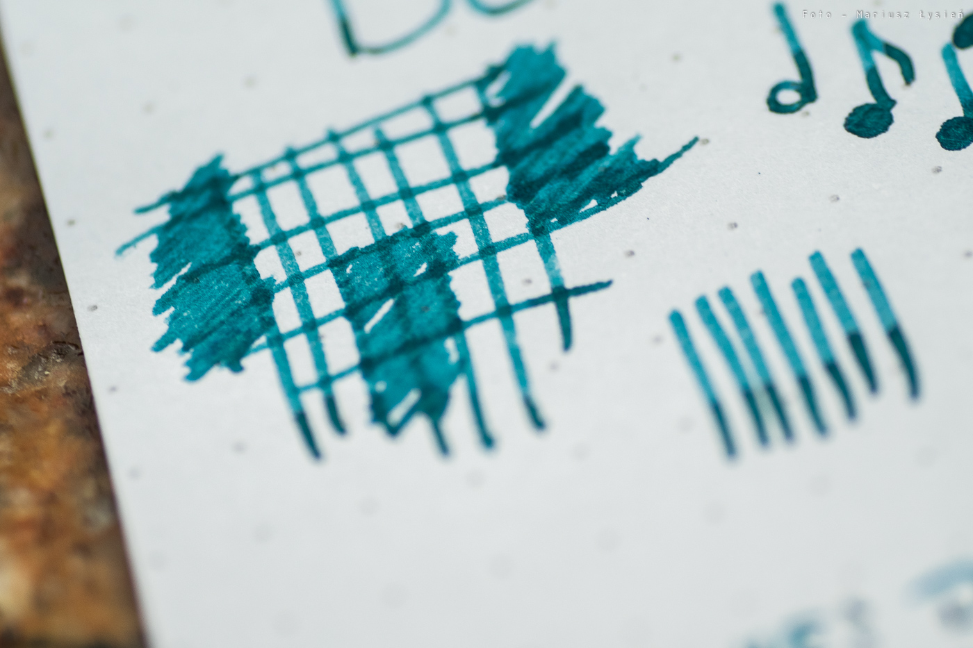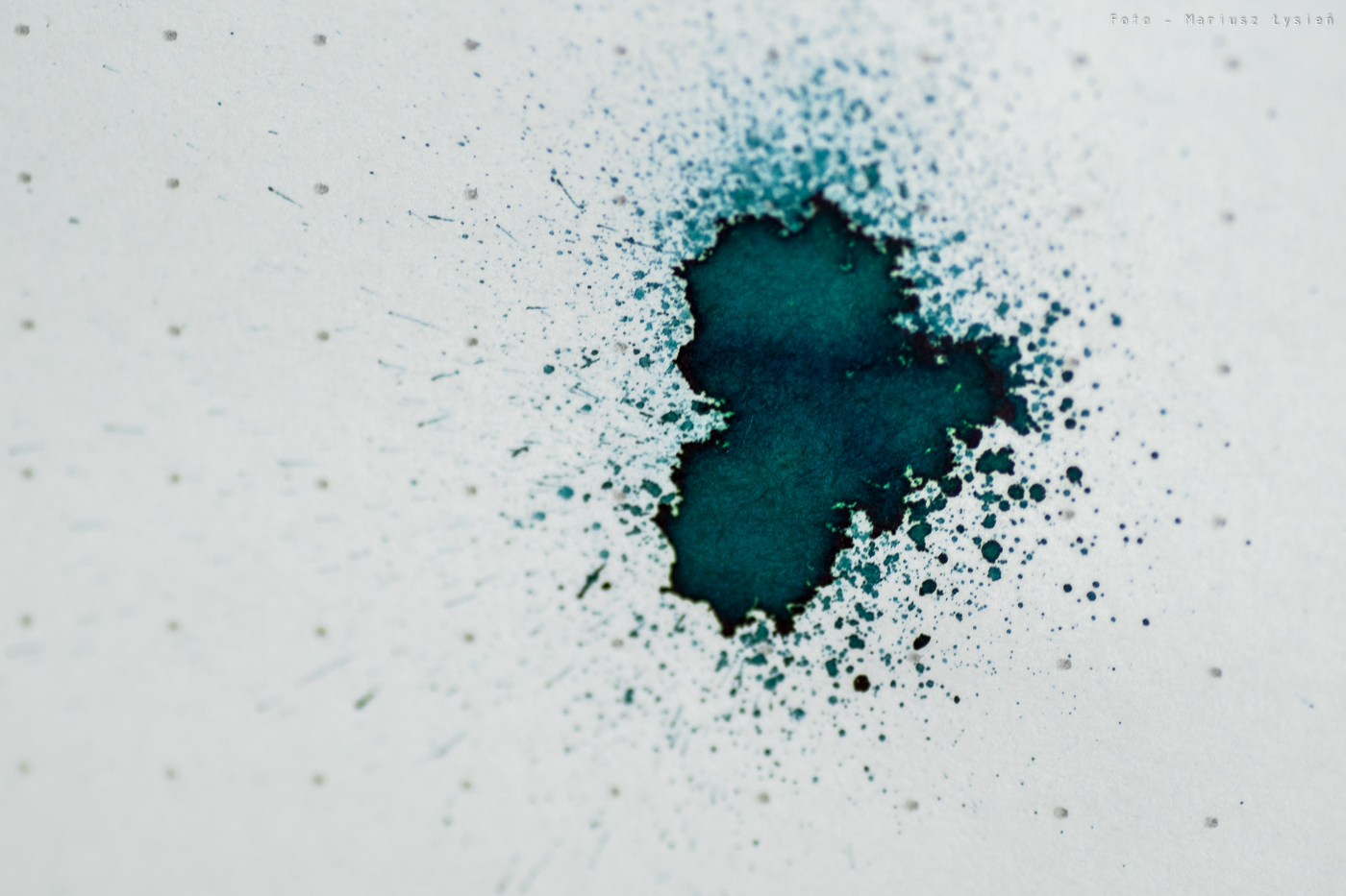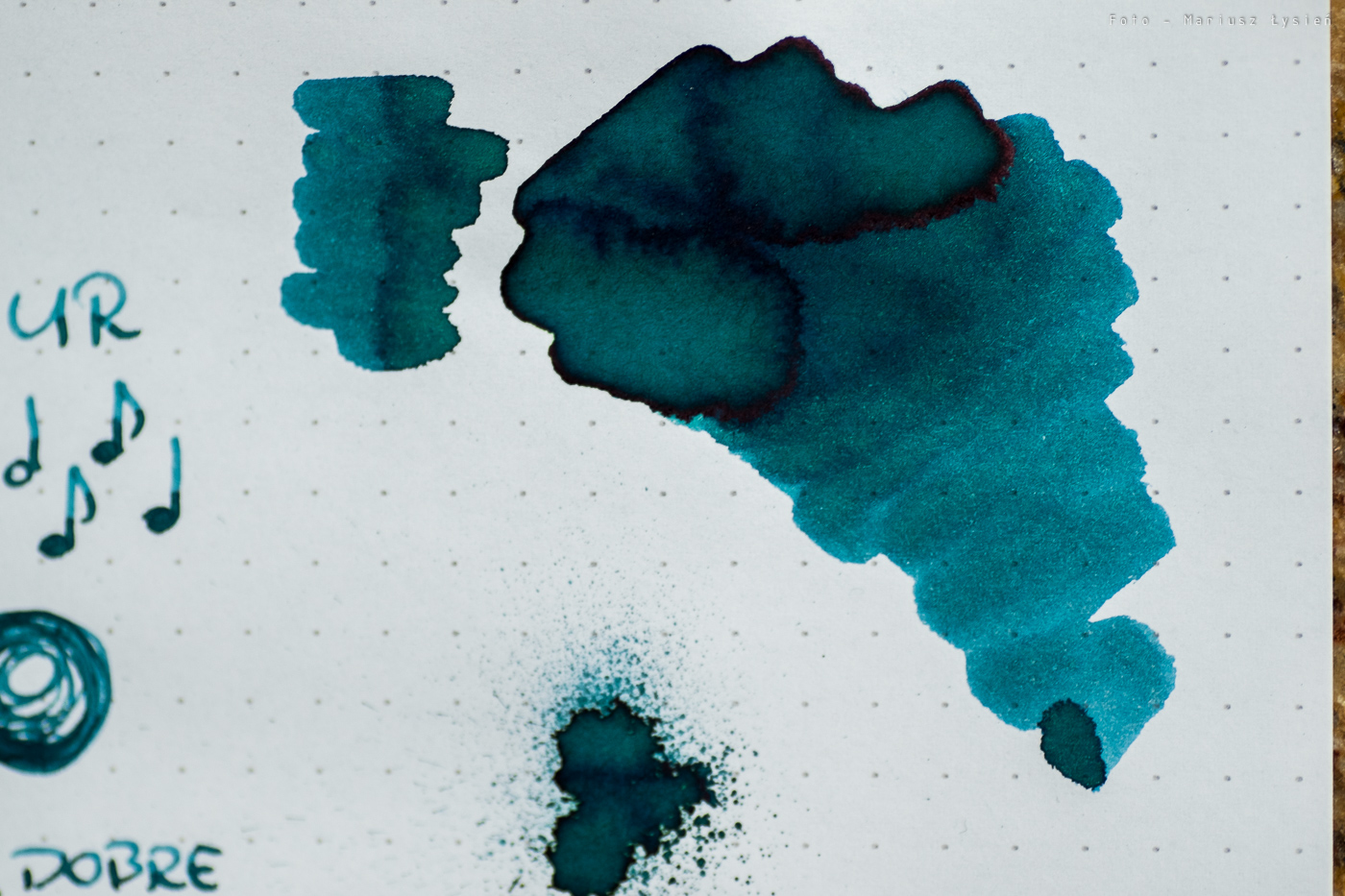 Dlaczego więc zdarza się czytać opinie negatywne o tym atramencie? Przeważnie dotyczą one właśnie tego, że pomimo wyrazu „Blue” w nazwie, z pewnością nie jest to atrament typowo niebieski. Jeżeli jednak zastanowić się, jak faktycznie wygląda niebo podczas przejścia z końcowej fazy zachodu słońca w noc, to generalnie okaże się, że dobór koloru jest całkiem trafny. Łączy się wtedy bowiem granat nocnego nieba z ostatnimi (ciepłymi) barwami zachodzącego słońca. A niebieski + żółty (który kojarzy nam się z promieniami słońca) musi dać w ostatecznym rezultacie zieleń. Natomiast trzeba przyznać, że z pewnością nie jest to typowa zieleń. Kolor jest złożony i poza kolorem niebieskim, i zielonym, mamy tu odrobinę turkusu oraz innych domieszek, które owocują ciekawym i moim zdaniem wartym uwagi kolorem.