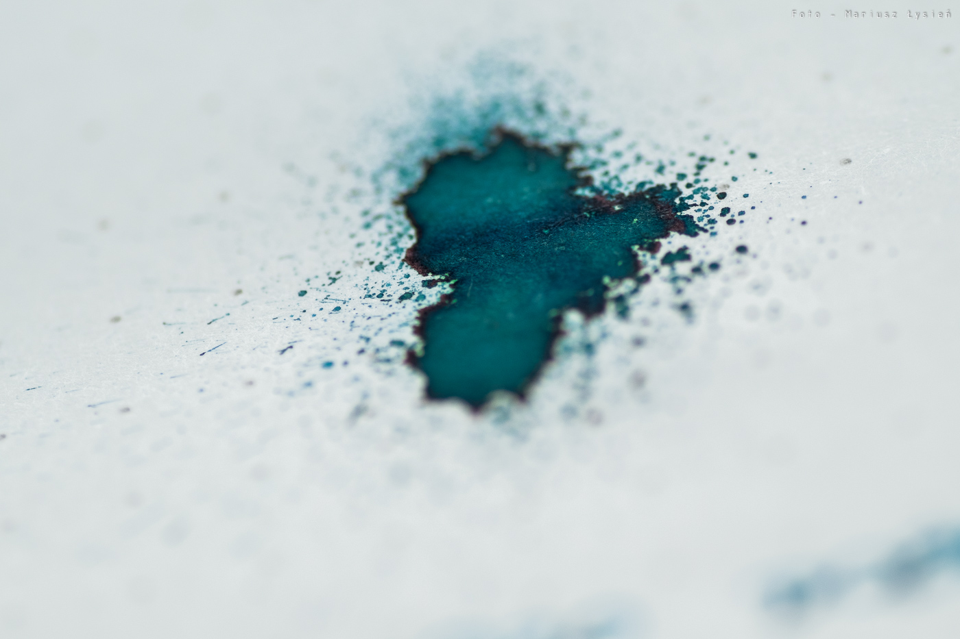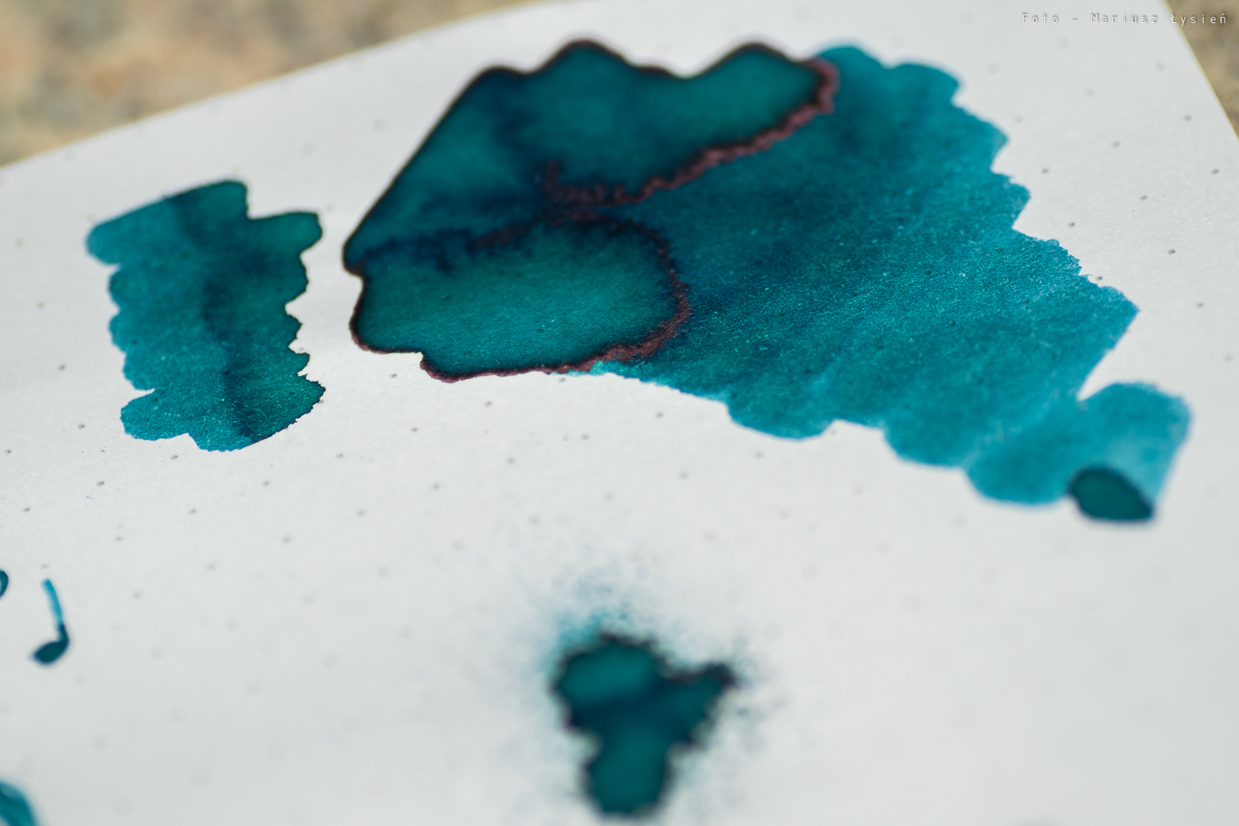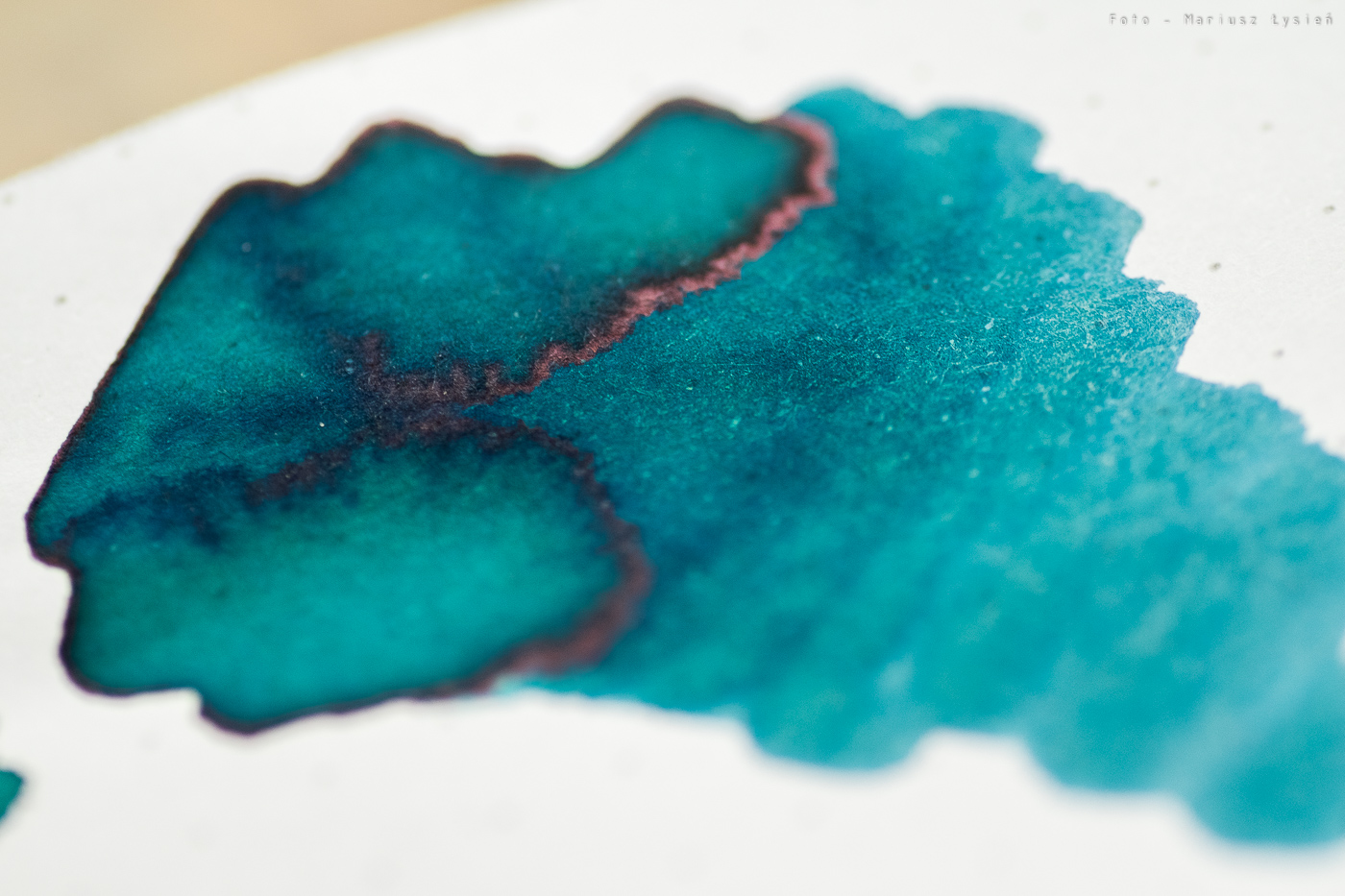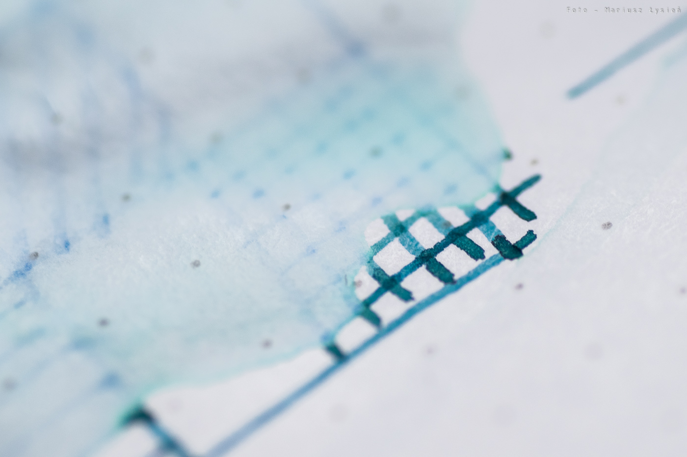 Dlaczego więc zdarza się czytać opinie negatywne o tym atramencie? Przeważnie dotyczą one właśnie tego, że pomimo wyrazu „Blue” w nazwie, z pewnością nie jest to atrament typowo niebieski. Jeżeli jednak zastanowić się, jak faktycznie wygląda niebo podczas przejścia z końcowej fazy zachodu słońca w noc, to generalnie okaże się, że dobór koloru jest całkiem trafny. Łączy się wtedy bowiem granat nocnego nieba z ostatnimi (ciepłymi) barwami zachodzącego słońca. A niebieski + żółty (który kojarzy nam się z promieniami słońca) musi dać w ostatecznym rezultacie zieleń. Natomiast trzeba przyznać, że z pewnością nie jest to typowa zieleń. Kolor jest złożony i poza kolorem niebieskim, i zielonym, mamy tu odrobinę turkusu oraz innych domieszek, które owocują ciekawym i moim zdaniem wartym uwagi kolorem.