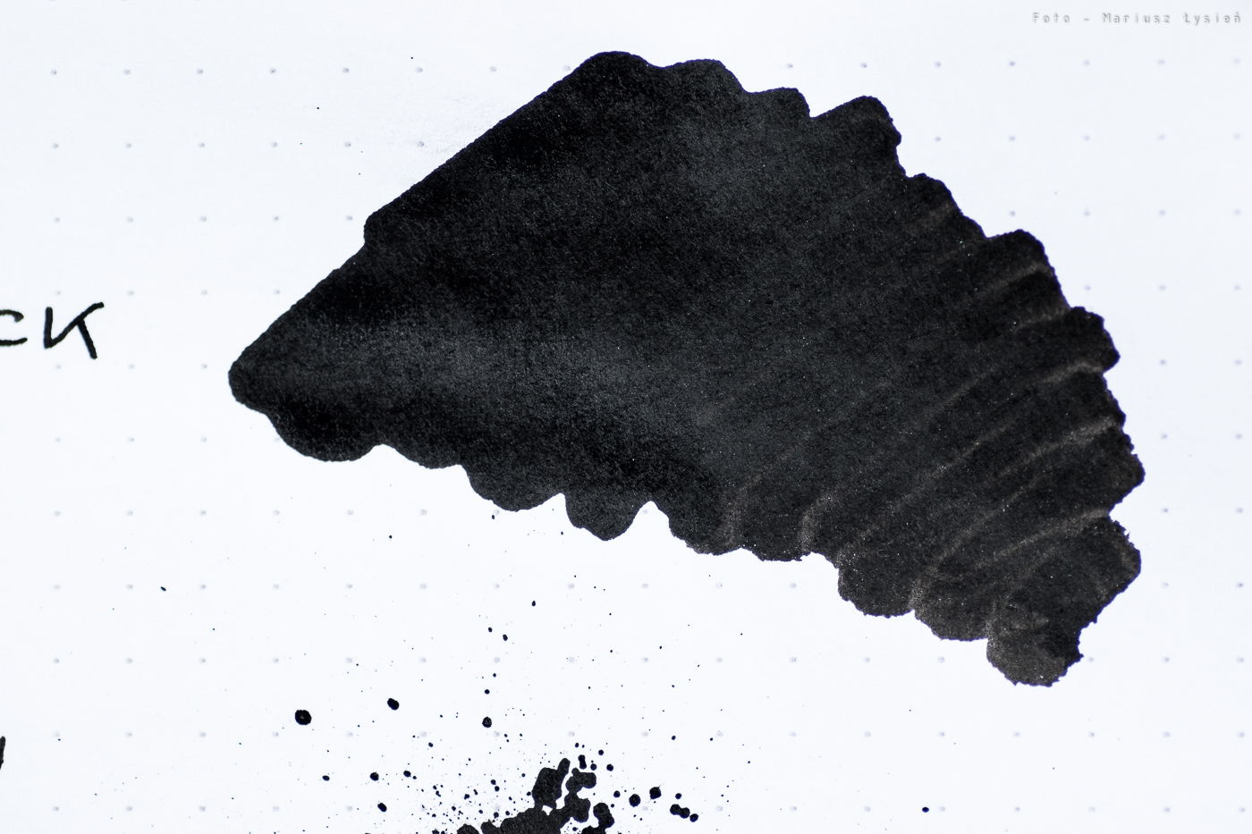 Nie tak dawno pisałem w teście Aurory Black, o tym, że jest ona jednym z najczęściej wybieranych czarnych atramentów przez wzgląd na głęboką czerń. W przypadku Permanent Black jest podobnie – czerń jest głęboka, chociaż w przypadku kleksa ma trochę odmienną charakterystykę. Tekst jest intensywnie czarny. Oczywiście także i w tym przypadku mamy mocno ograniczone cieniowanie, czym akurat nie powinniśmy się zbytnio przejmować – wszak założeniem jest smolista czerń.