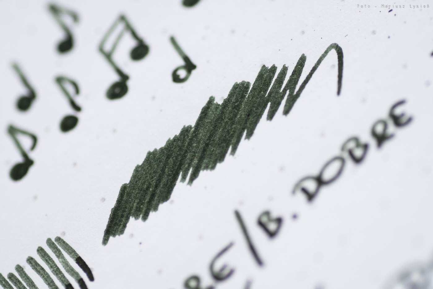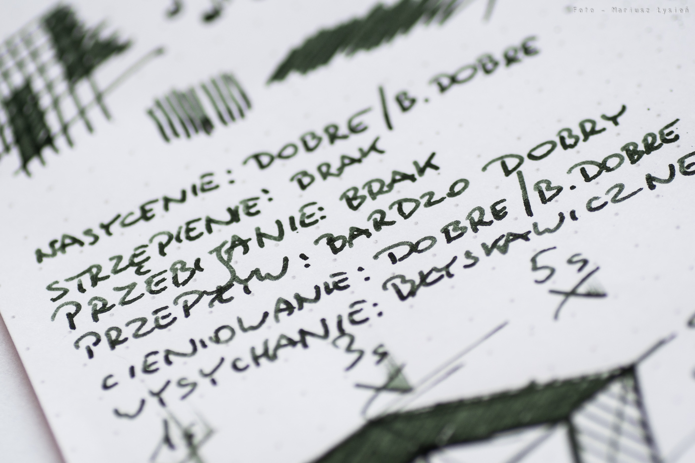 Jeżeli chodzi o nasycenie, to moim zdaniem jest ono bardzo dobre. Uważam, że należy rozdzielić ocenę samej intensywności koloru, od czytelności pisanego przez nas tekstu. W tym przypadku nasze notatki są w doskonale czytelne. Zgniłozielony kolor prezentuje się ciekawie i elegancko zarazem. Ocenę nasycenia „dobre” umiejscowiłem głównie przez fakt, że dla niektórych poziom „bardzo dobre”, czy „doskonałe” to niezwykle intensywna zieleń, która wręcz „wyrasta” z kartki.