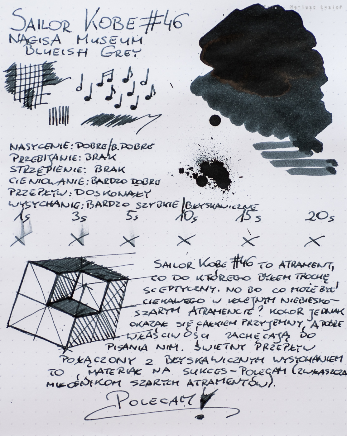 Jeżeli lubicie szare bądź szaroniebieskie atramenty – rozważcie zakup tego atramentu. Świetne parametry i niezła wodoodporność sprawiają, że warto się nim zainteresować. Gdybym miał mniej szarych atramentów w swoim posiadaniu, to rozważyłbym zakupienie butelki Sailora KOBE #46. Polecam.