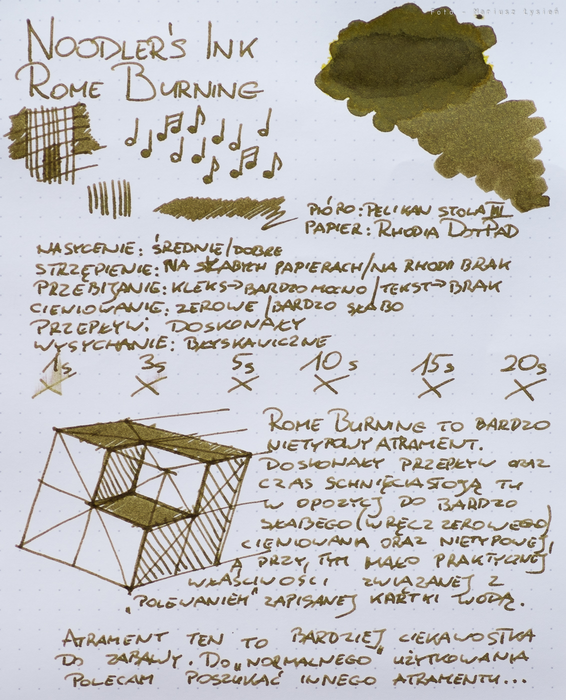 Do plusów można zaliczyć jednak czas wysychania. Nawet w przypadku dosyć mokrej stalówki pióra Pelikan Stola III i papieru Rhodia DotPad, po upływie około 3 sekund uzyskujemy rezultat, który moim zdaniem można już uznać za w pełni zadowalający. To naprawdę świetny wynik!