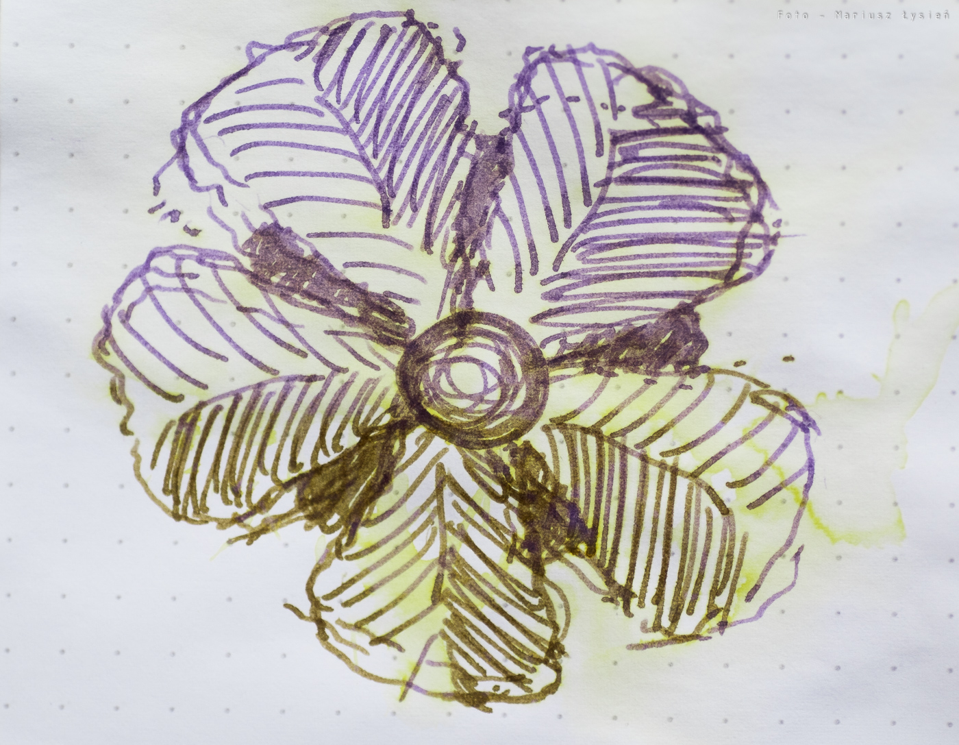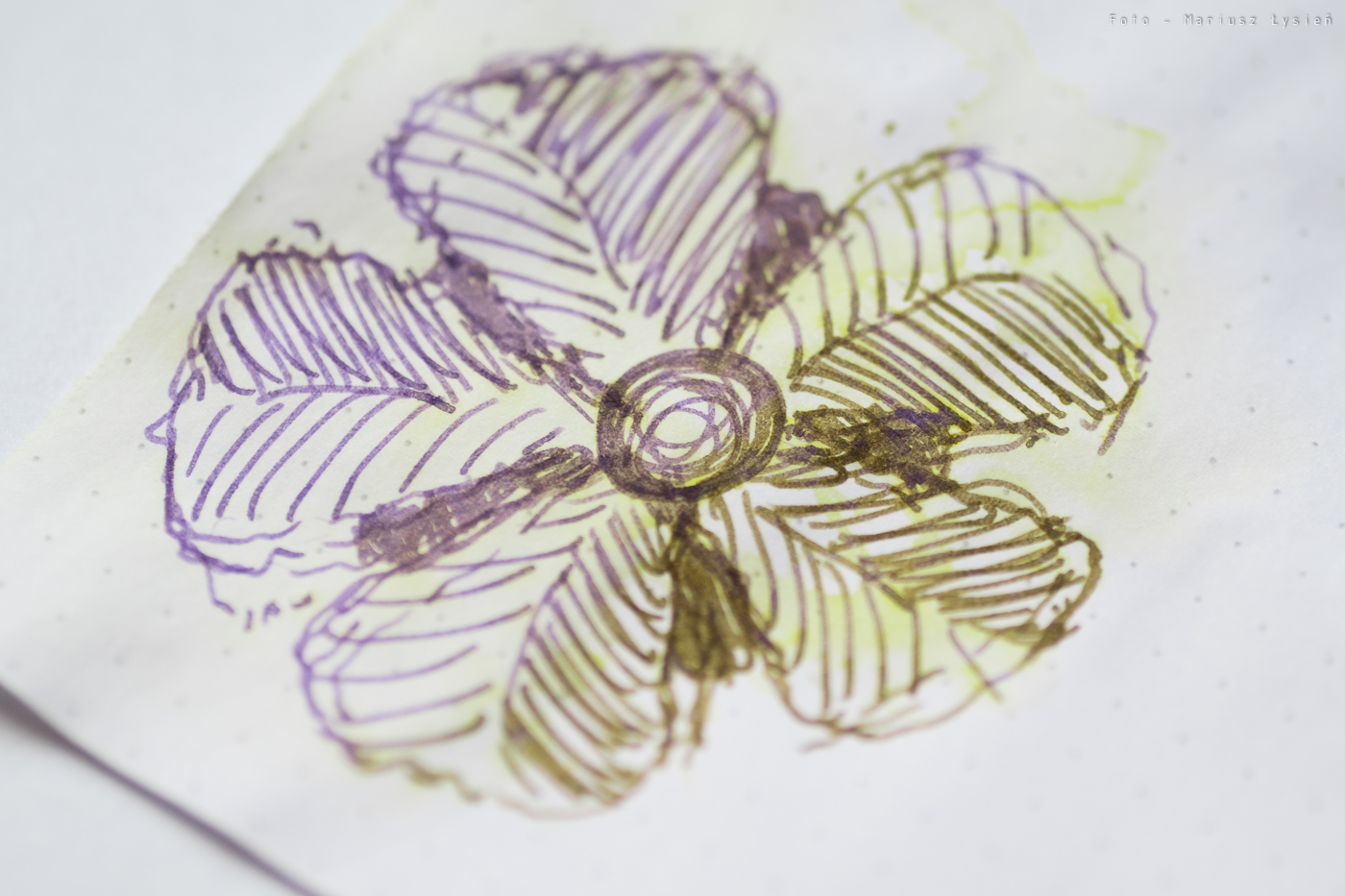 Jeżeli chodzi o wodoodporność to pod tym względem jest bardzo dobrze. Jest to związane z tym o czym wspomniałem na początku. Formuła atramentu została tak opracowana, że podczas kontaktu atramentu z wodą, wypłukaniu ulega żółtawobrązowe zabarwienie, natomiast na papierze pozostaje fioletowa baza, która sprawia wrażenie bardzo trwałej, gdyż woda w ogóle jej nie narusza. Z jednej strony jest to ciekawa właściwość, przez którą atrament zdobył w większości swoją sławę. Z drugiej jednak strony, jest to o tyle mało praktyczne, że mało komu będzie się chciało zamaczać swoje notatki, a jeżeli już chcemy pisać na fioletowo, to prostszym rozwiązaniem jest po prostu zakup fioletowego atramentu.