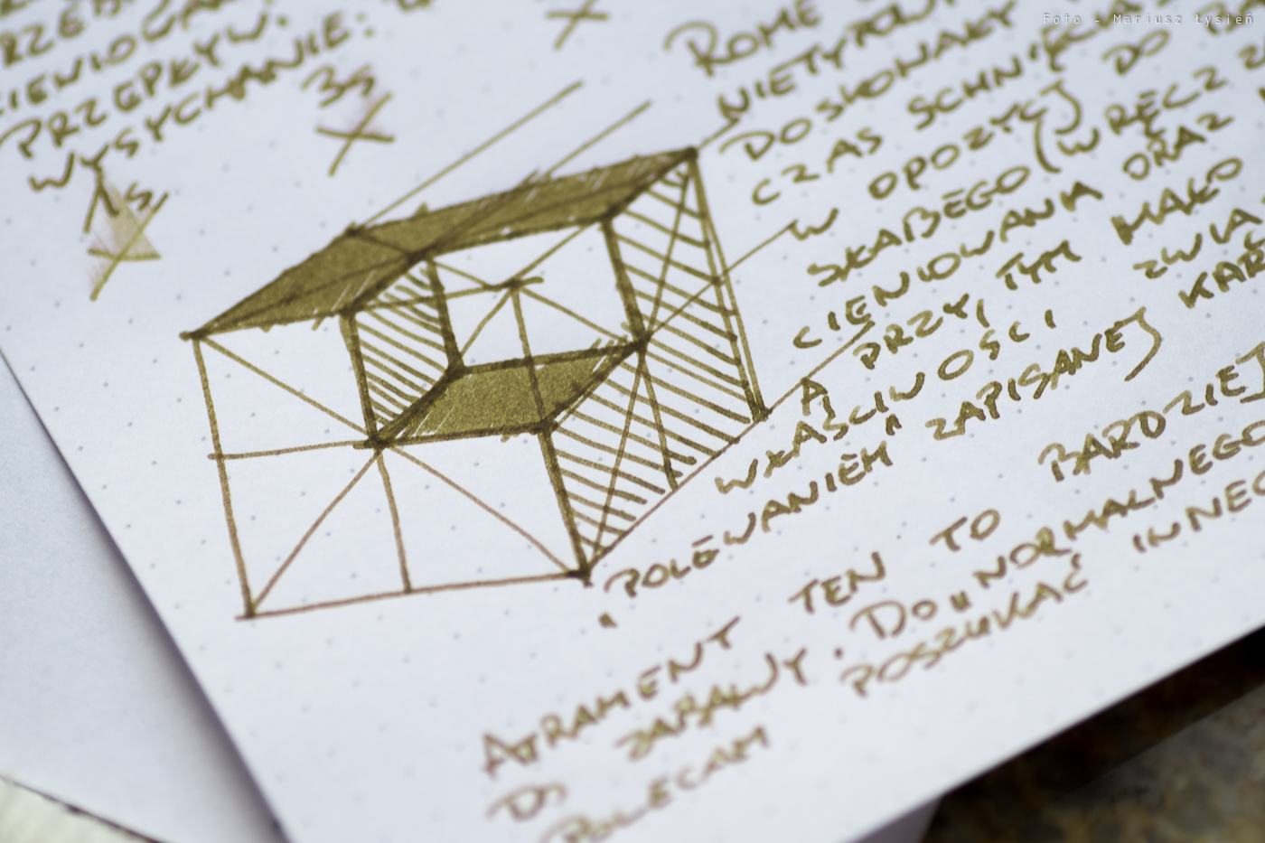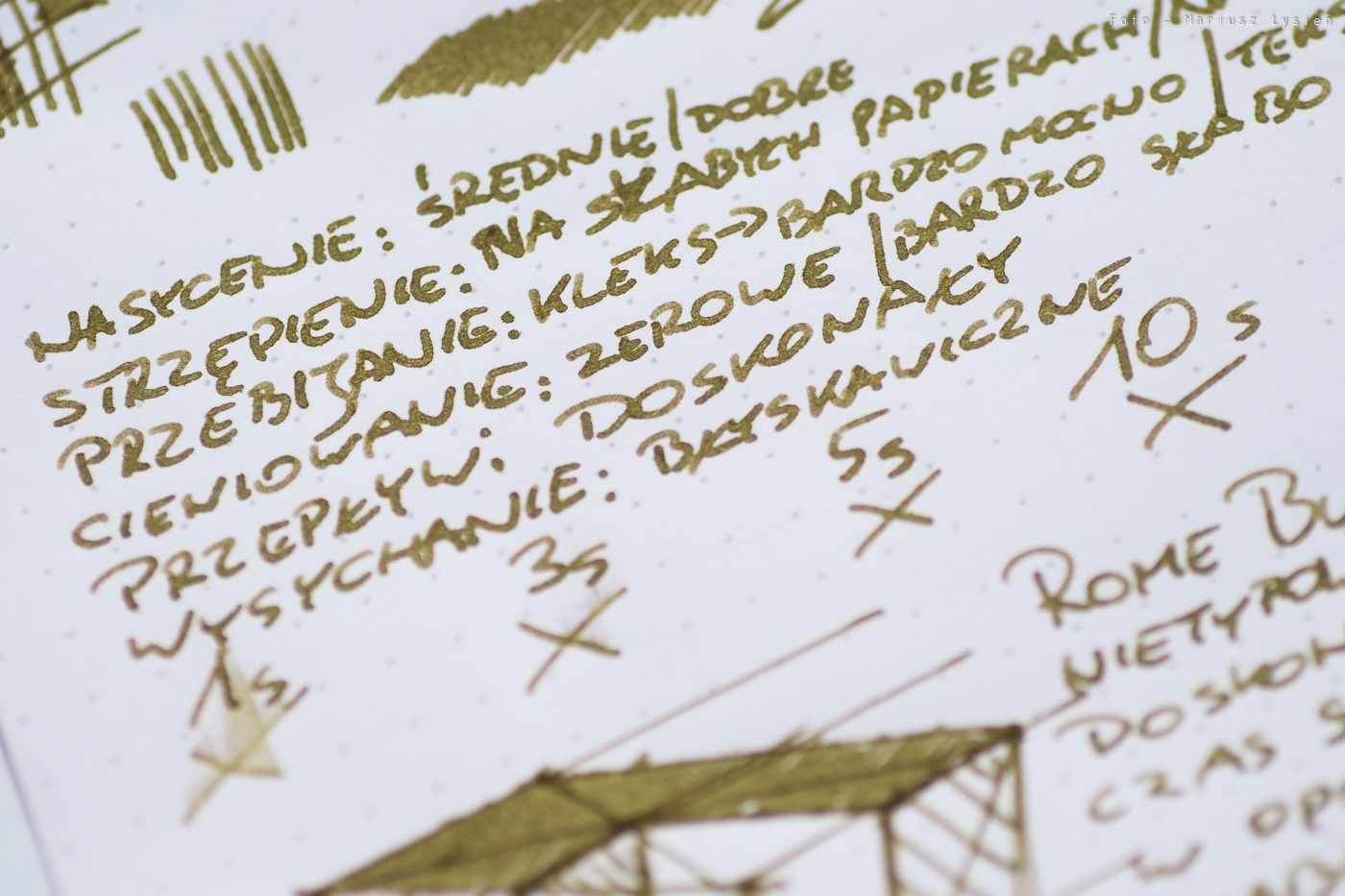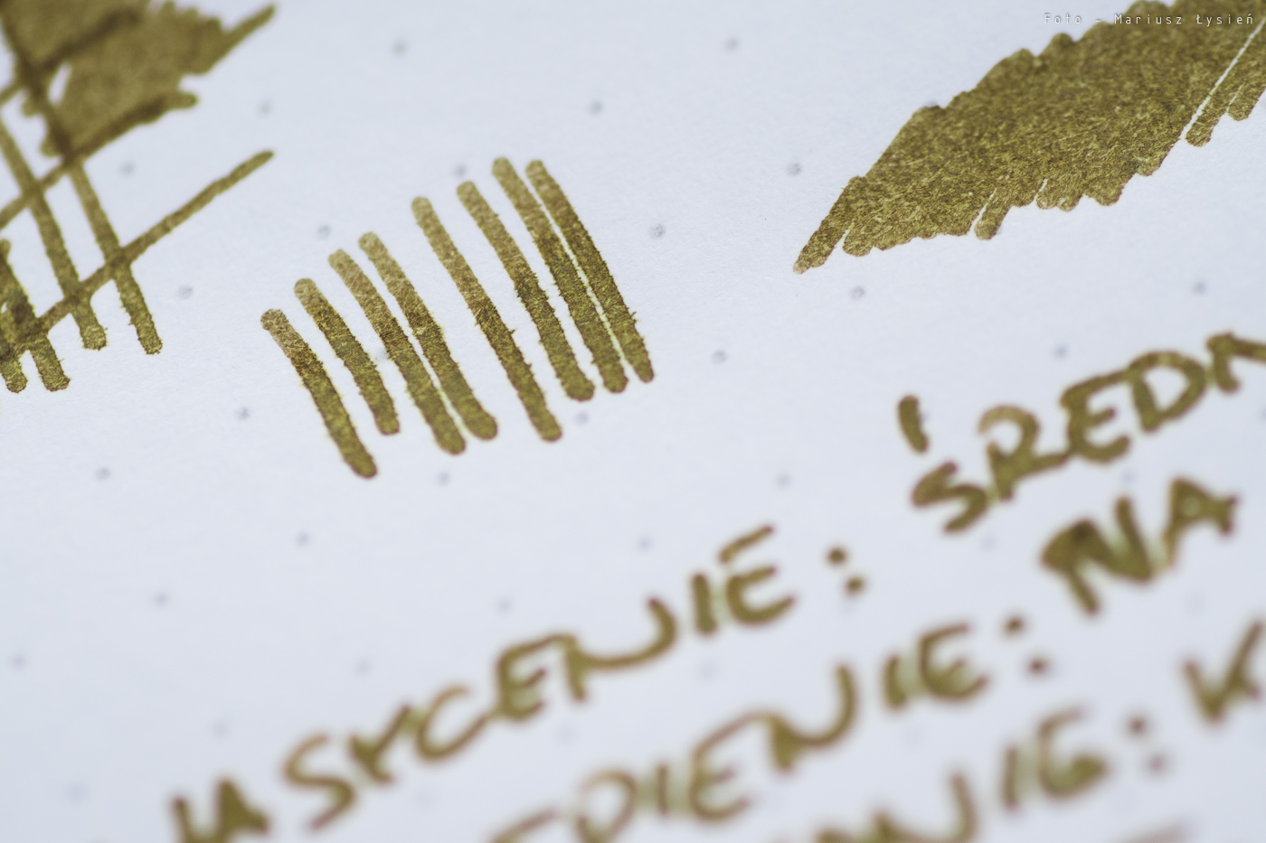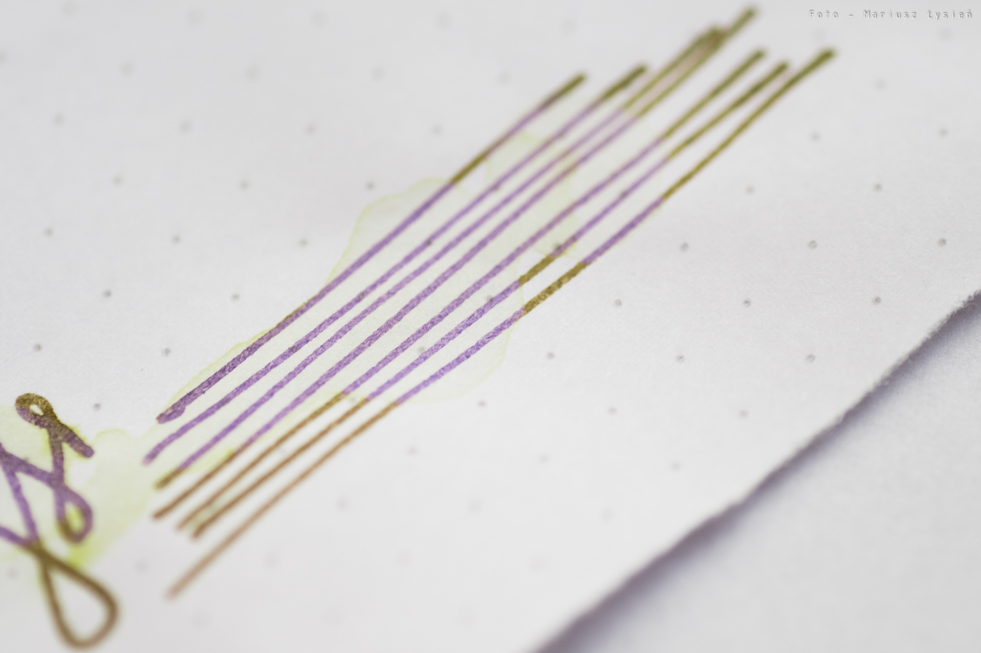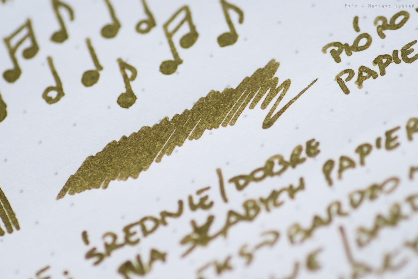 Normalnie atrament ma kolor żółto zgniłozielony. Jest też pewna domieszka koloru brązowego. Barwa jest nietypowa, i szczerze powiedziawszy trudno określić czy jest ona atrakcyjna. Dla mnie przeciętnie ciekawy kolor wynika nie tylko z samej barwy (i nasycenia), ale też z uwagi na praktycznie zerowe cieniowanie. Napisany przez nas tekst będzie wyglądał podobnie do napisanego mazakiem.