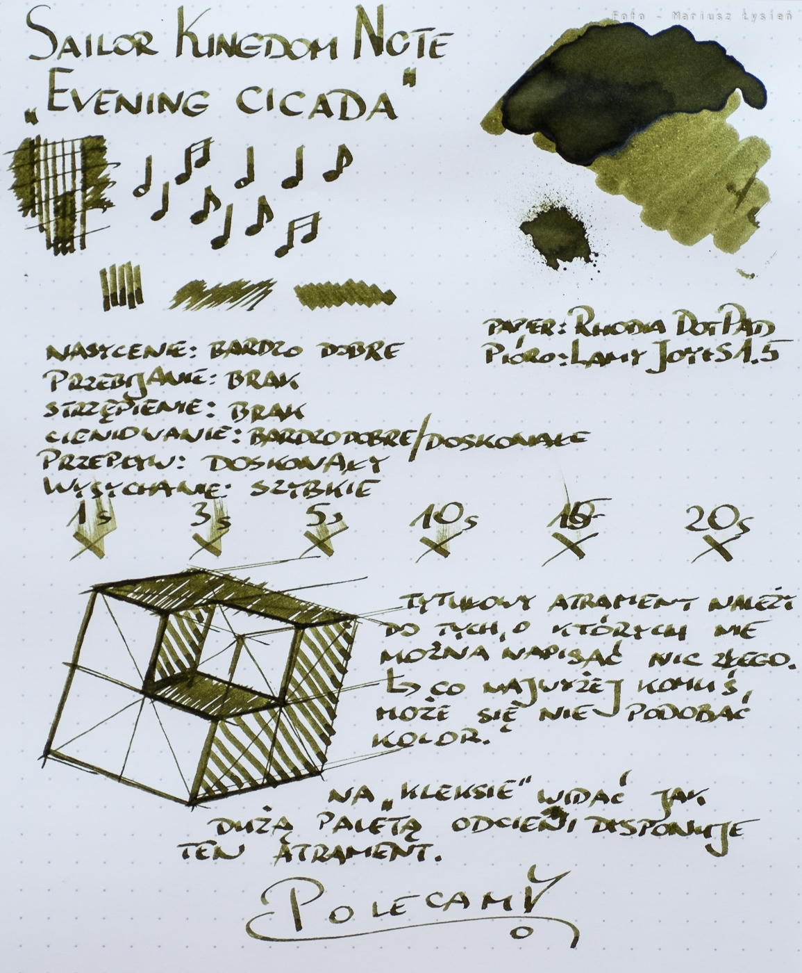 Z jednej strony jest to bardzo ciekawy i dobry atrament, który z chęcią widziałbym w swoim zbiorze. Z drugiej strony, jest to atrament, który bałbym się stosować na jakichkolwiek dokumentach, co do których chciałbym mieć pewność, że mój podpis (bądź notatki) zachowają się po umyślnym (bądź nie) zalaniu wodą. Polecam tylko i wyłącznie pod warunkiem, że wodoodporność nie ma dla Was kompletnie żadnego znaczenia.
