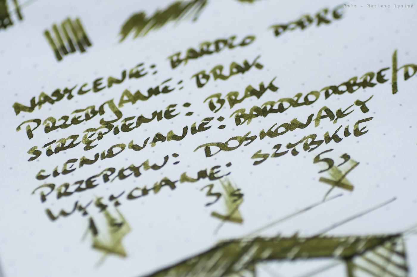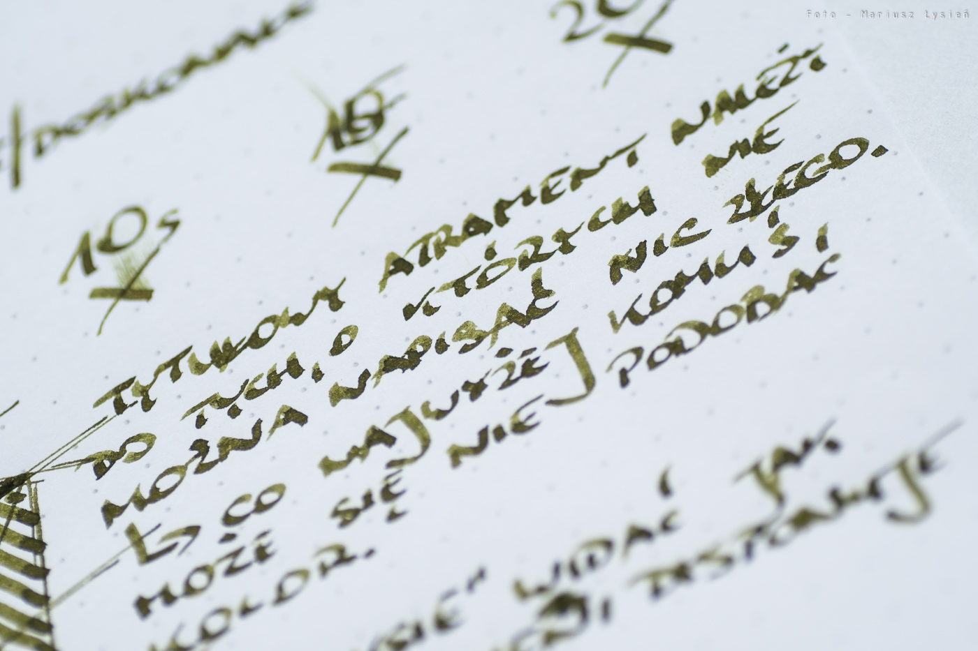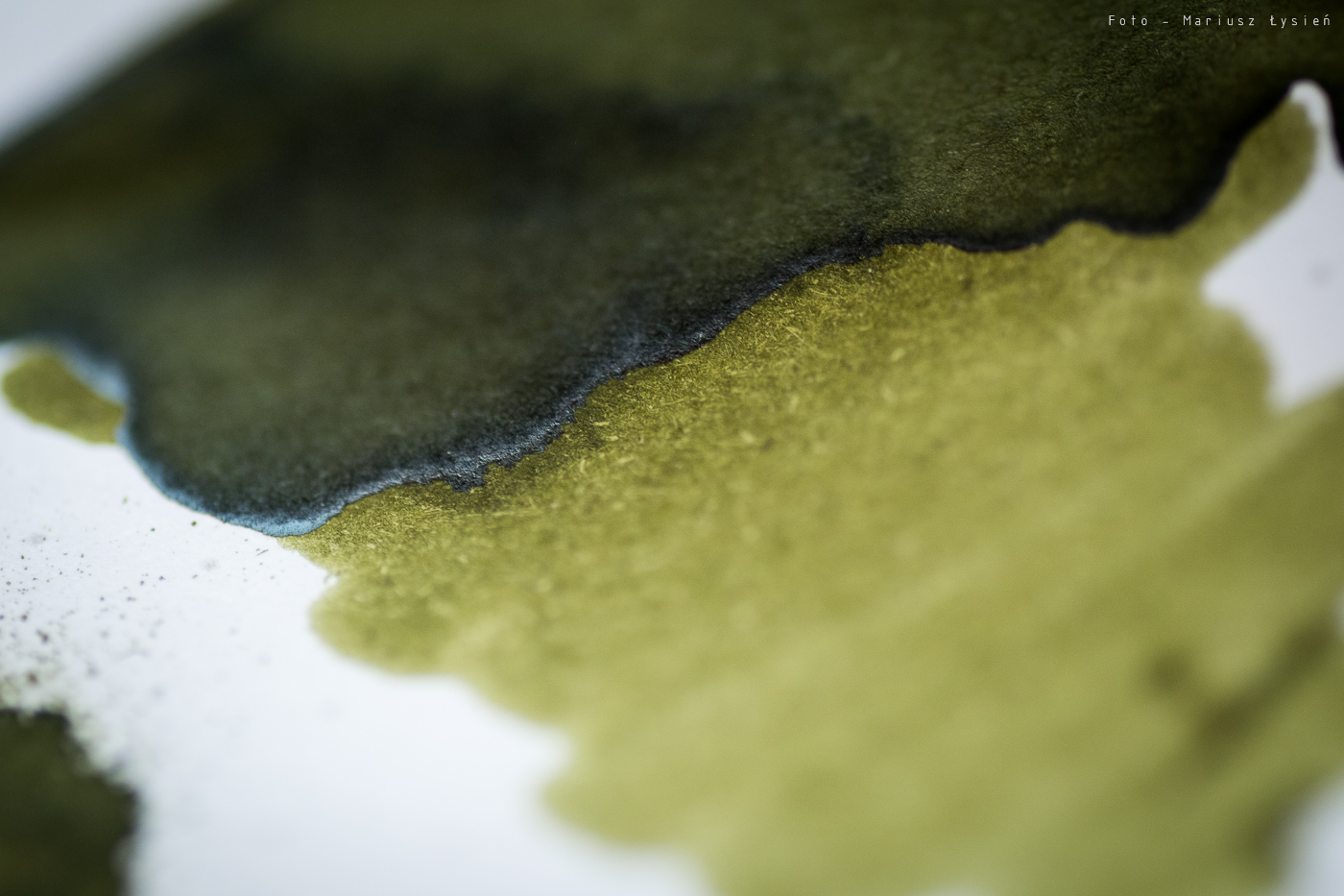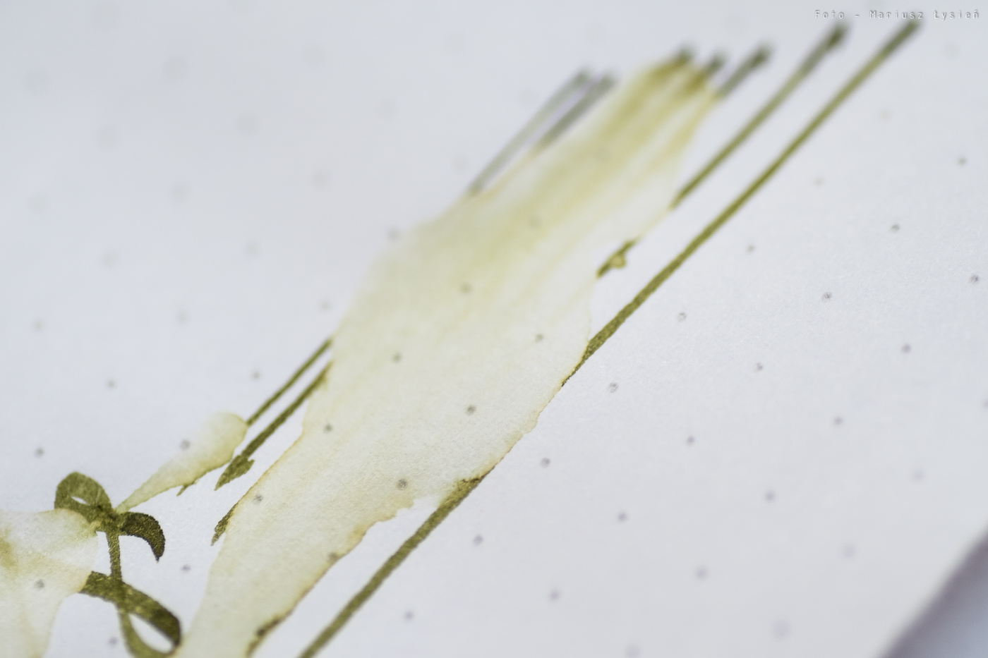 Kolor to ciekawe połączenie barwy żółtej i zielonej. Na pewno jest on na tyle oryginalny, że może się podobać. Na plus można zaliczyć bardzo dobre cieniowanie – po „kleksie” widać zresztą jak duża jest paleta możliwości tego atramentu. Zależy ona oczywiście od sposobu i ilości w jaki używana przez nas stalówka podaje atrament.