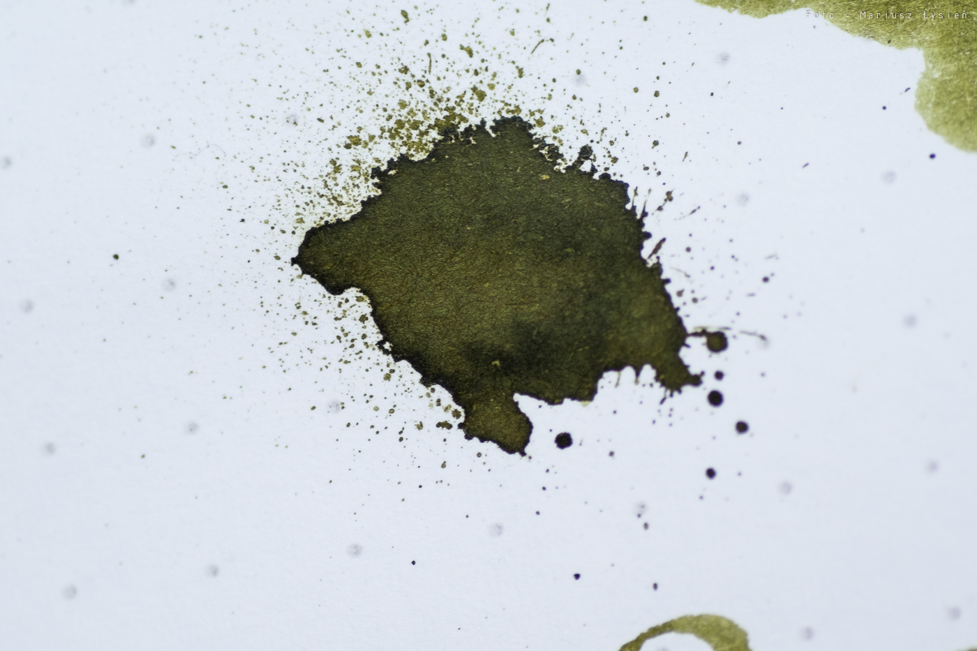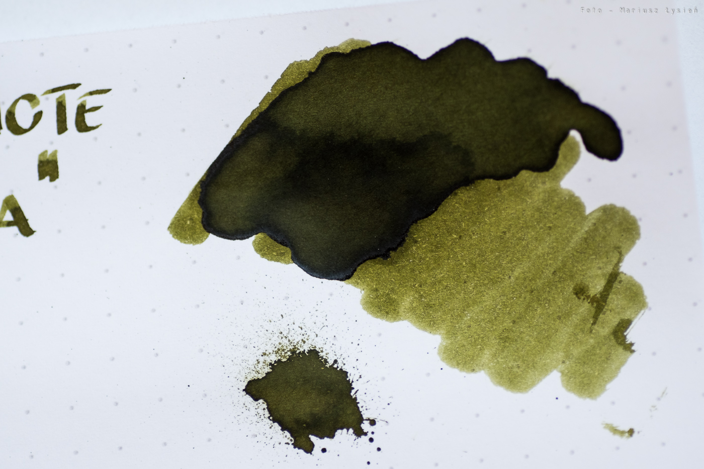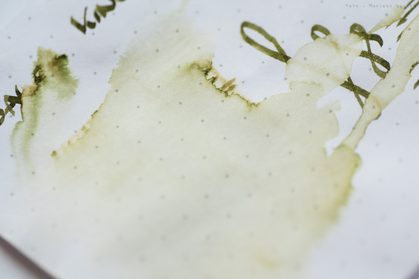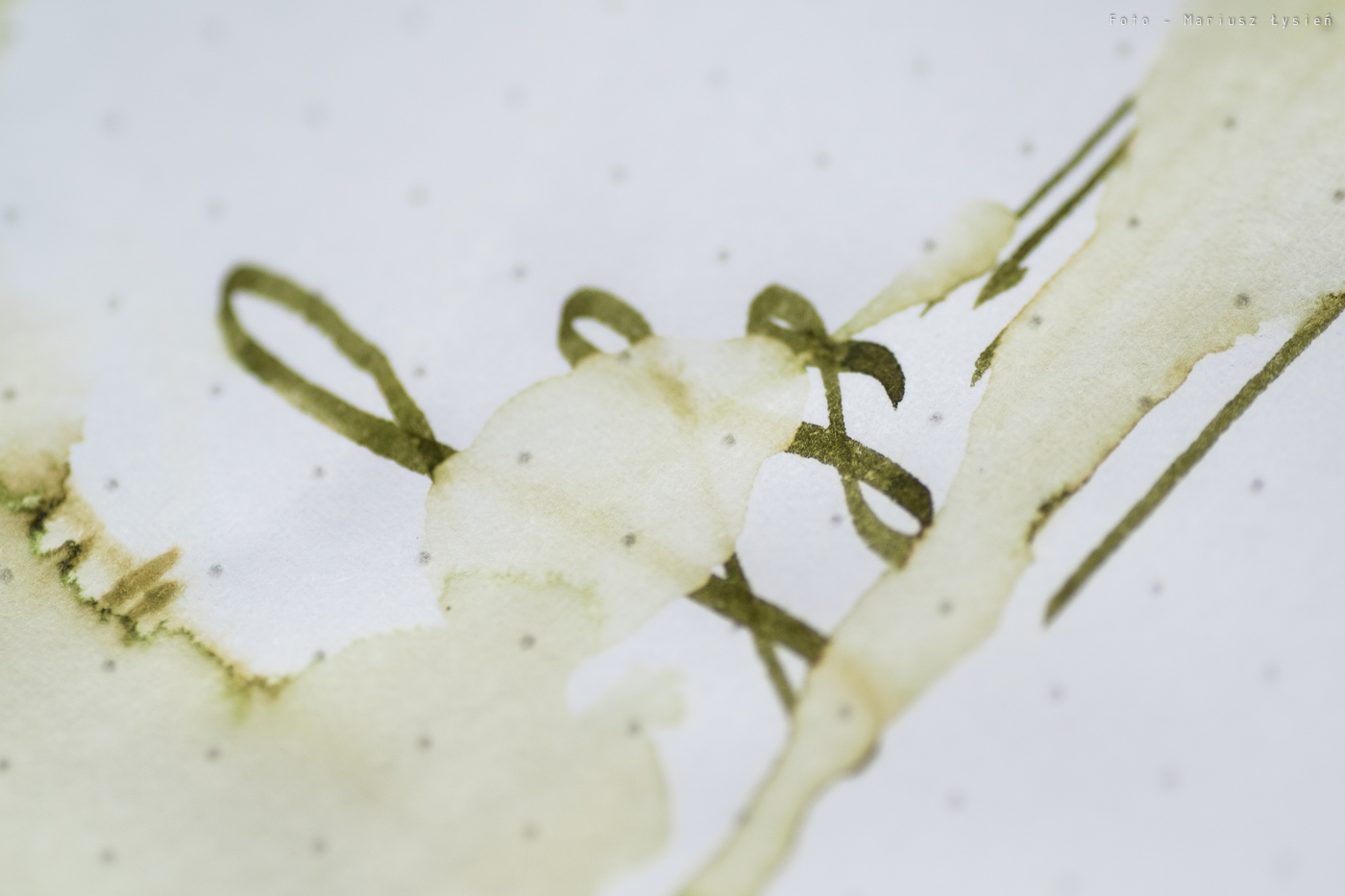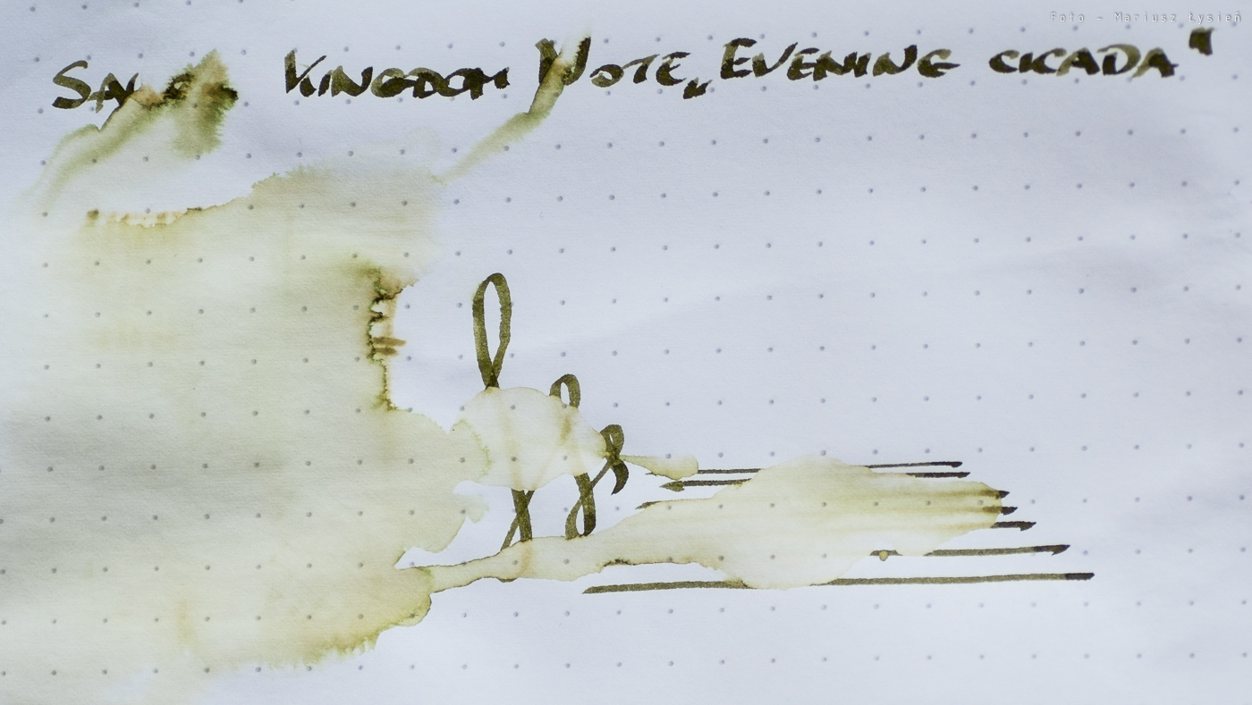 Kolor to ciekawe połączenie barwy żółtej i zielonej. Na pewno jest on na tyle oryginalny, że może się podobać. Na plus można zaliczyć bardzo dobre cieniowanie – po „kleksie” widać zresztą jak duża jest paleta możliwości tego atramentu. Zależy ona oczywiście od sposobu i ilości w jaki używana przez nas stalówka podaje atrament.