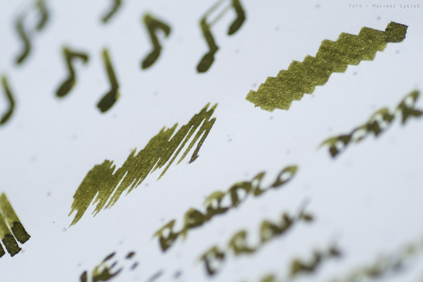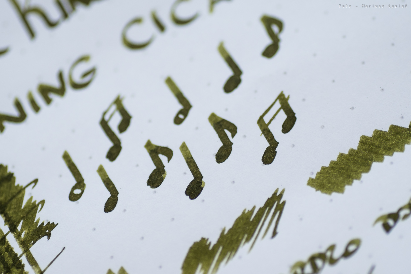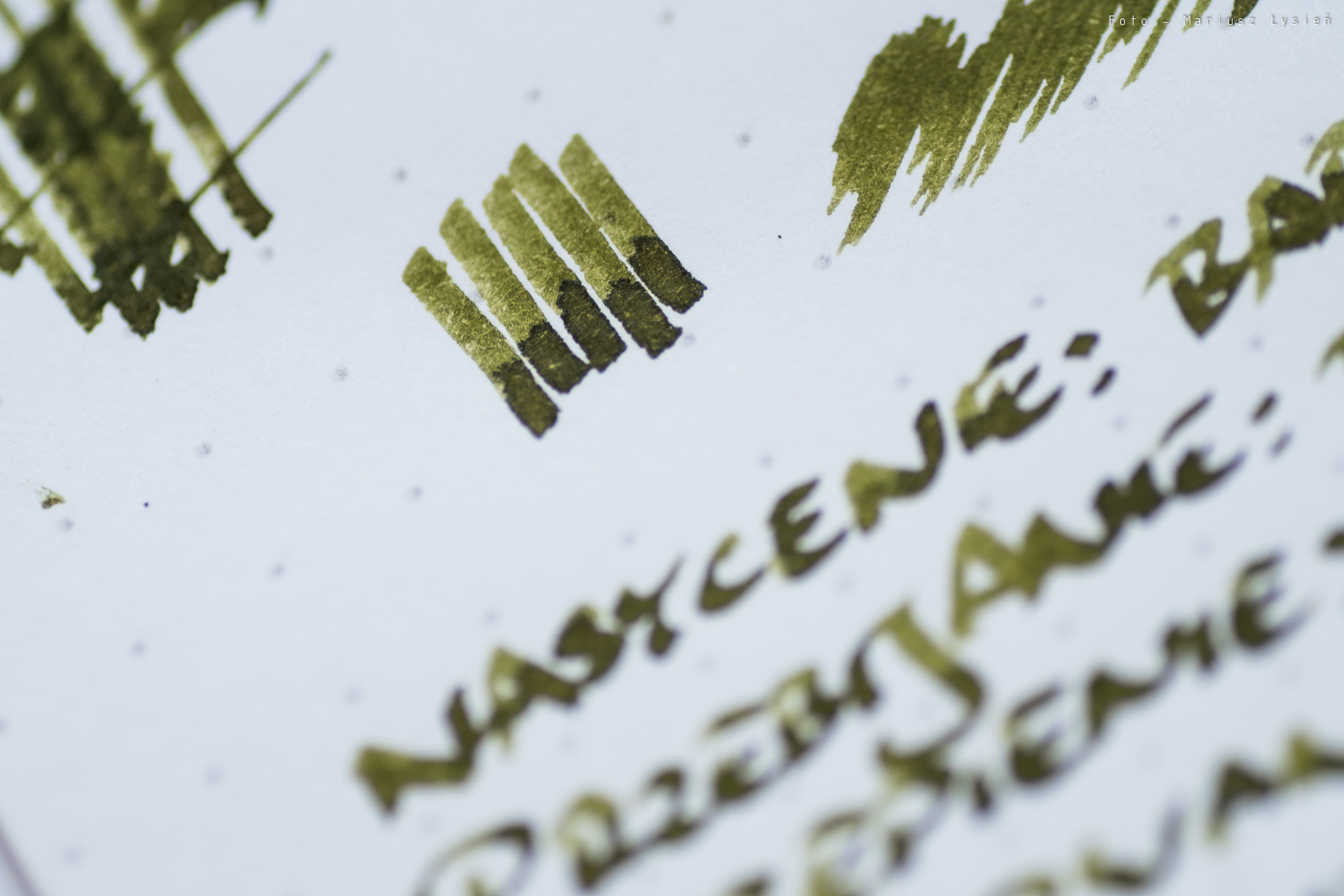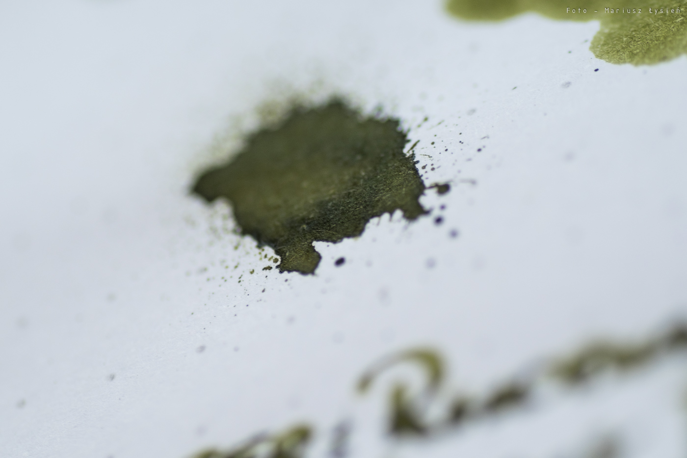Kolor to ciekawe połączenie barwy żółtej i zielonej. Na pewno jest on na tyle oryginalny, że może się podobać. Na plus można zaliczyć bardzo dobre cieniowanie – po „kleksie” widać zresztą jak duża jest paleta możliwości tego atramentu. Zależy ona oczywiście od sposobu i ilości w jaki używana przez nas stalówka podaje atrament.