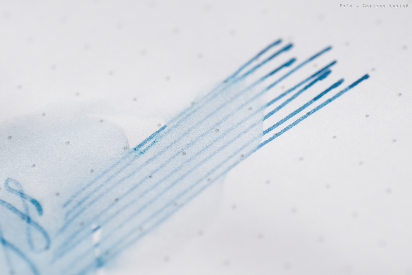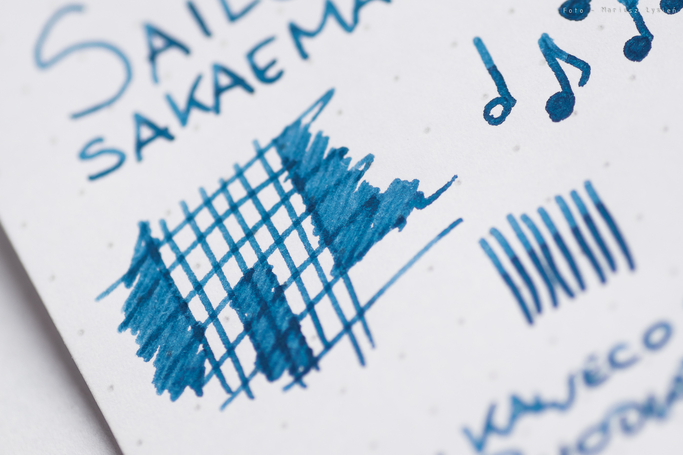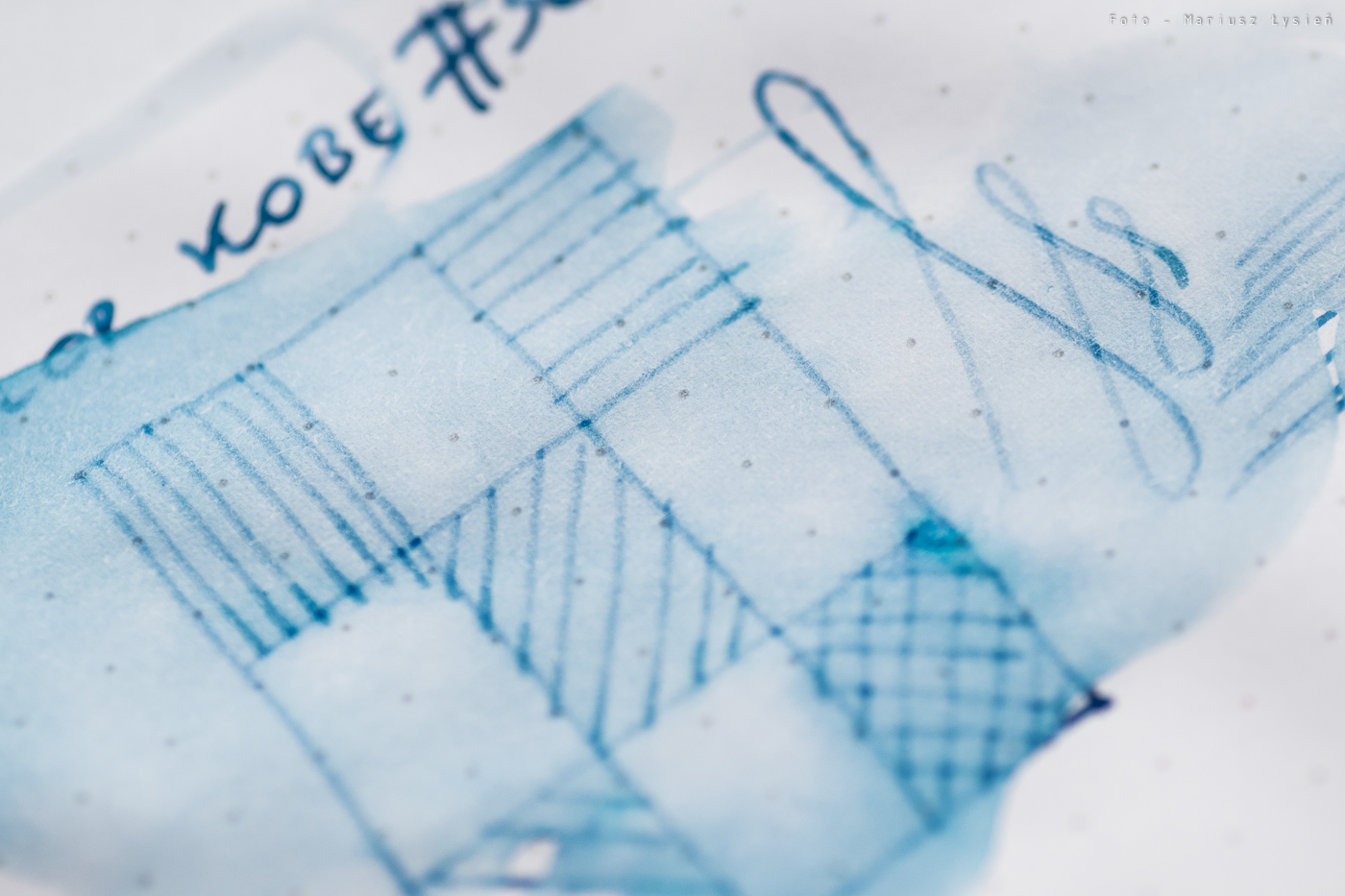 Nie strzępi i nie przebija (nawet kleks z solidną porcją cieczy przebił bardzo wybiórczo i delikatnie). Bardzo dobry przepływ to standard dla atramentów firmy Sailor i tak też jest w tym przypadku. Podobnie ma się sprawa z szybkim wysychaniem.