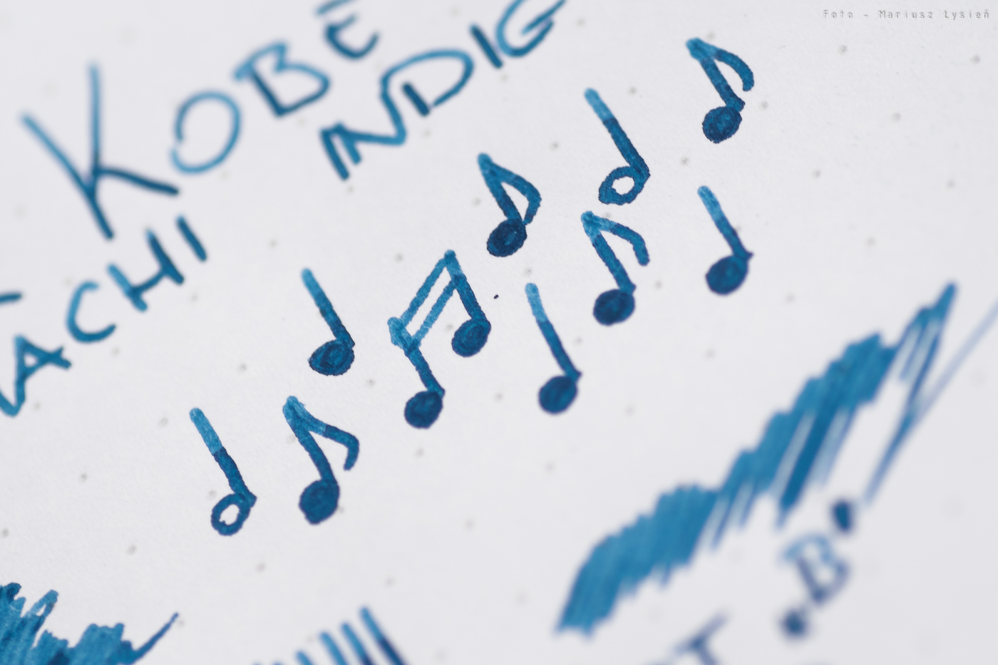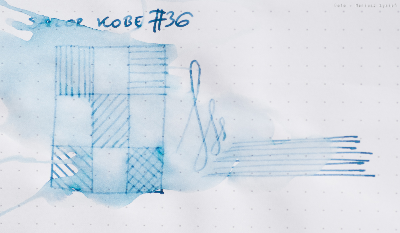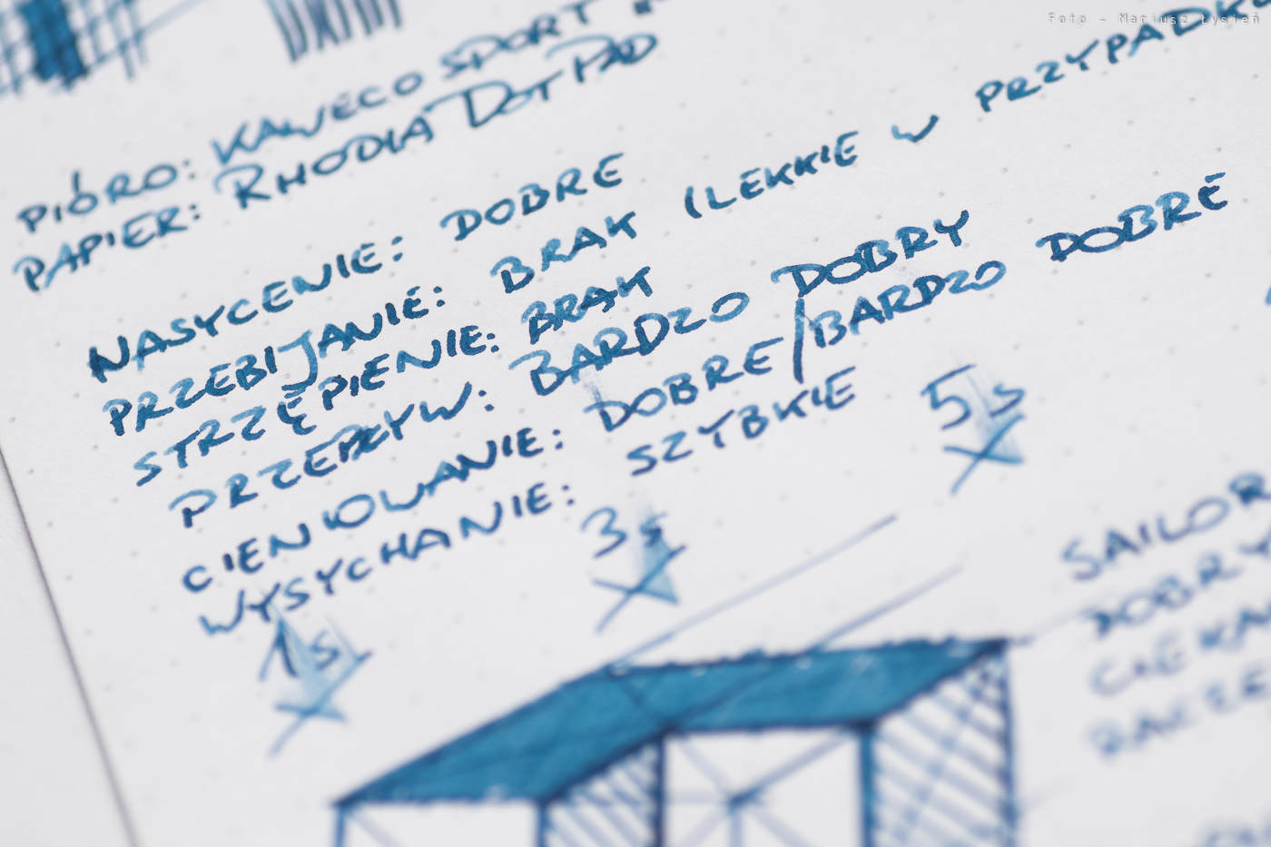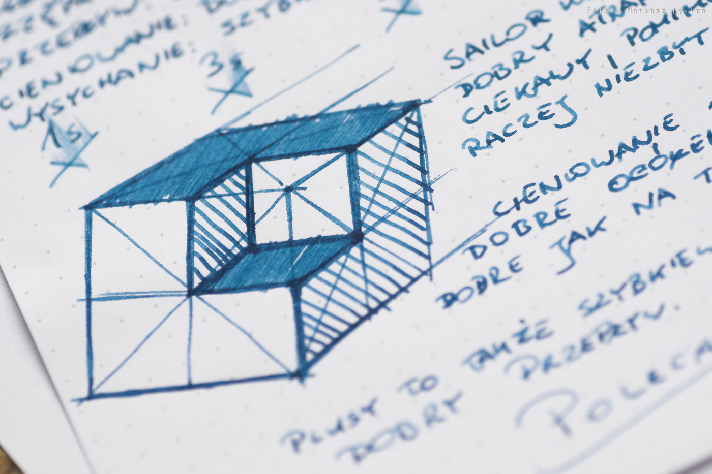 Nie strzępi i nie przebija (nawet kleks z solidną porcją cieczy przebił bardzo wybiórczo i delikatnie). Bardzo dobry przepływ to standard dla atramentów firmy Sailor i tak też jest w tym przypadku. Podobnie ma się sprawa z szybkim wysychaniem.