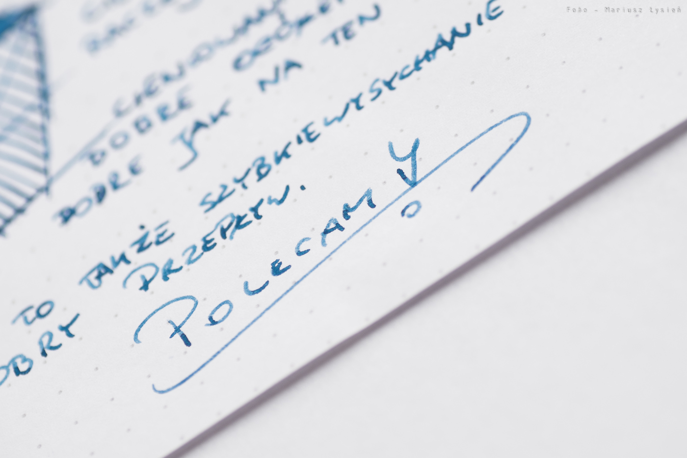 Ciekawy kolor i naprawdę dobre właściwości predysponują ten atrament do polecania go i toteż czynię. Wodoodporność nie jest najlepsza, ale w razie zalania notatek raczej bez trudu uda nam się je odczytać. Polecam zwłaszcza miłośnikom niebieskich atramentów. W innym przypadku – można rozważyć, ale są na rynku moim zdaniem co najmniej równie ciekawe propozycje.