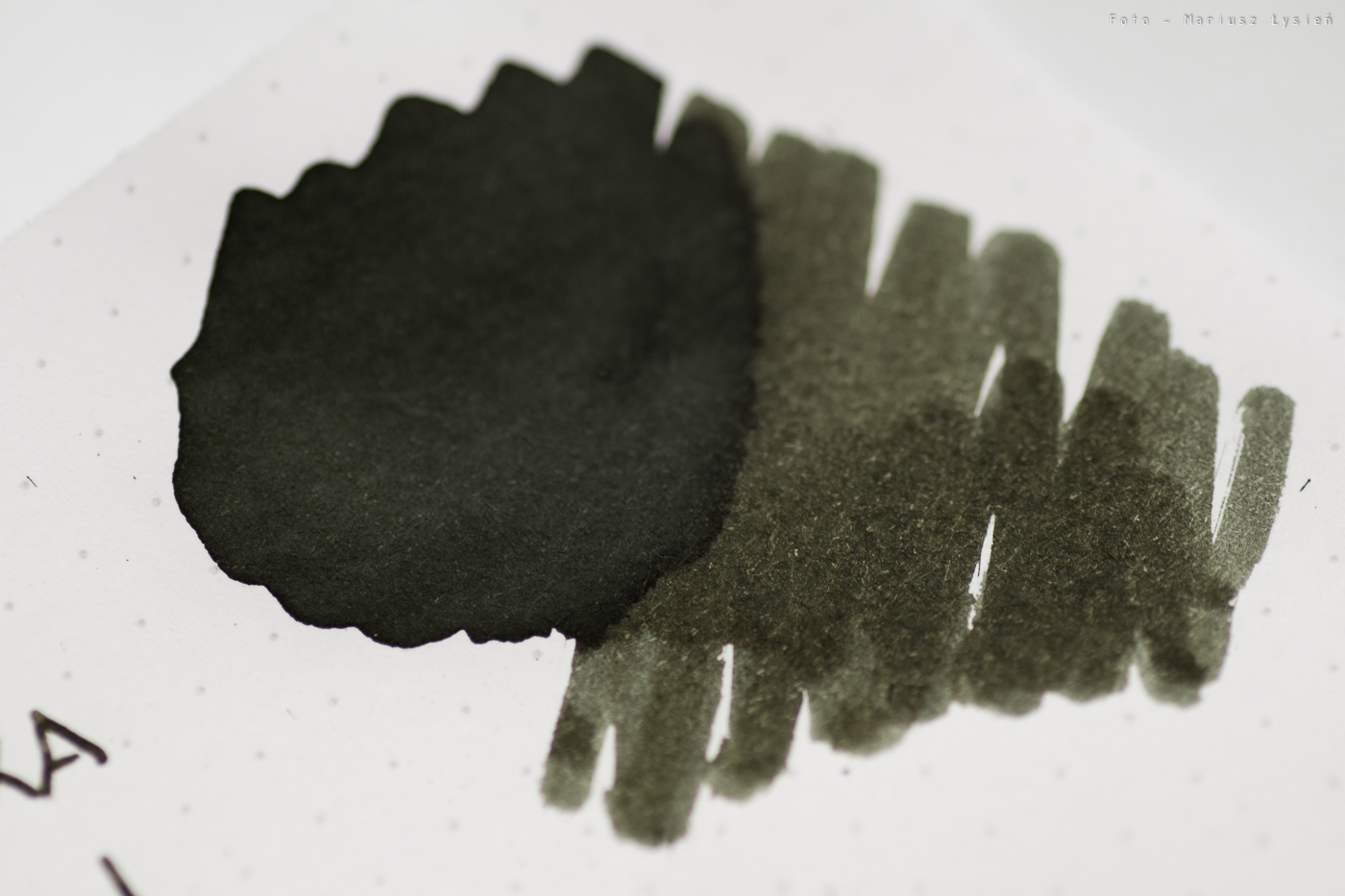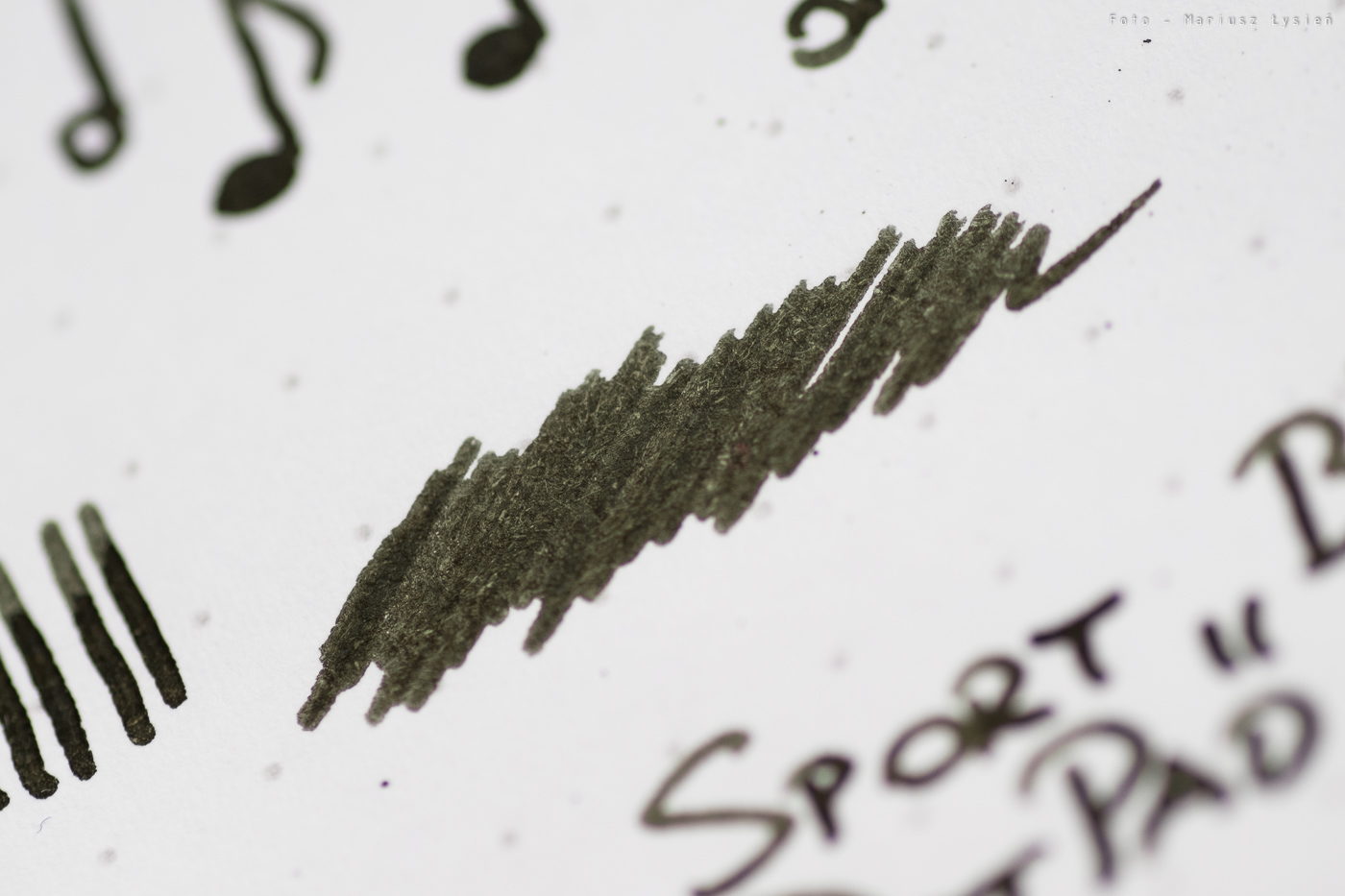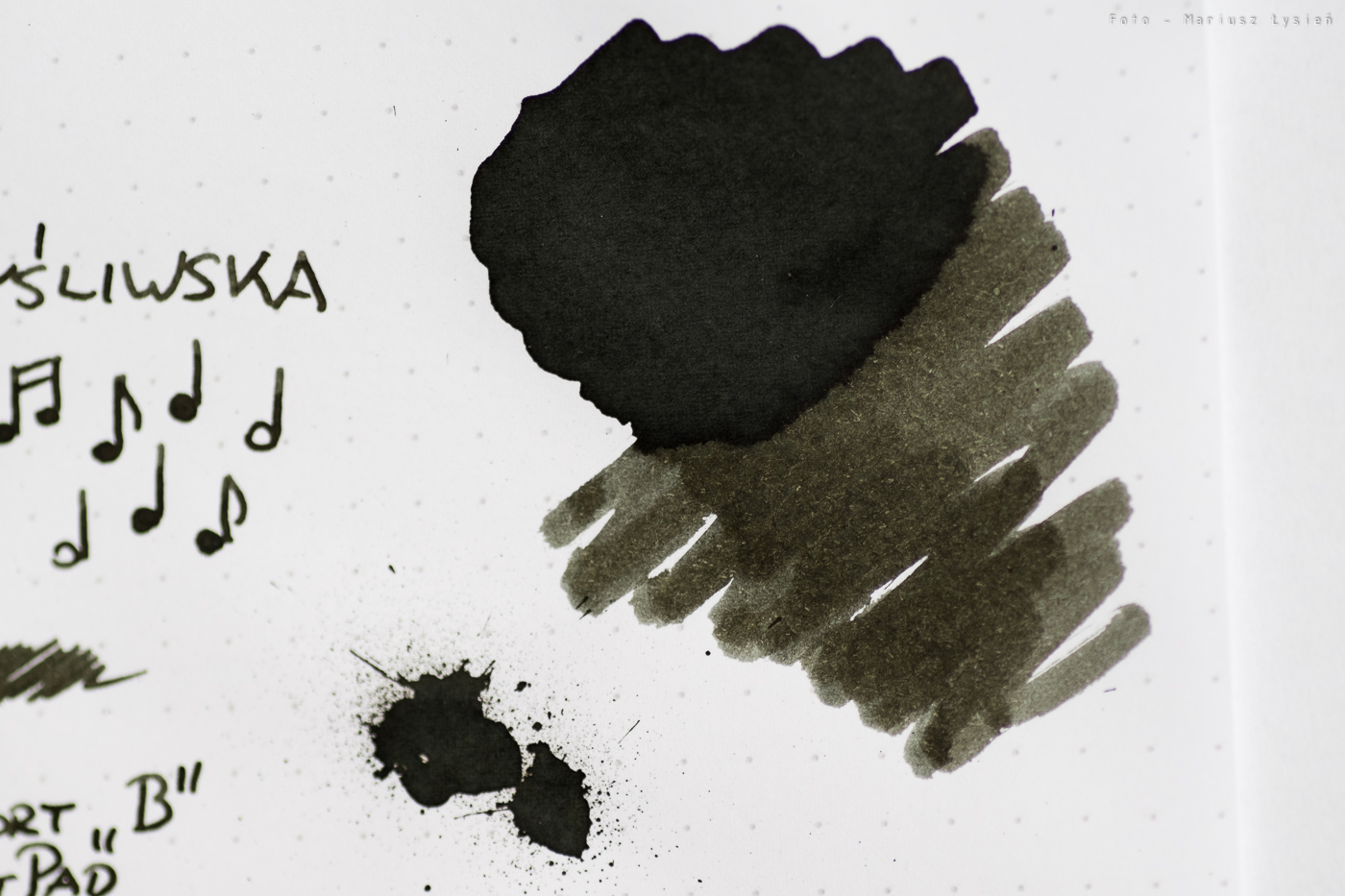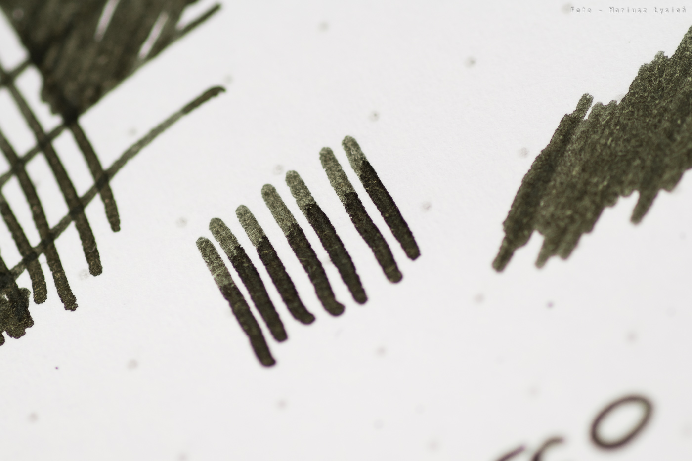 Nie zanotowałem problemów ze strzępieniem czy przebijaniem. Jak na tak ciemny kolor atramentu, to cieniowanie zasługuje na ocenę bardzo dobrą. Z pewnością nie jest ono rekordowe, jednak w przypadku ciemnych atramentów często cieniowanie jest pokrzywdzone z uwagi na brak jaśniejszych partii. W tym przypadku jak wspomniałem – jest całkiem dobrze.