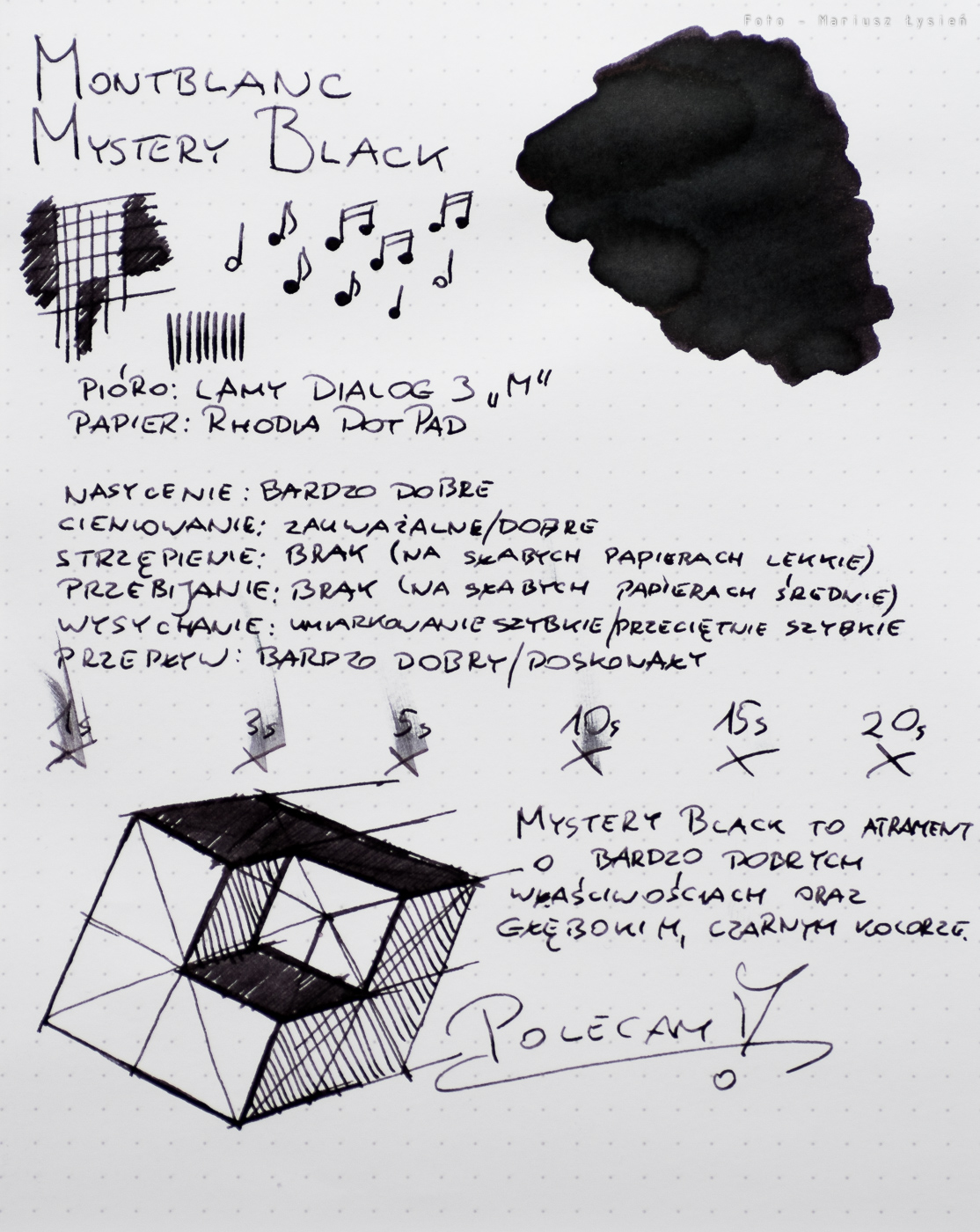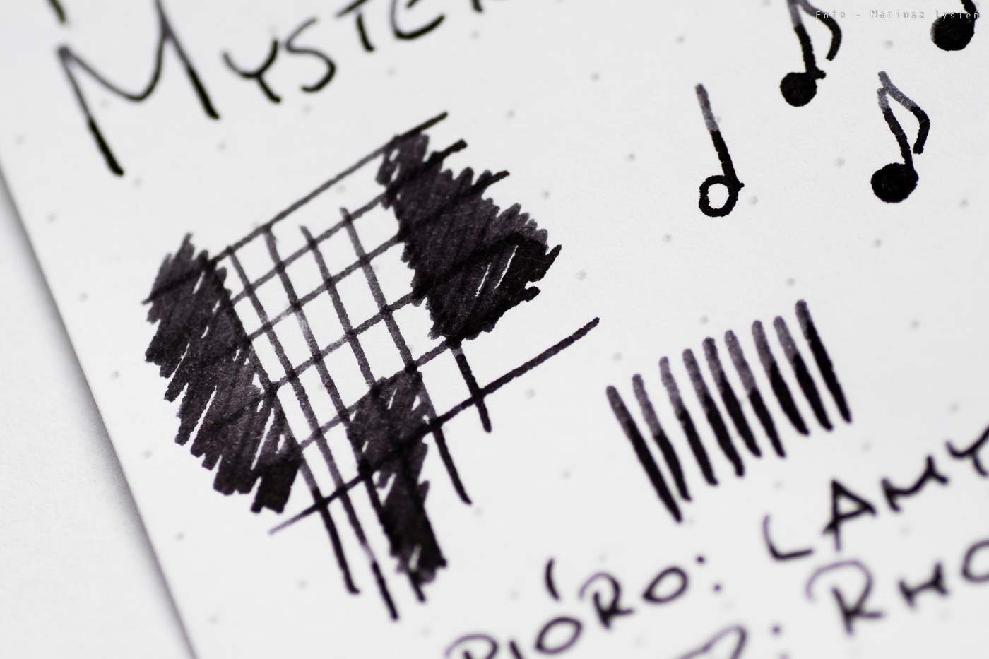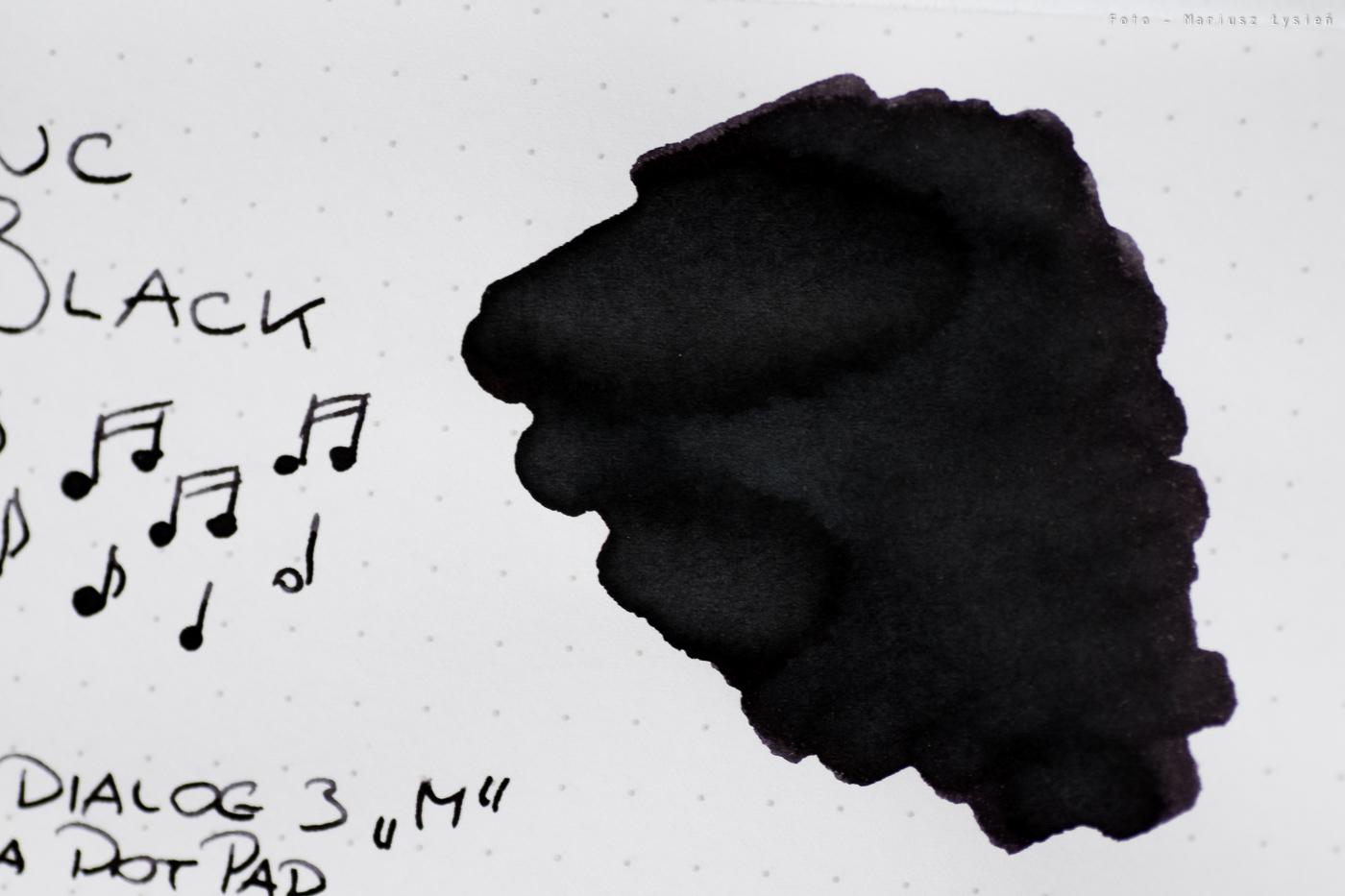Tytułowy atrament uchodzi za jeden z najczarniejszych atramentów na rynku. Faktycznie nasycenie jest bardzo dobre, a sam kolor nie ujawnia śladów domieszek innych barw. Dzięki temu to co ma być czarne, jest takie w rzeczywistości.