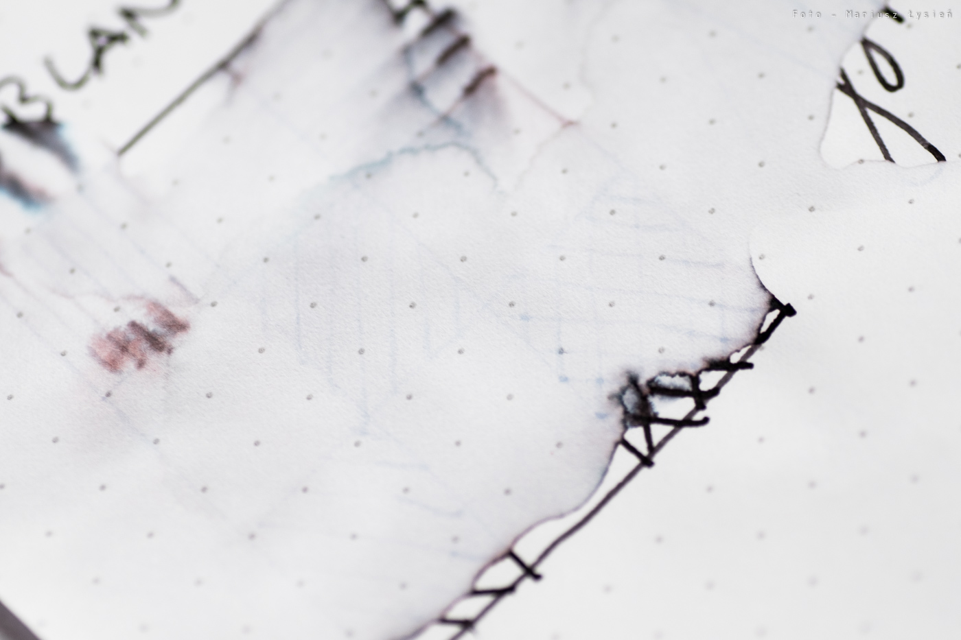 Na papierze notatnika Rhodia DotPad nie zauważyłem problemów ze strzępieniem bądź przebijaniem. Na słabszych podłożach jednak oba te zjawiska są widoczne, chociaż są niezbyt mocne.