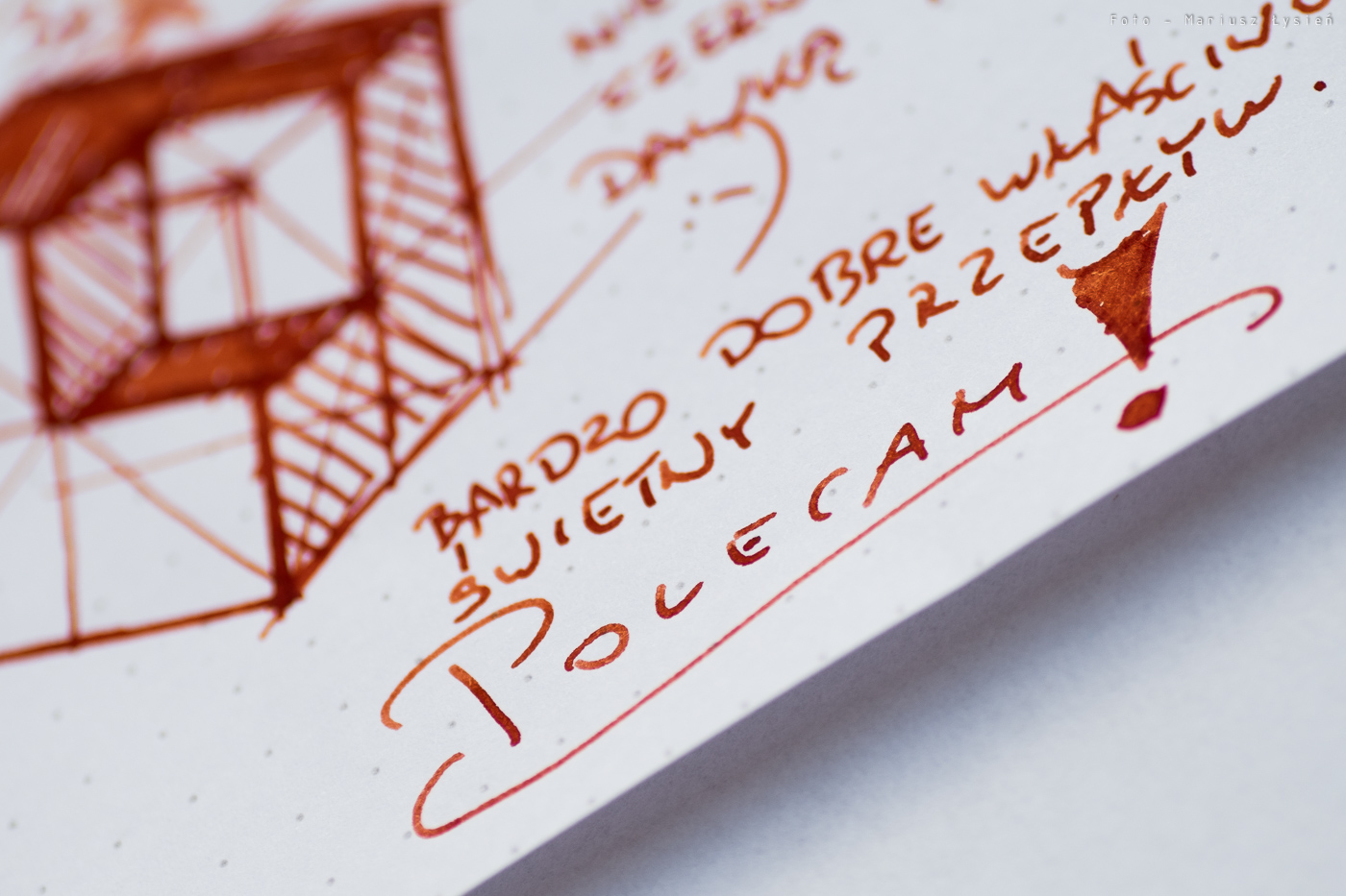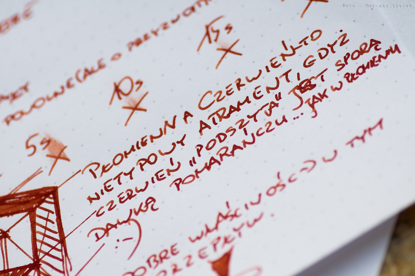 Płomienista Czerwień to atrament o ciekawym kolorze i naprawdę dobrych właściwościach. Zgodnie z tym co napisałem, polecam go nie tylko miłośnikom czerwieni, ale także tym, którzy poszukują nietypowego, dobrze nasyconego i czytelnego atramentu z palety barw pomarańczowych.
