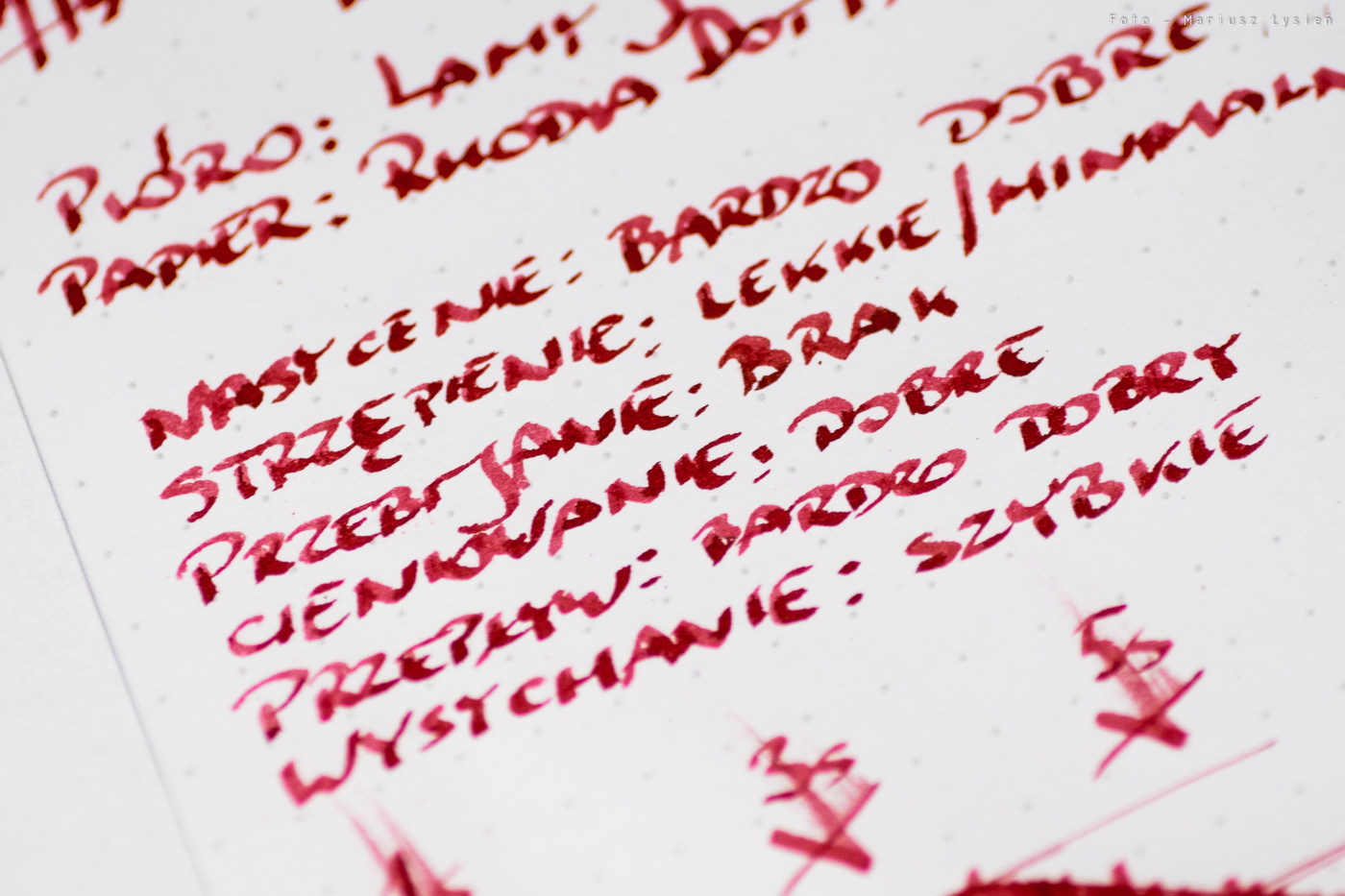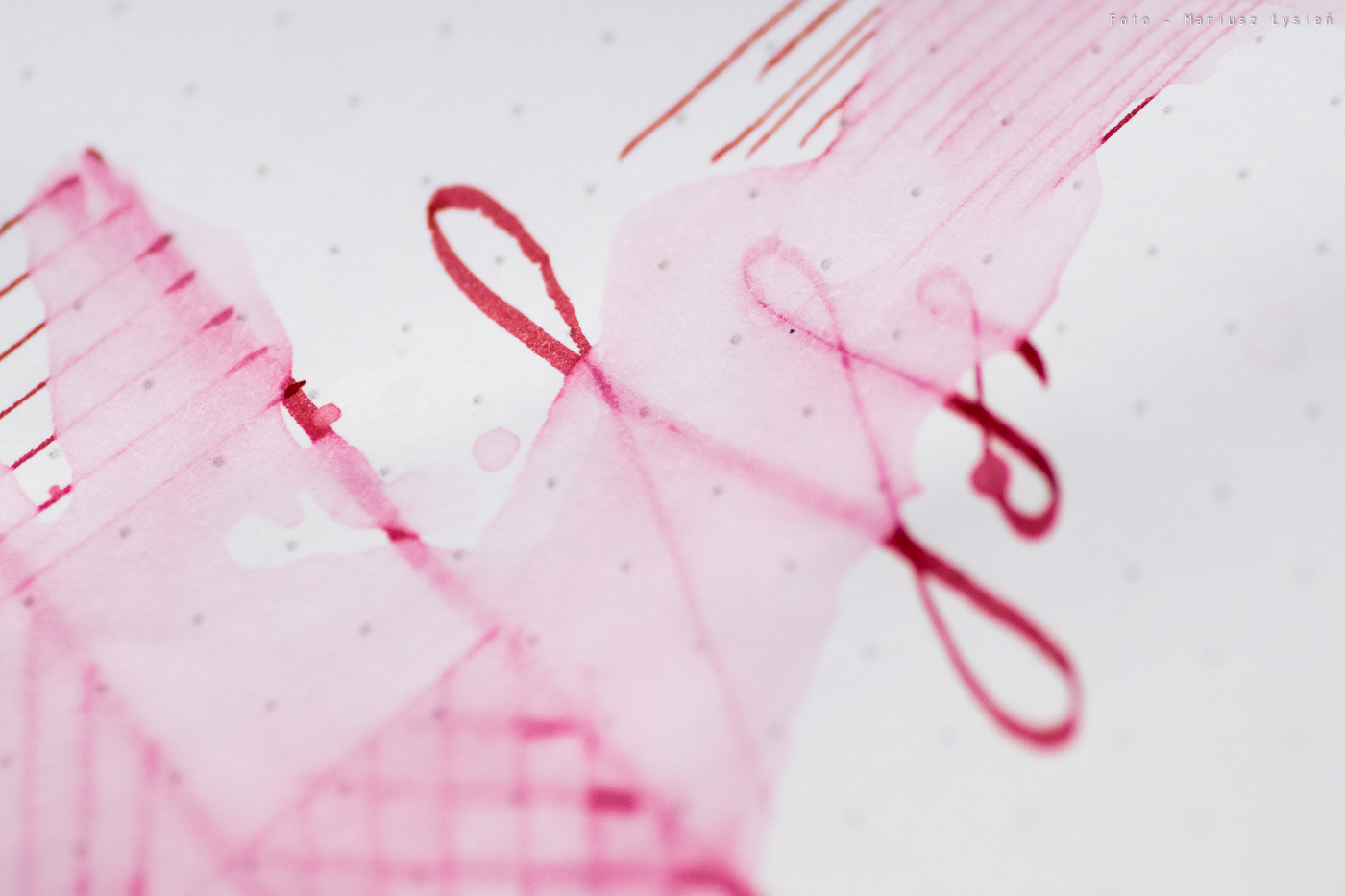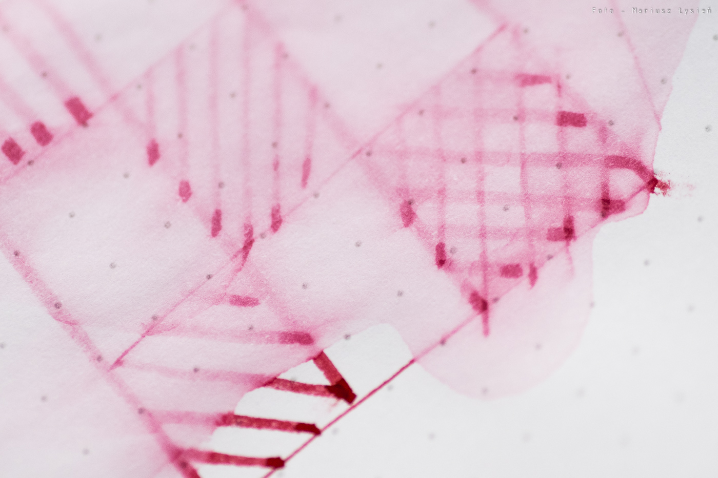 Nie odnotowałem problemów z przebijaniem. Jeżeli chodzi o strzępienie to jest ono niewielkie. Cieniowanie należy uznać za dobre, co i tak jest cechą rzadko spotykaną jeżeli mówimy o czerwonych atramentach.