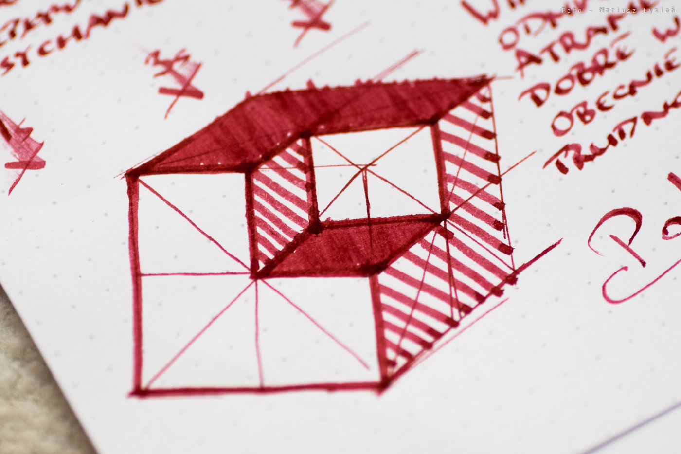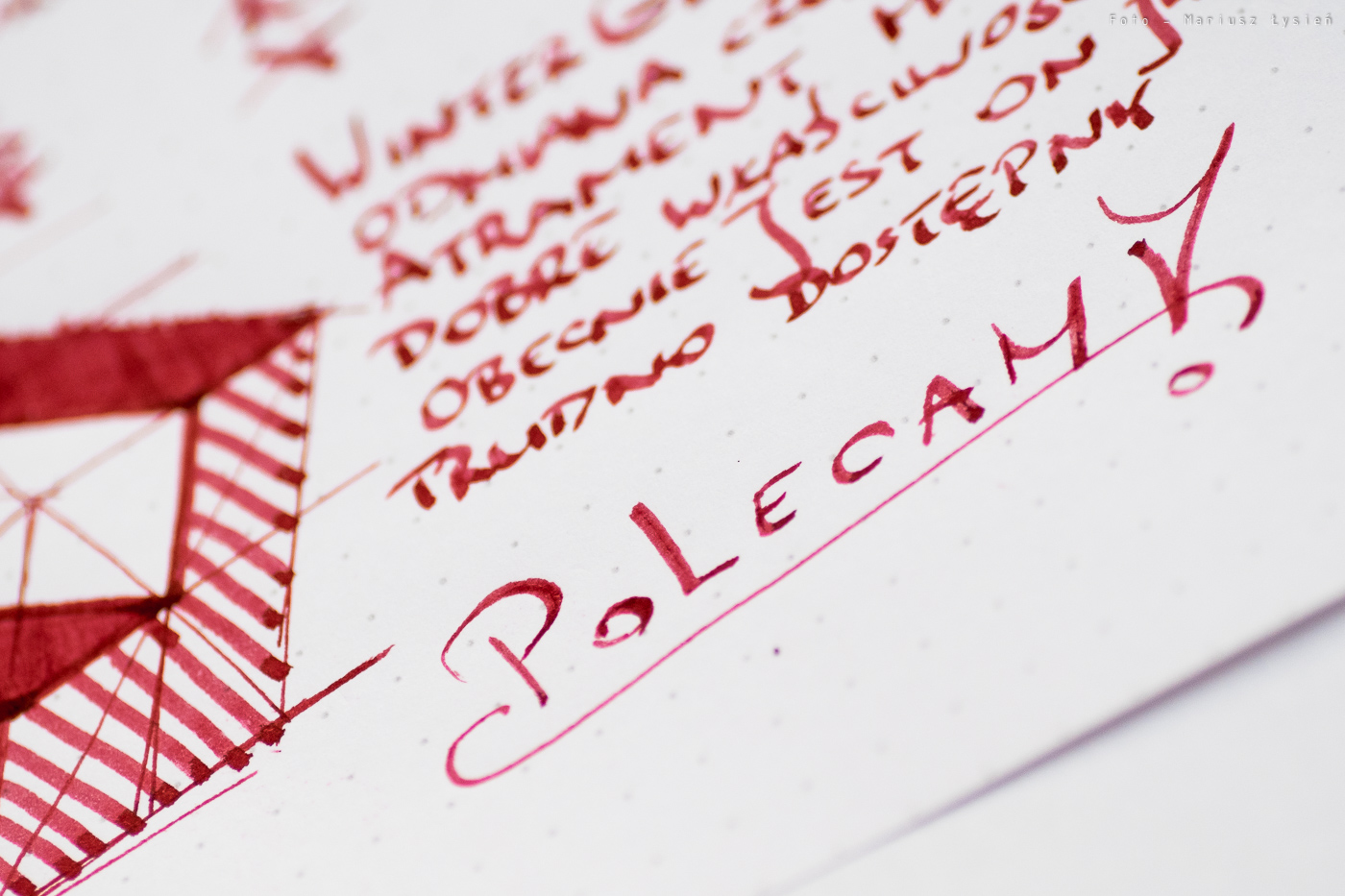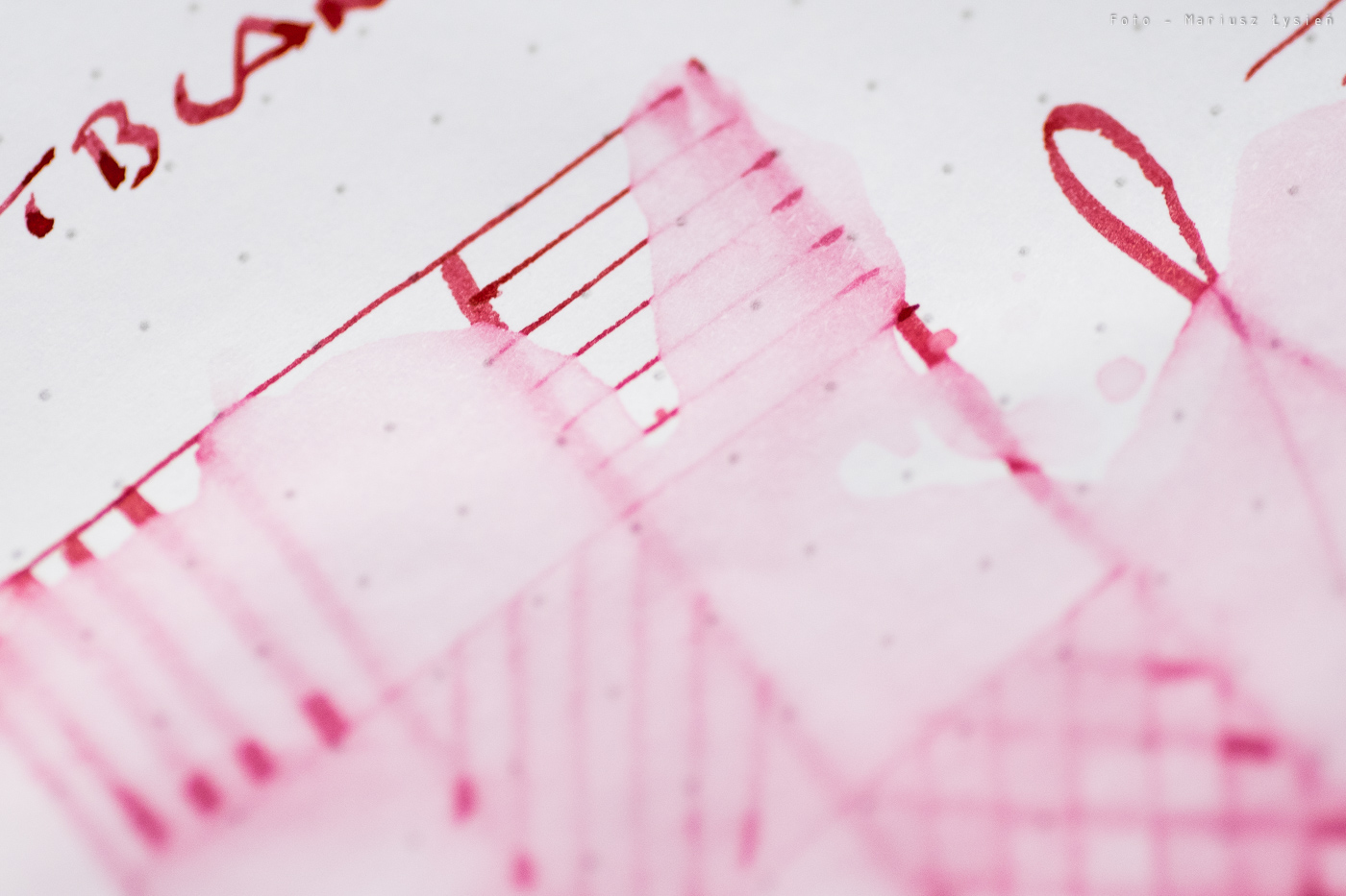 Nie odnotowałem problemów z przebijaniem. Jeżeli chodzi o strzępienie to jest ono niewielkie. Cieniowanie należy uznać za dobre, co i tak jest cechą rzadko spotykaną jeżeli mówimy o czerwonych atramentach.