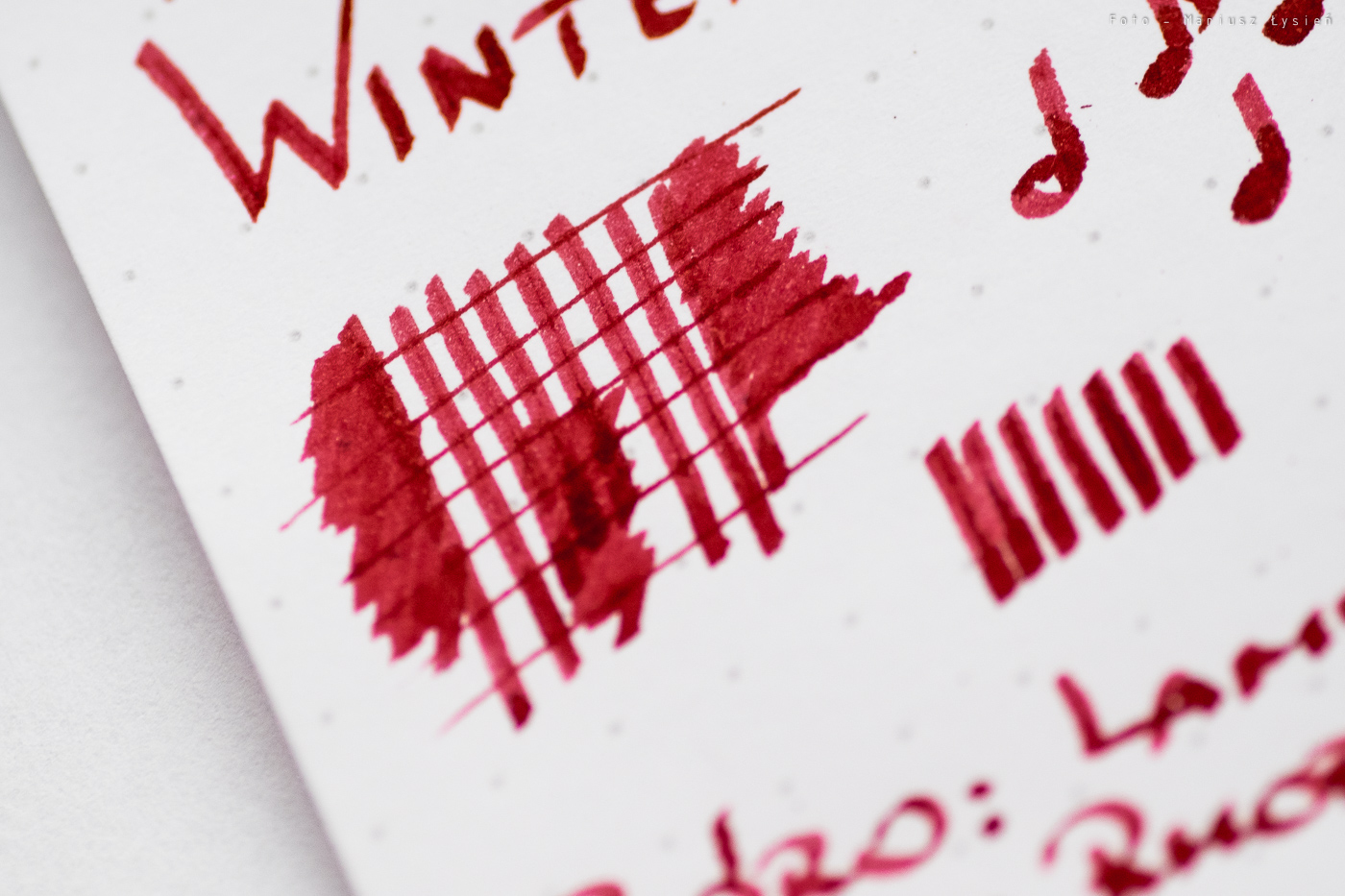 Kolor jest bardzo dobrze nasycony. Nie jest to jednak typowa, czysta czerwień, którą mogliśmy obserwować w przypadku testowanego już na łamach Zegarki i Pióra koloru Corn Poppy Red. Winter Glow przełamuje się bardziej w stronę różu, który ma też w sobie odrobinę fioletu.