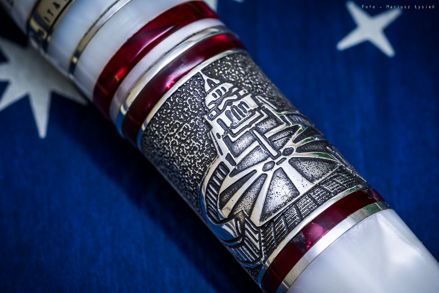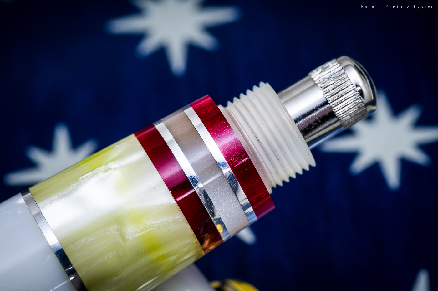 Samo pióro również mocno przykuwa wzrok. Zostało ono wykonane z żywicy. Wielobarwna kolorystyka utrzymana została jednak w tonacji bieli i ecru. Całość przełamują wstawki w kolorze bordowym (wręcz rubinowym), które doskonale ożywiają całą kompozycję.