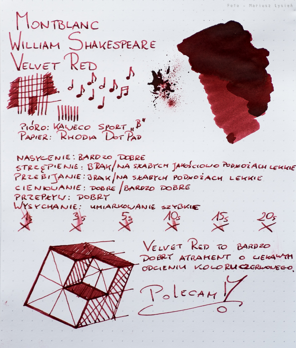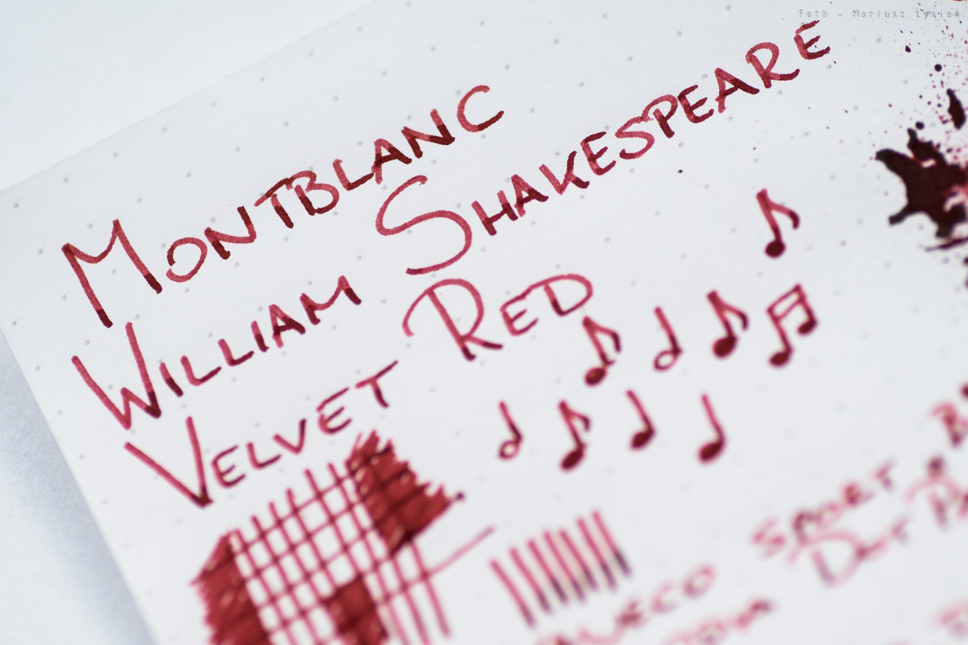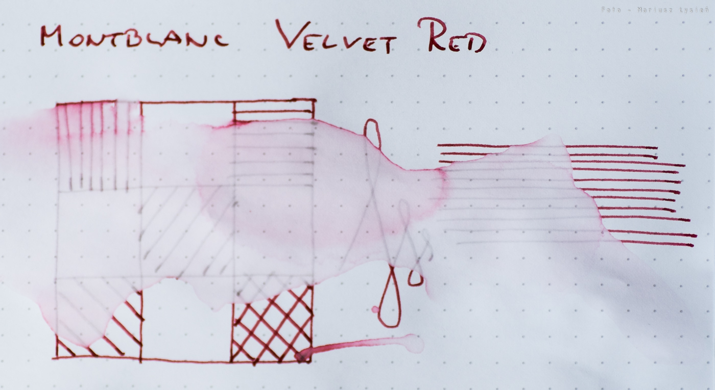 Inspiracja barwna jest w tym przypadku oczywista. Velvet Red, czyli „czerwień aksamitu” ma symbolizować materiał, z którego wykonana jest kurtyna w zdecydowanej większości teatrów. Nie jest to jednak czysta czerwień jak w Corn Poppy Red. W najnowszym atramencie jest więcej burgundu, a sama czerwień ma nieco mniejszą saturację. Kolor jest intrygujący i elegancki zarazem. W mojej ocenie jest znacznie ciekawszy niż Winter Glow. Nasycenie jest moim zdaniem bardzo dobre.
